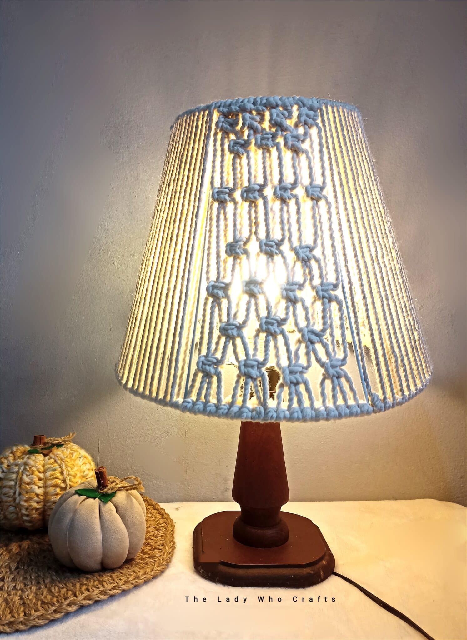 Elegant macrame disk / side table lamp shade with wooden base , and on/of button and wire ..
