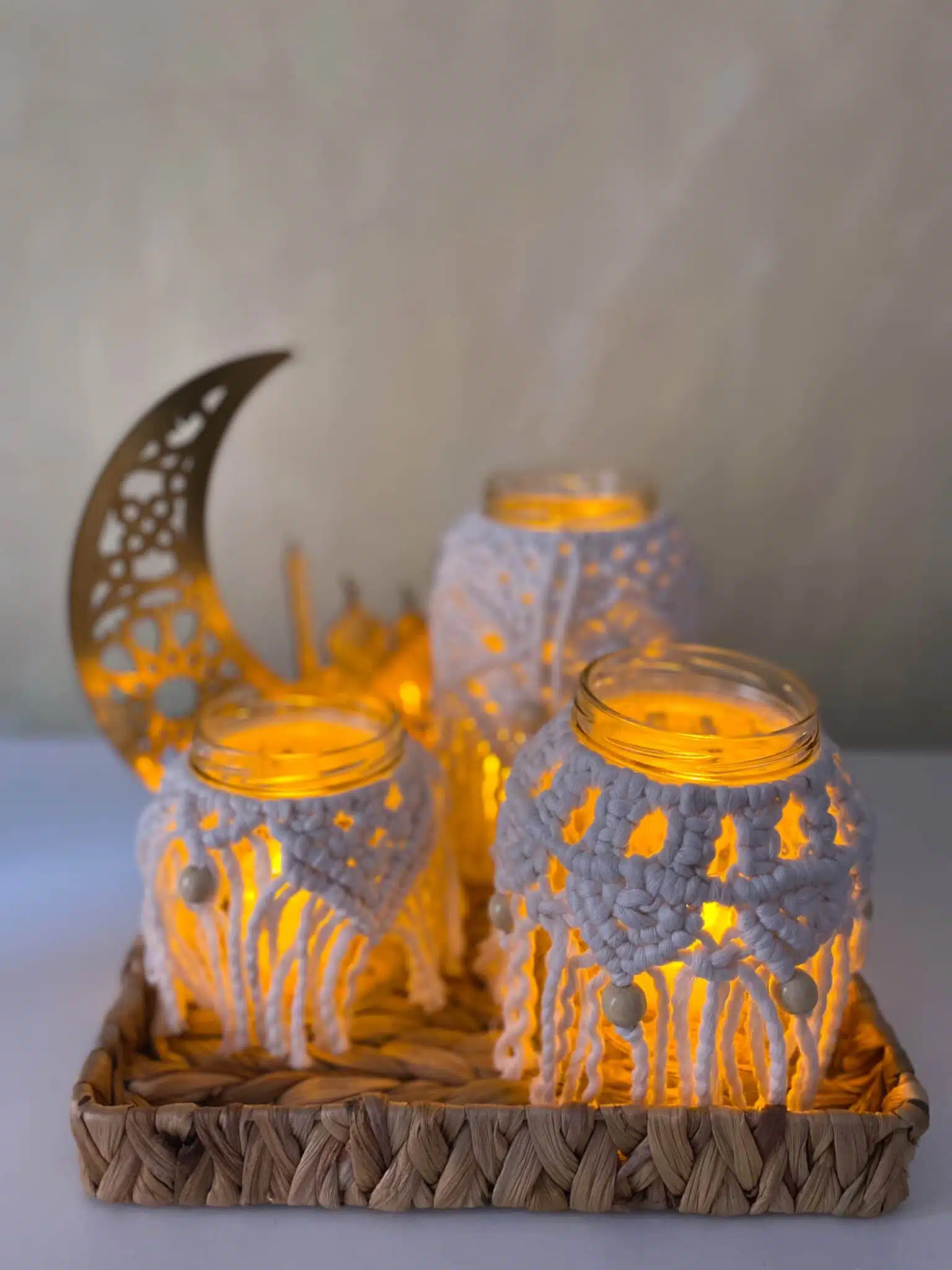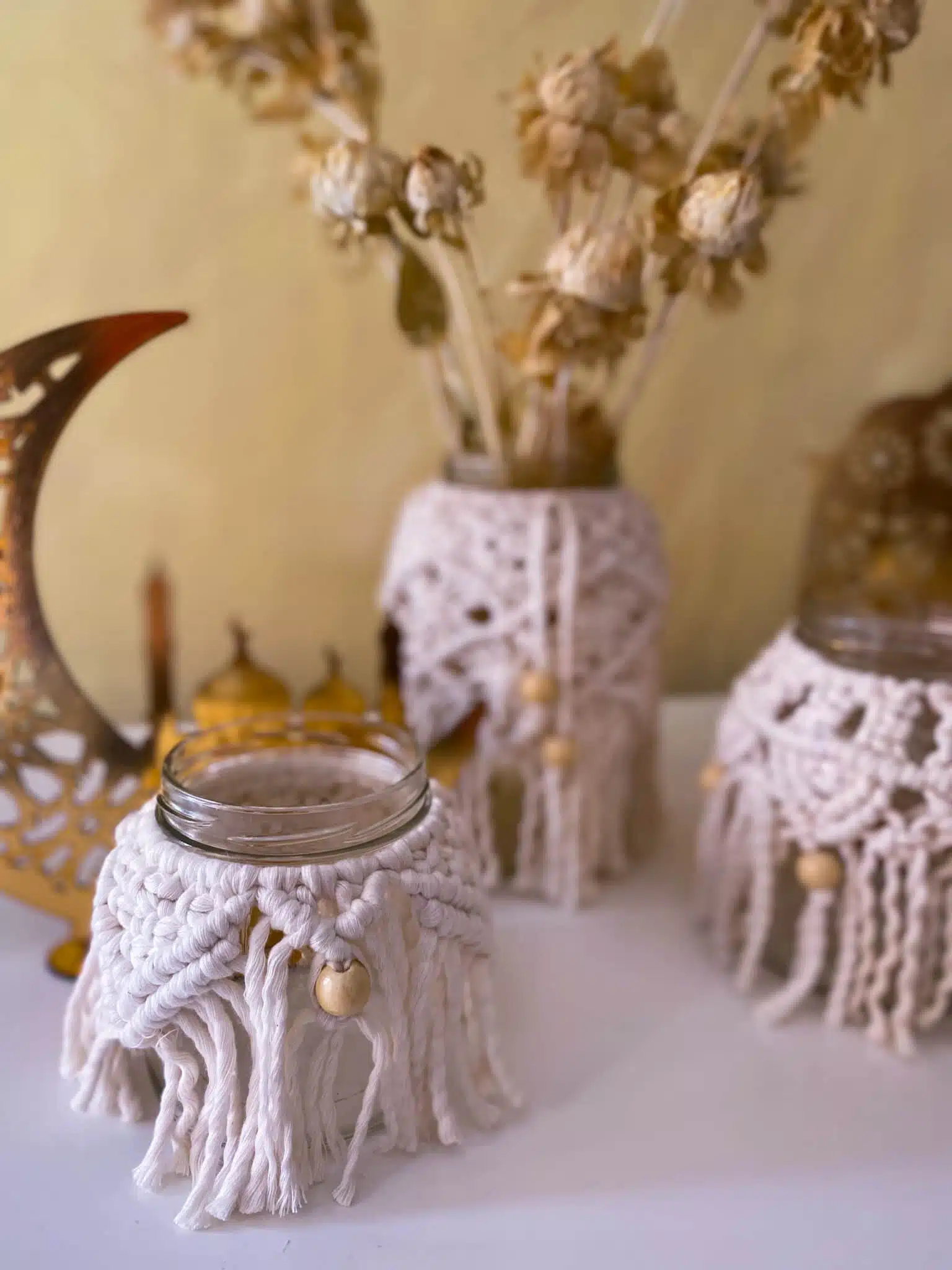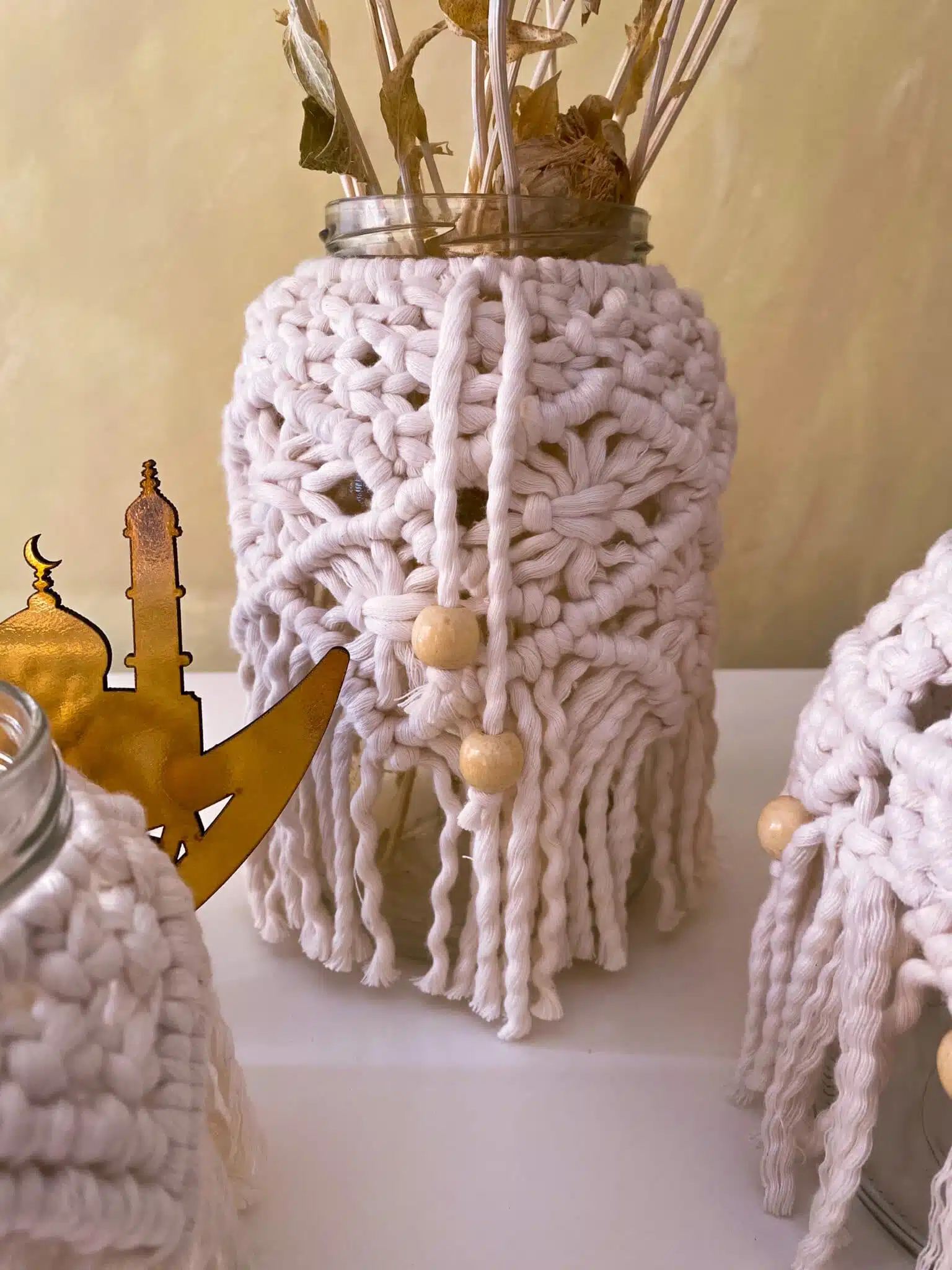 An addition to the home decor, beautiful macrame vase can be used both as flower vase and candle jar at night. Perfect for the wedding decor.and also can be perfect storage for ramadan’s nuts
