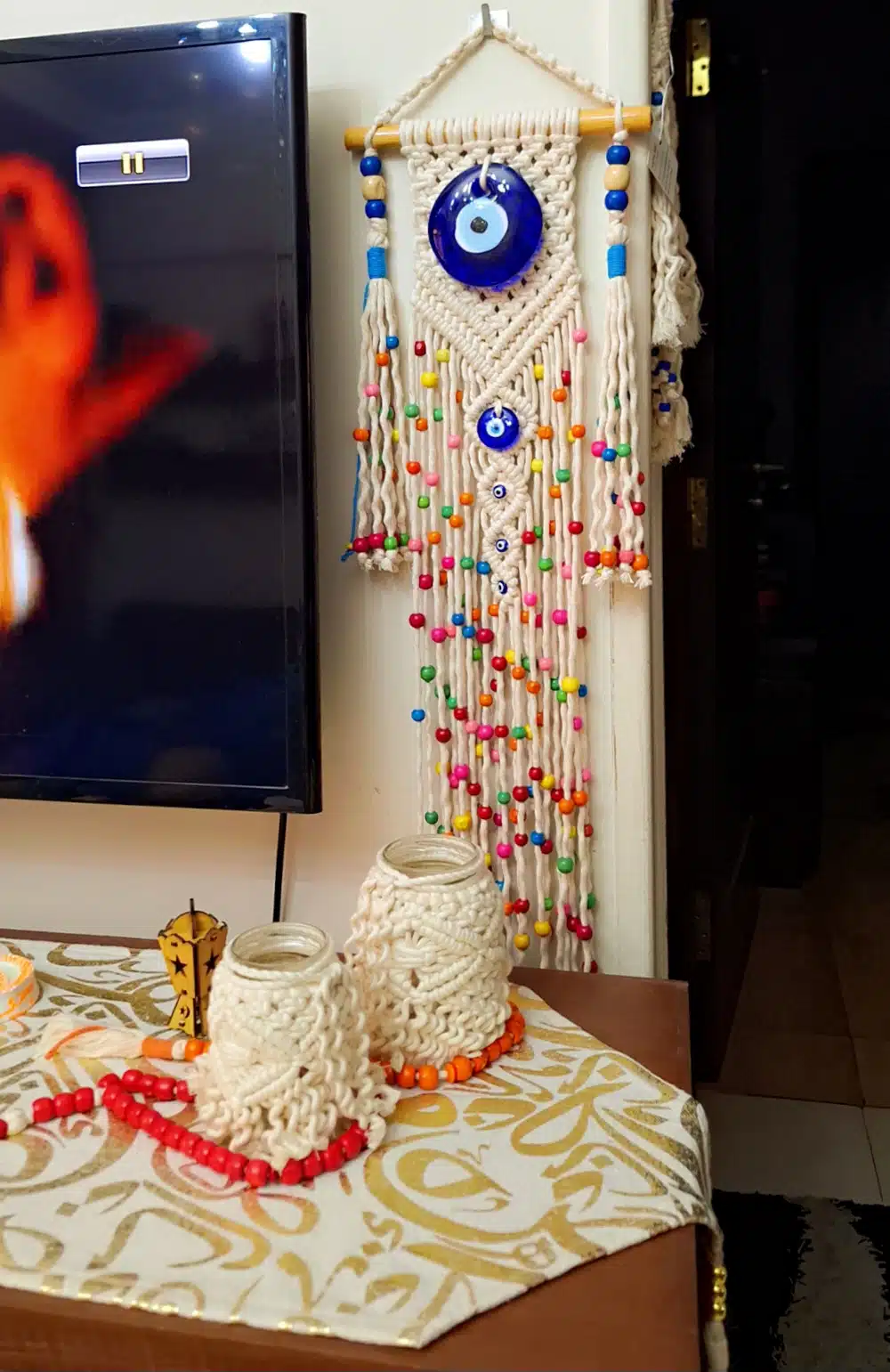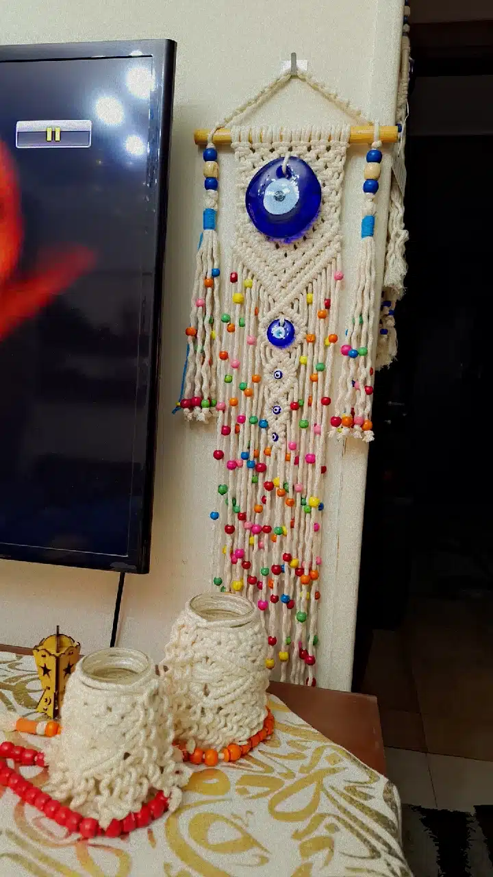 مكرميه مصنوعة يدويًا من خيوط القطن والعيون الزجاج بتصميم فريد ومبتكر