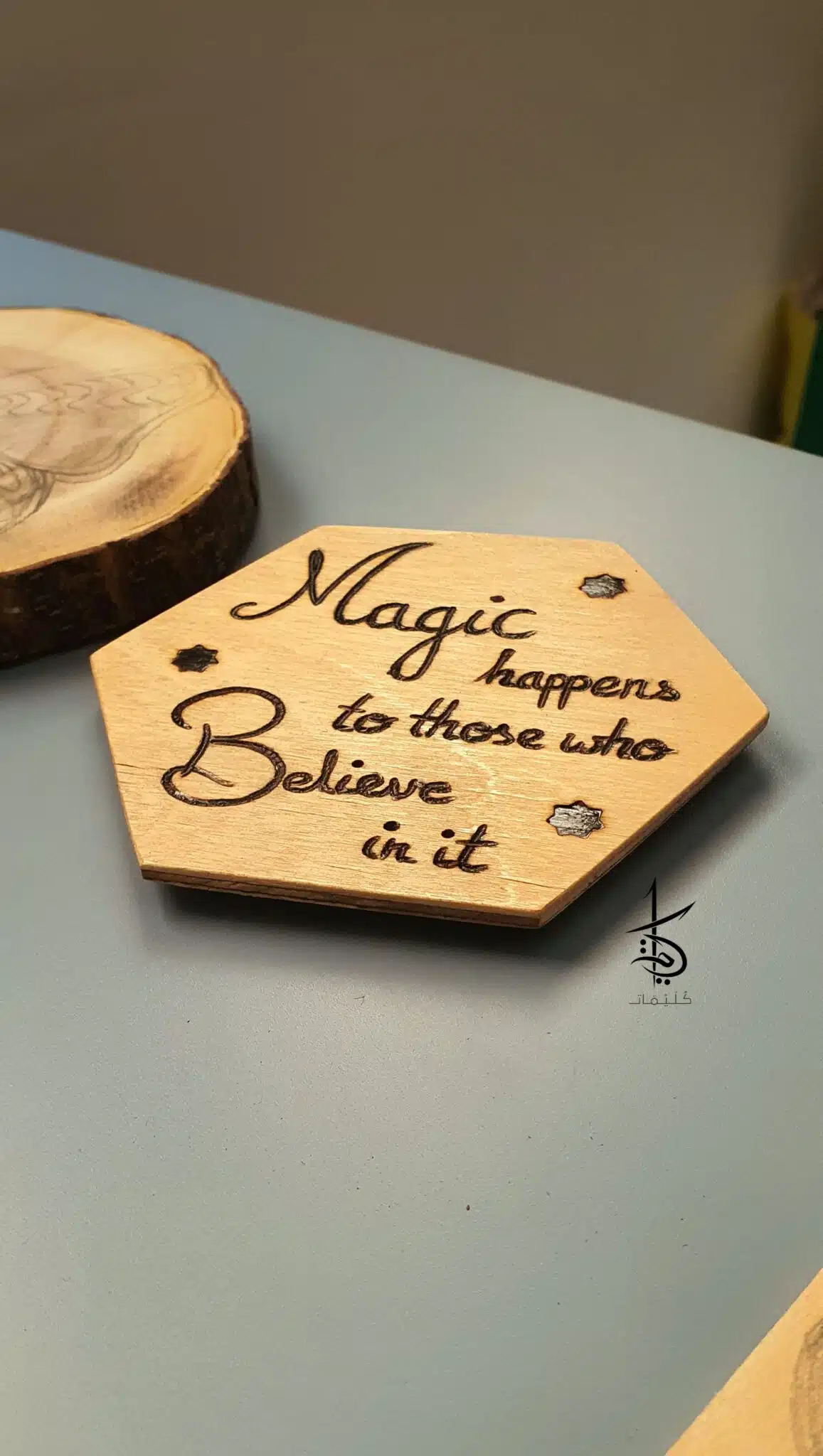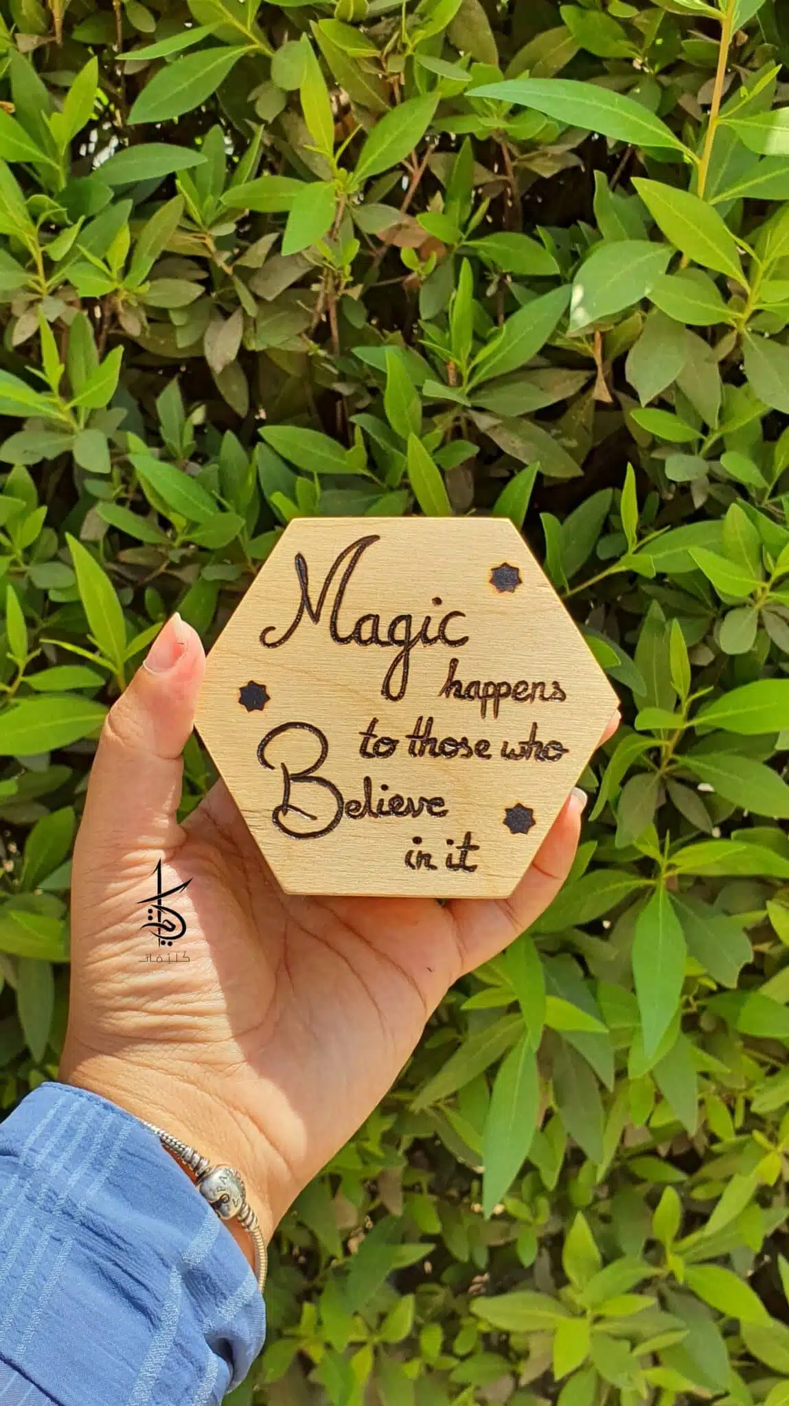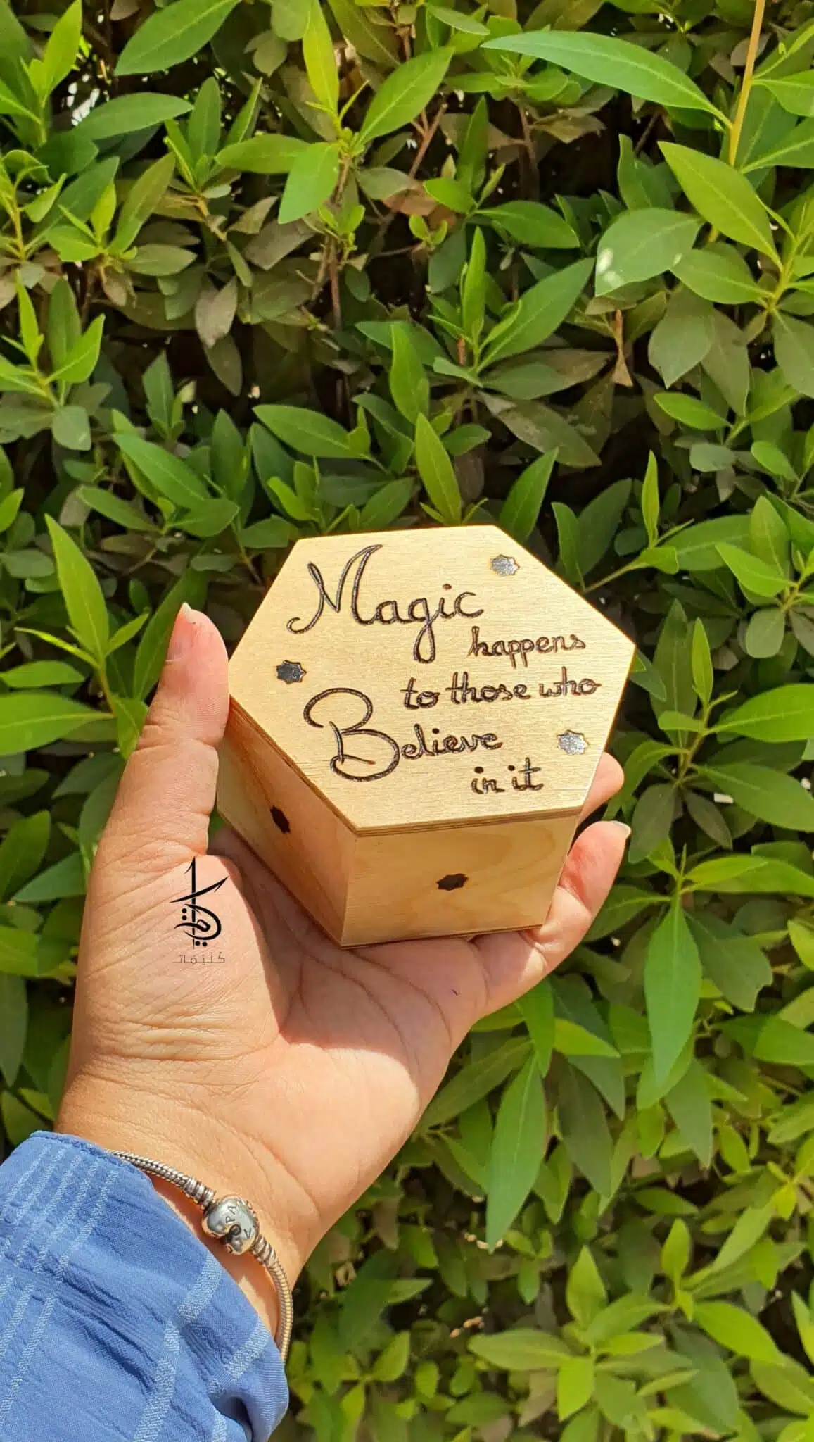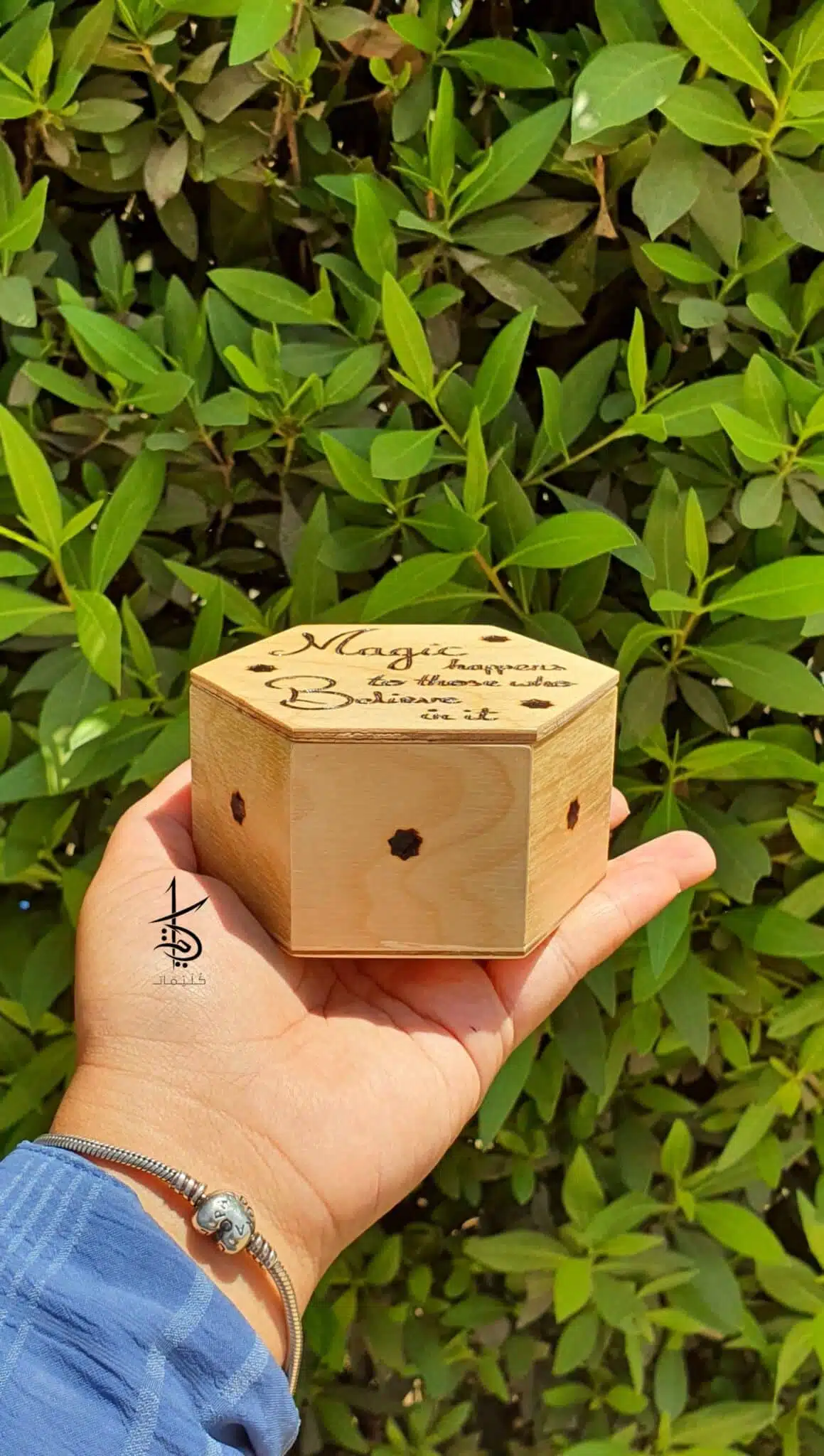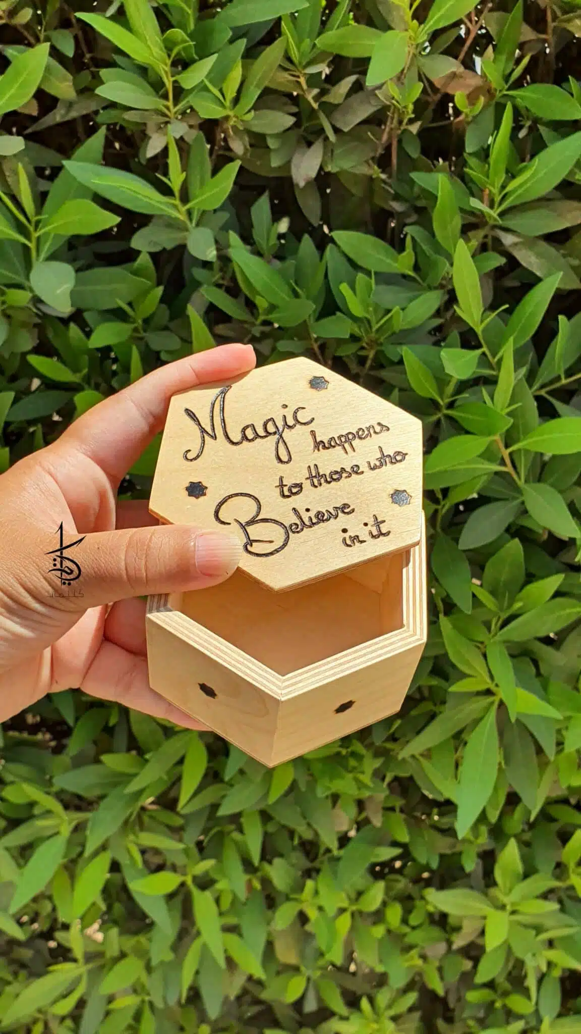 Hexagon-shaped mini wood box, with a hand-burned design.