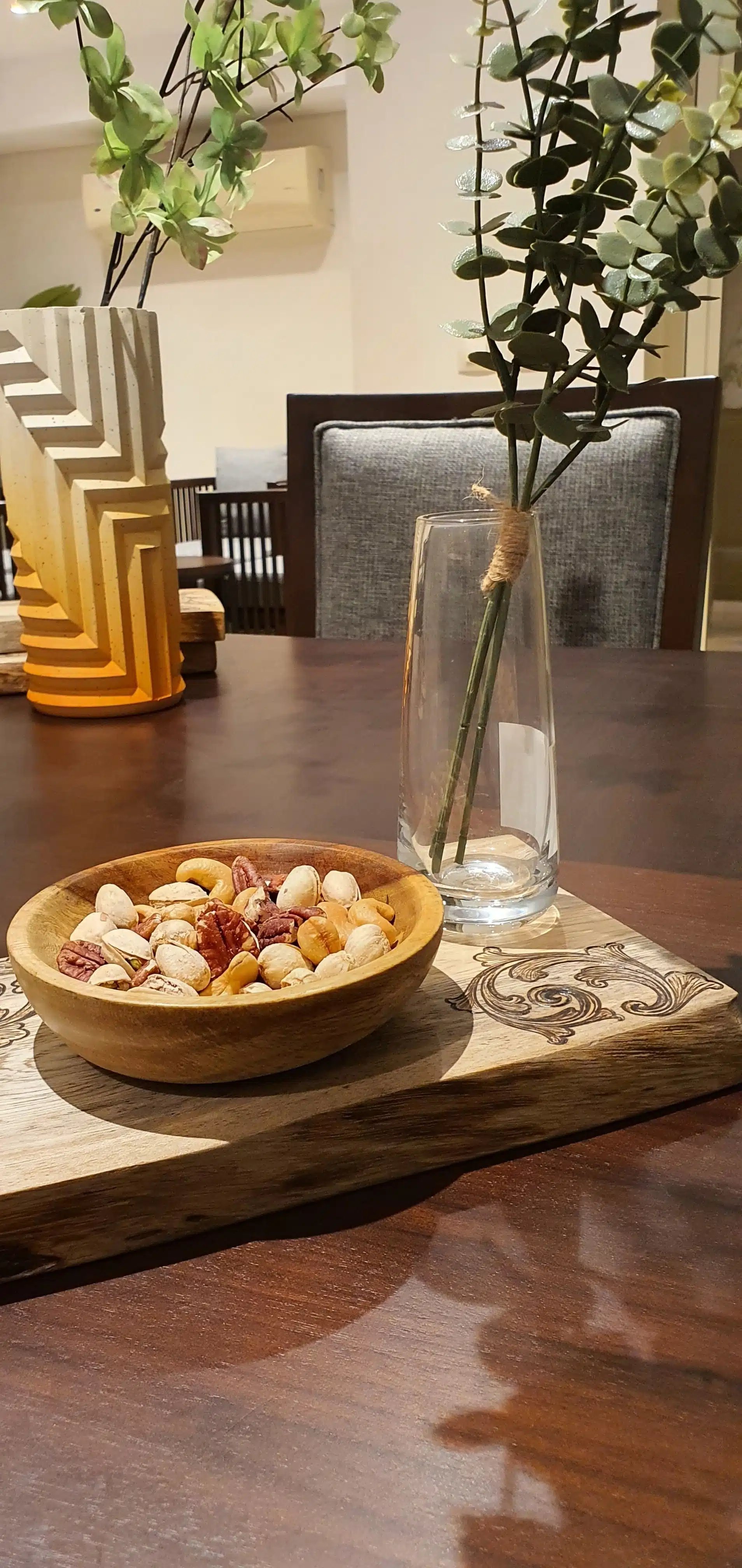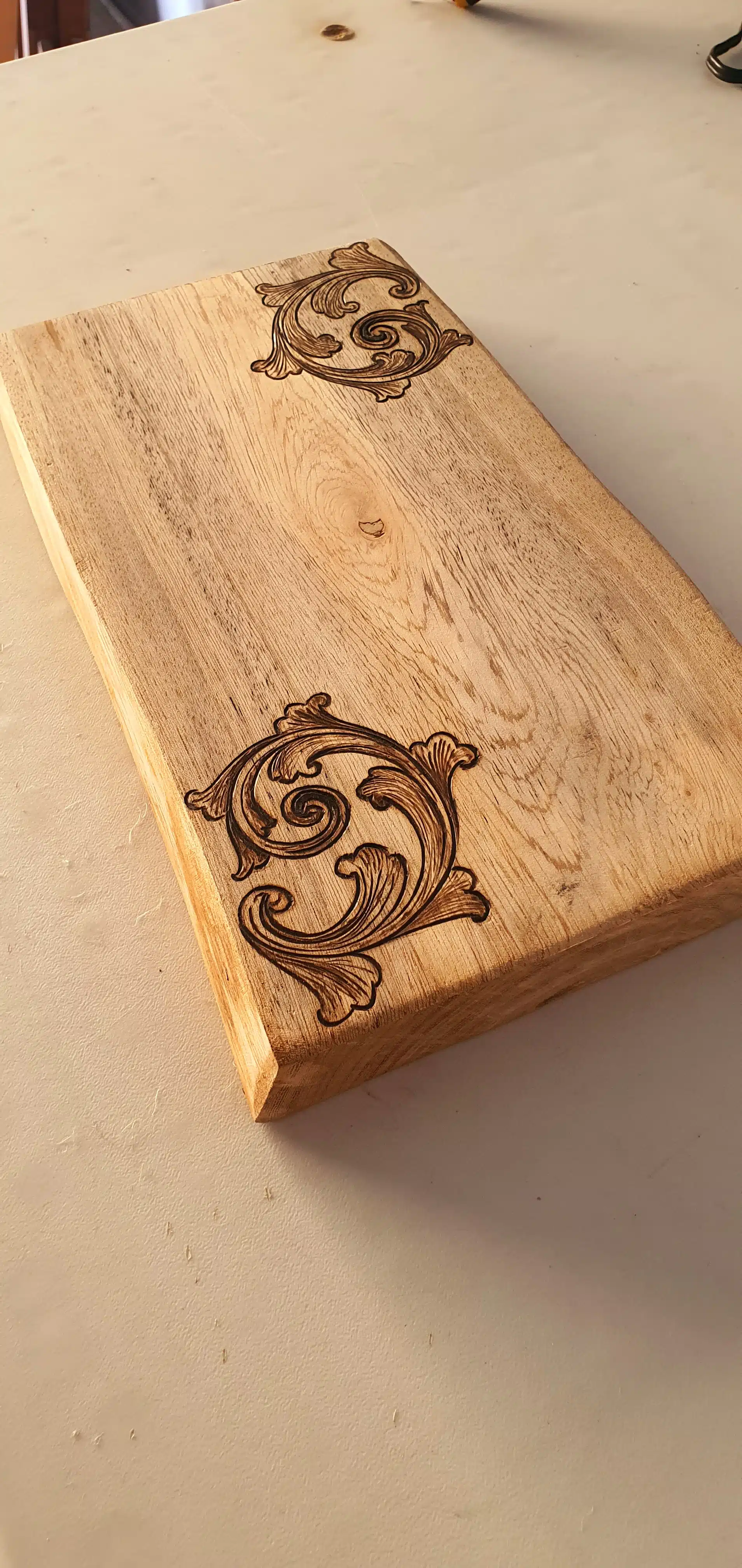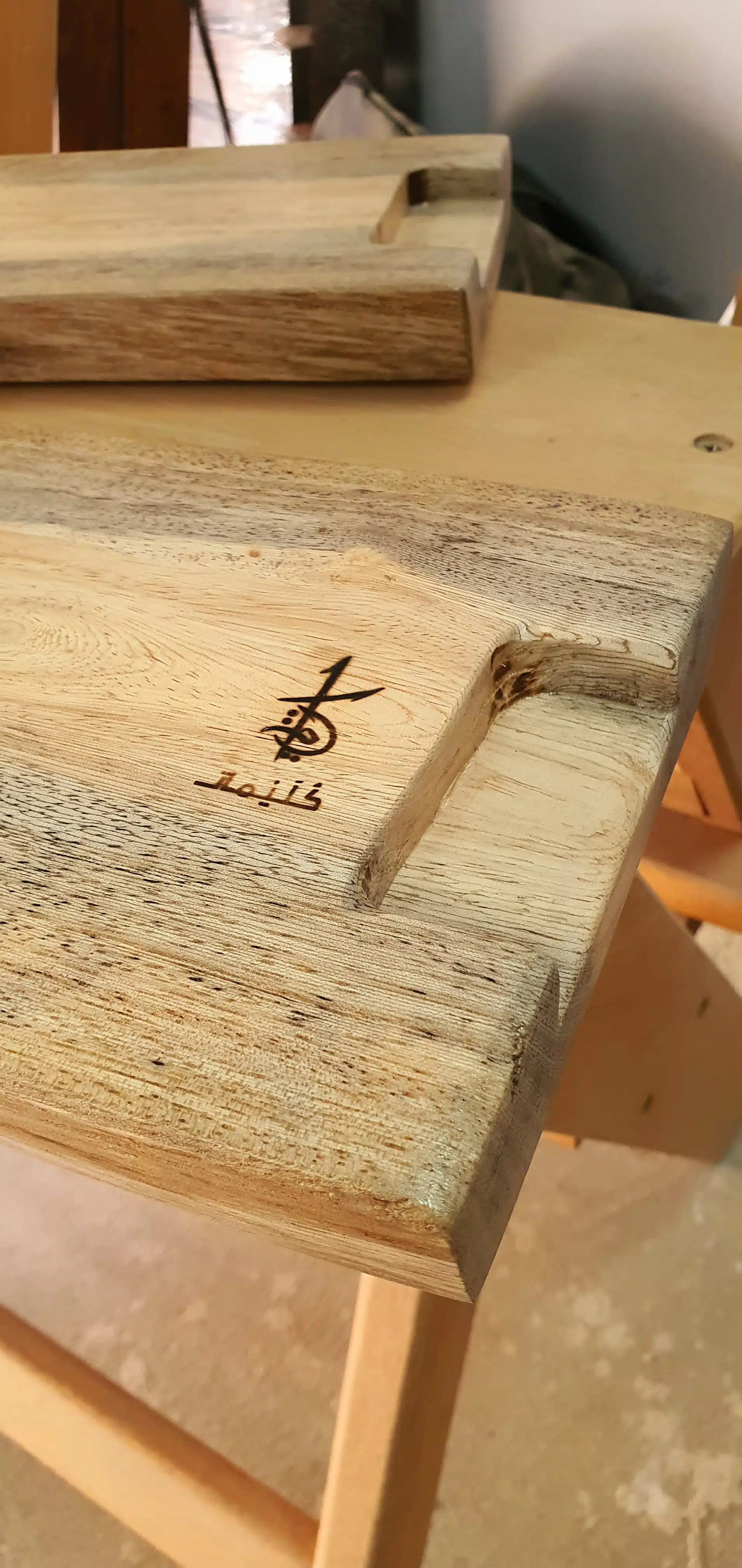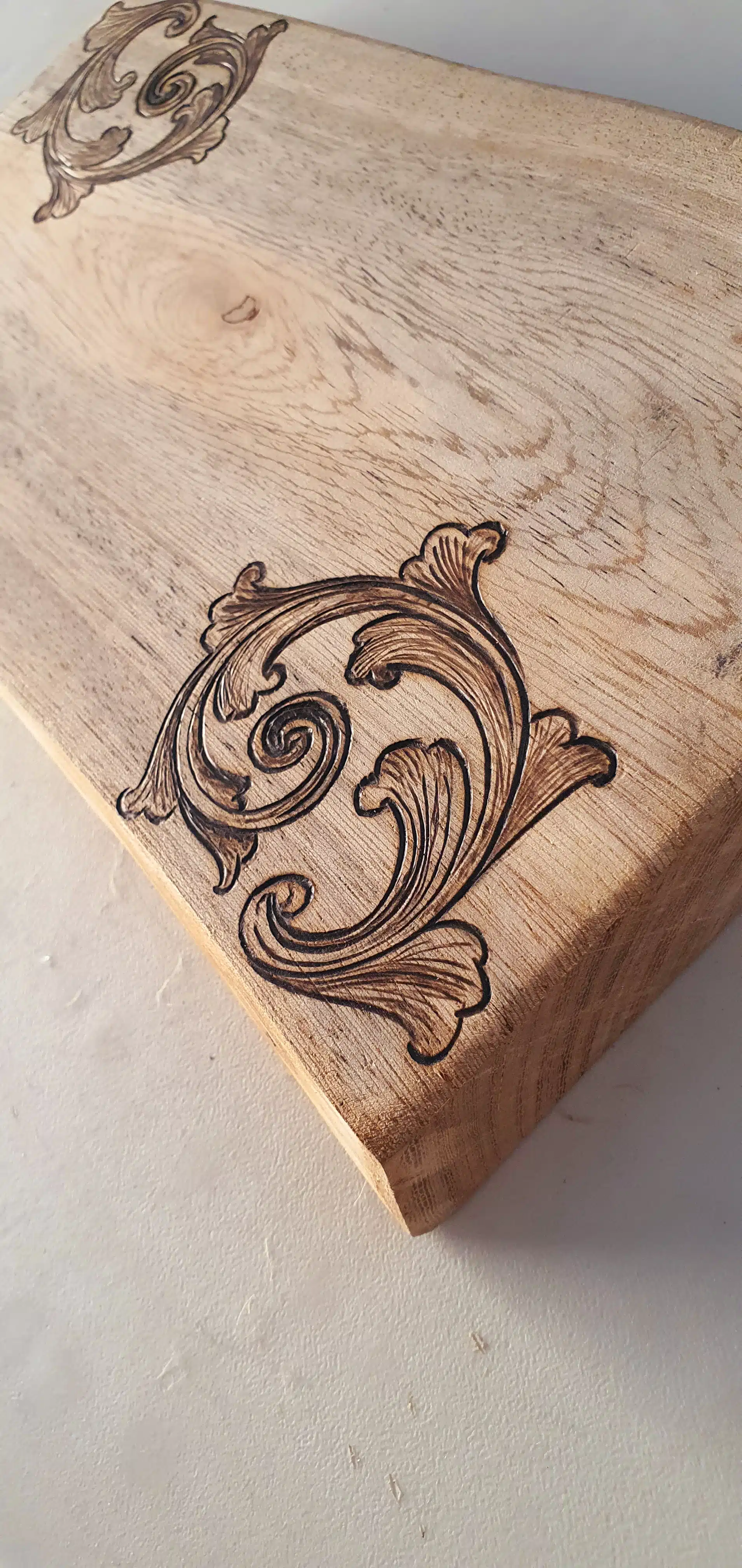 An elegant tray cut from a natural tree slice with high protection, designed with a hand-burned unique pattern.