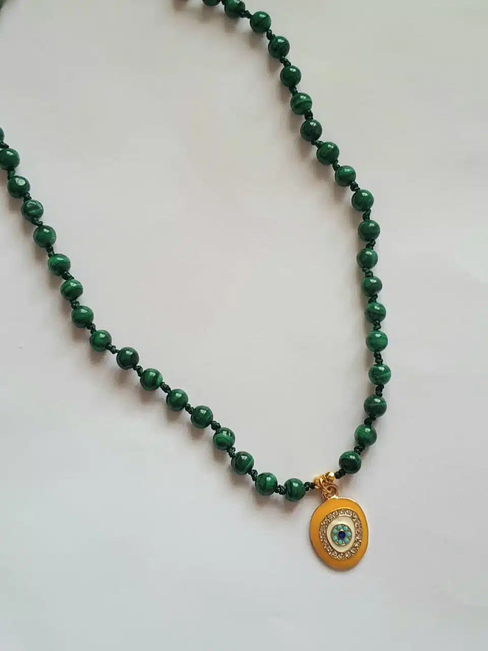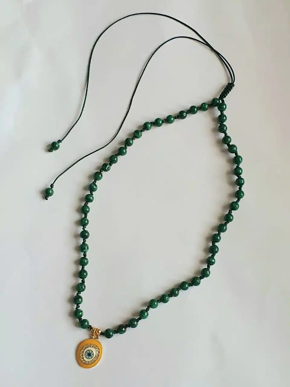 Malachite stone knotted necklace with macrame thread and a complementary yellow evil eye pendant