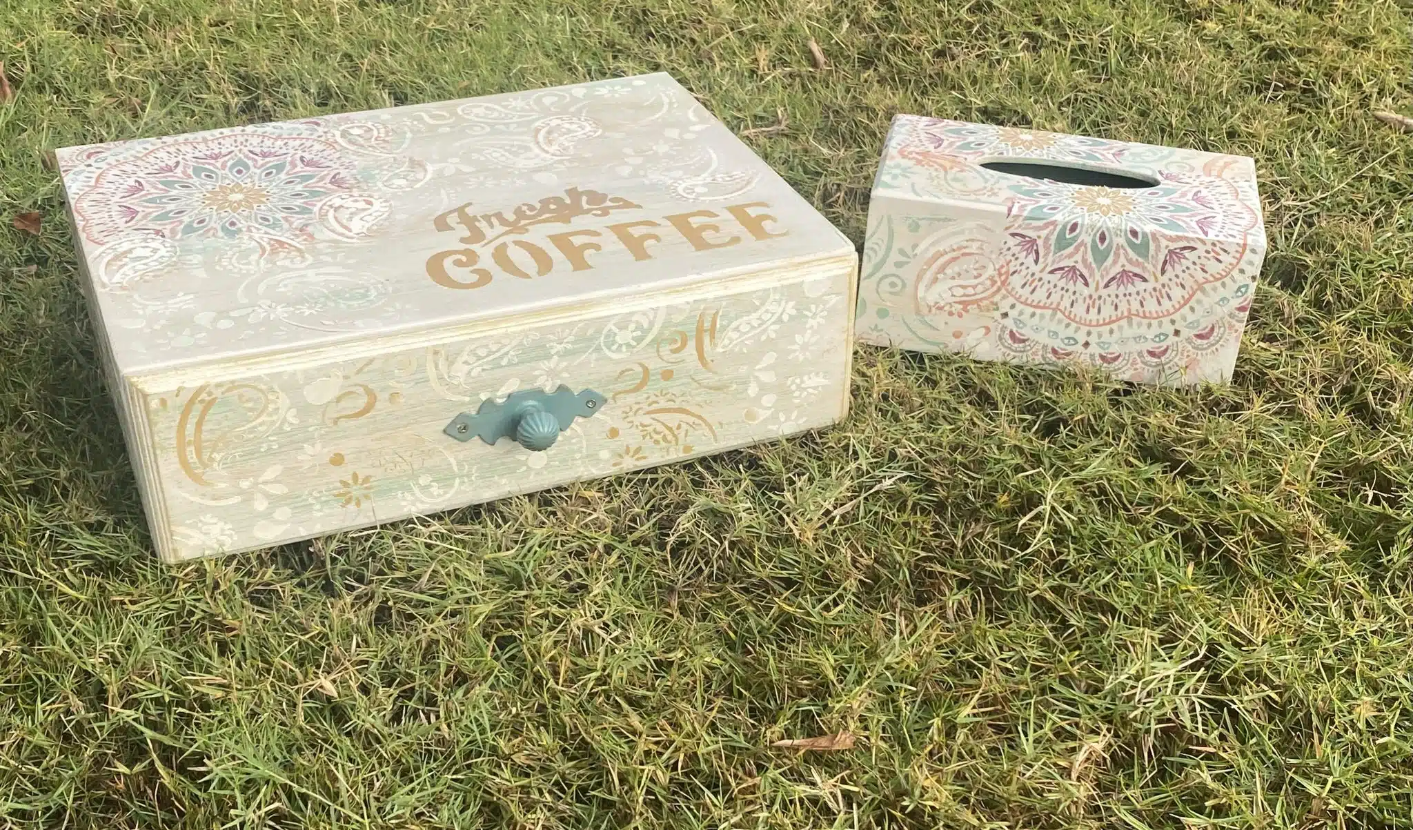 Wooden set of coffee box and matching tissue box
