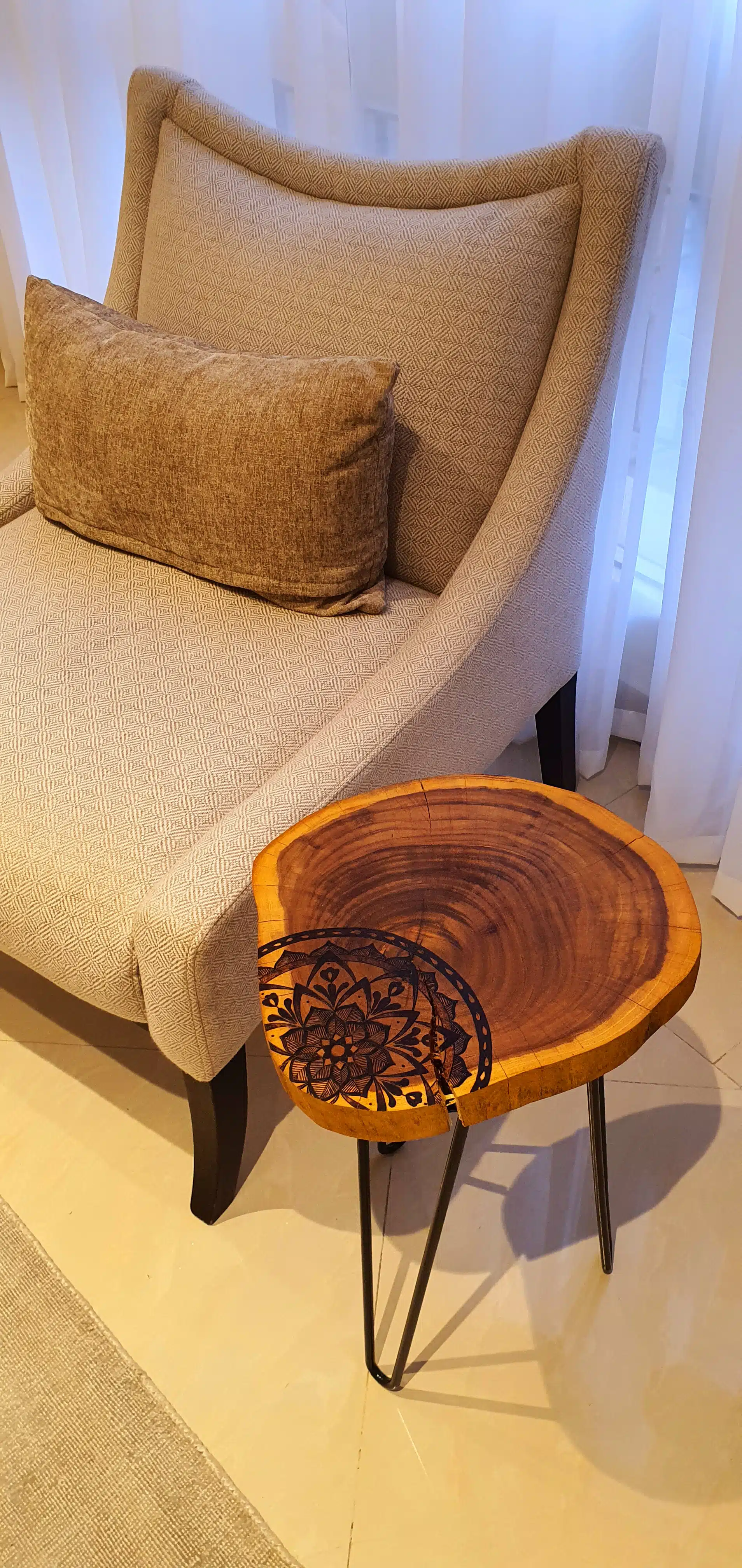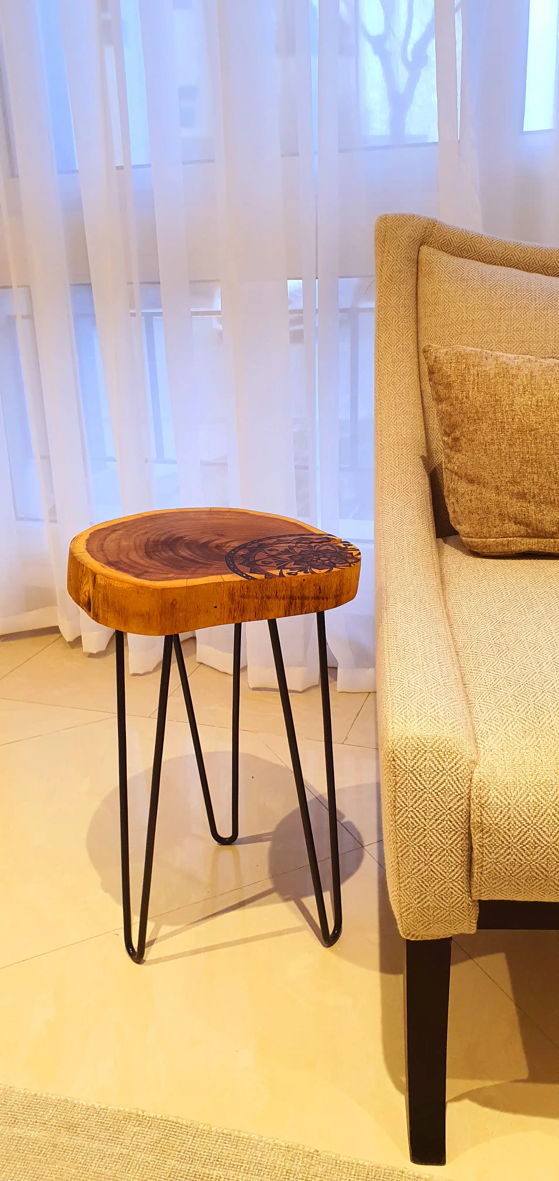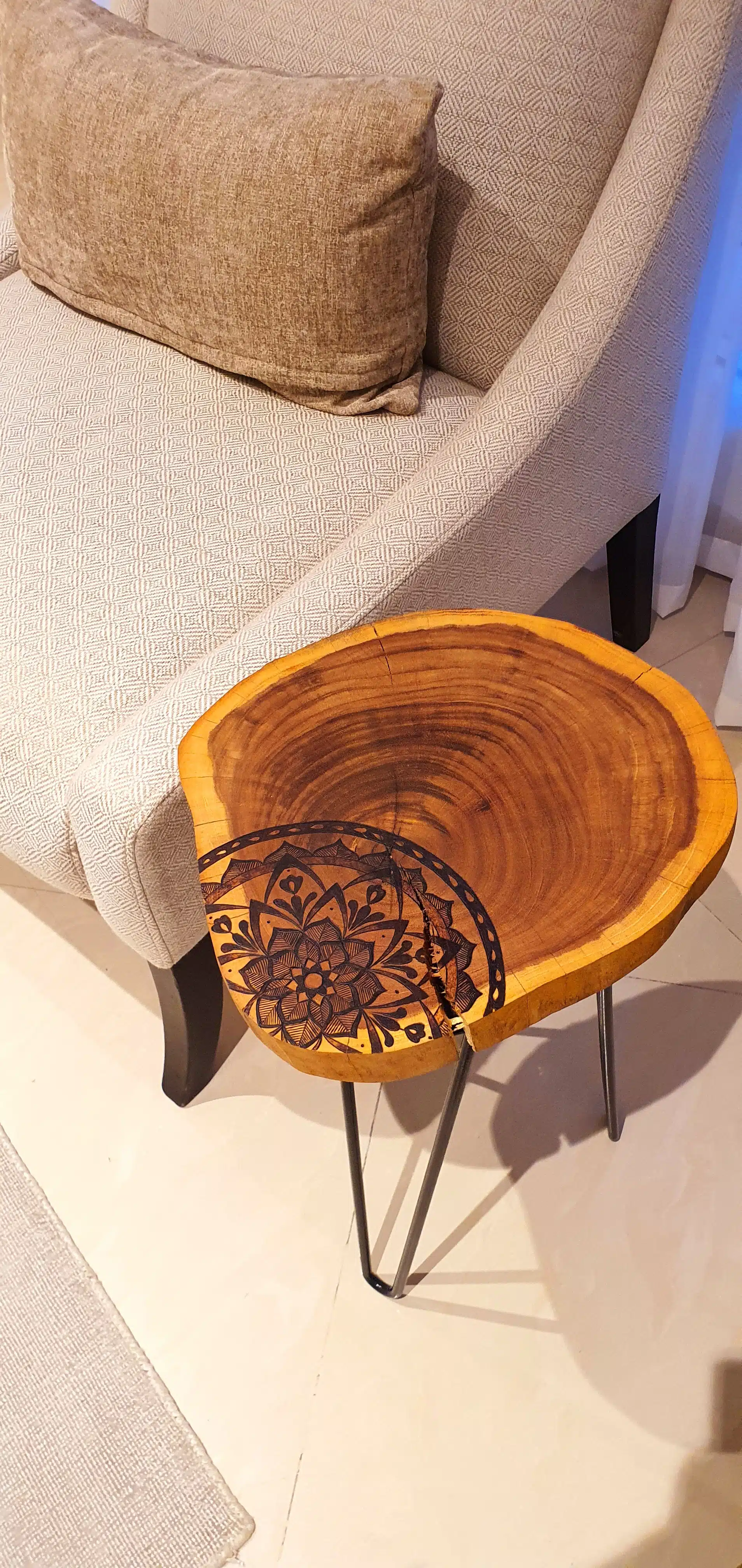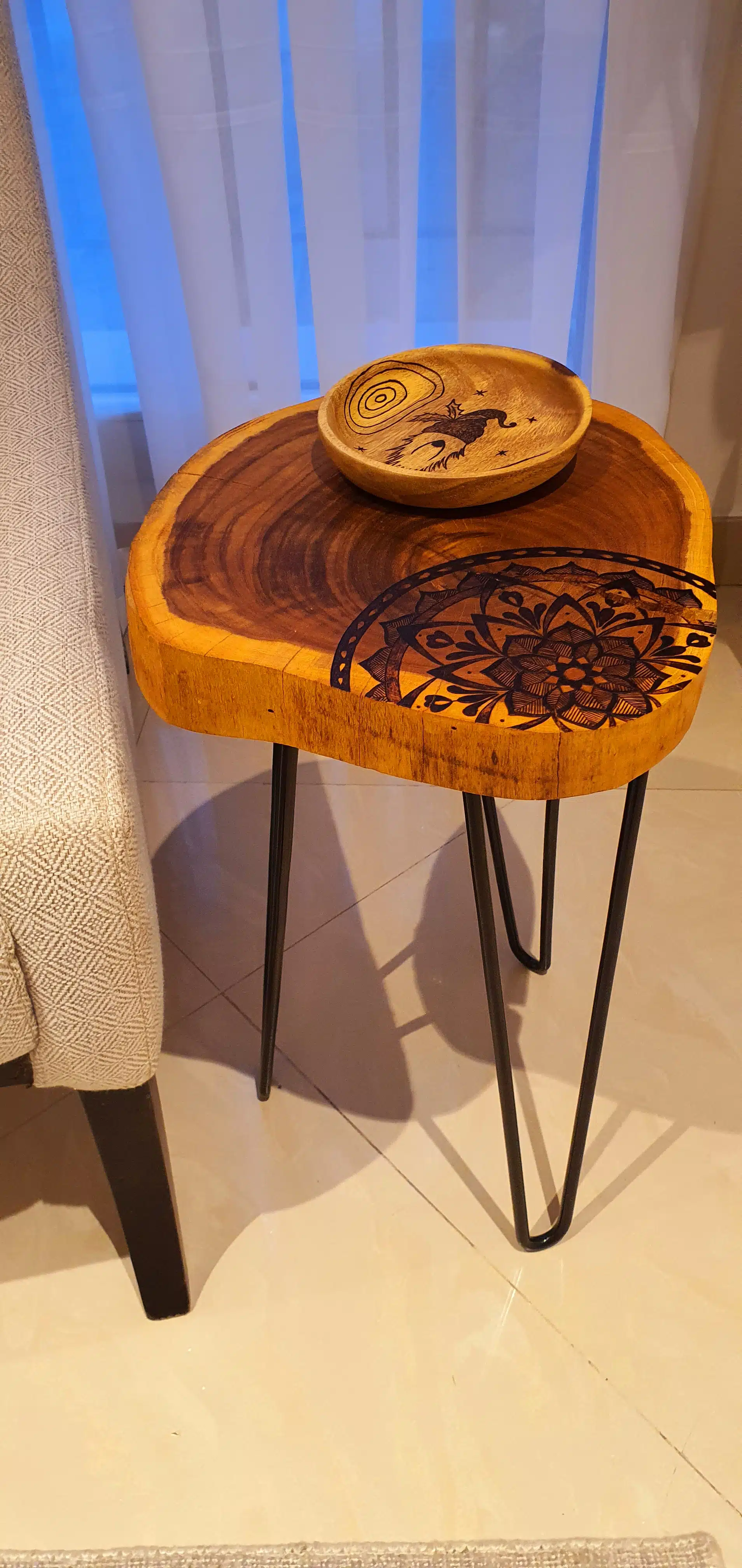 A one-of-a-kind side table made from a unique mulberry tree slice with a hand-burned design, to add a warm mystical touch to your room.