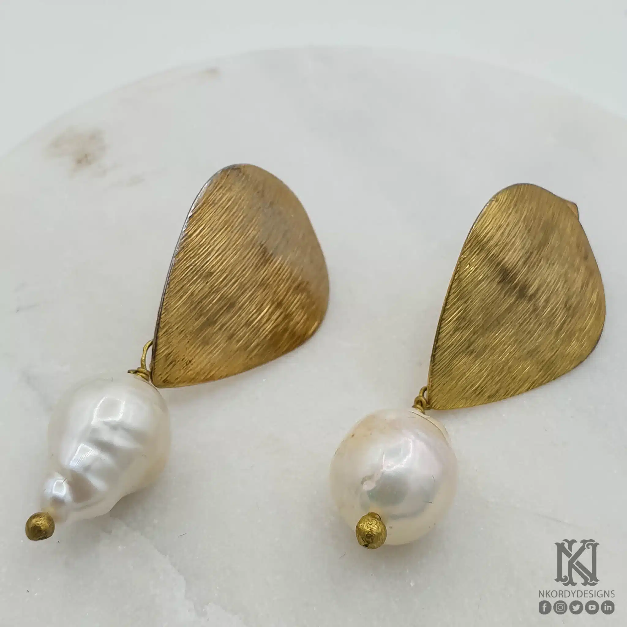 Gold plated pear shaped matt earrings with natural pearls. Note that Pearl shape may vary.