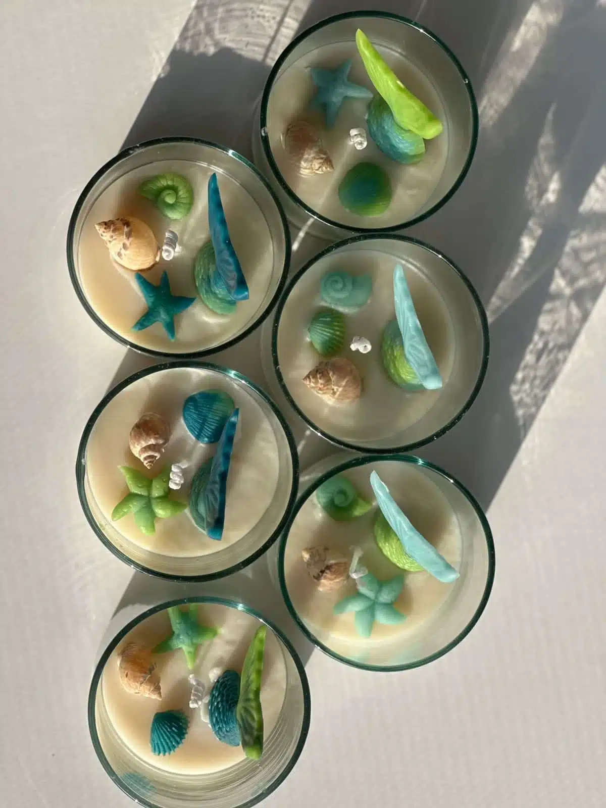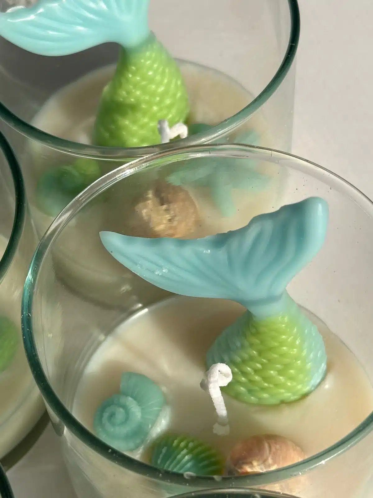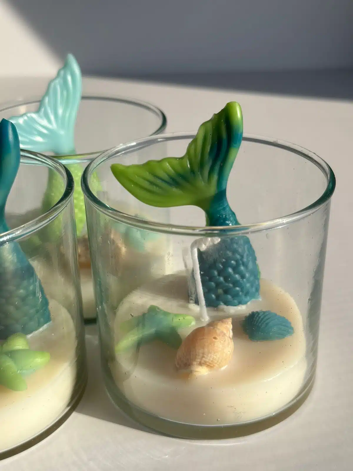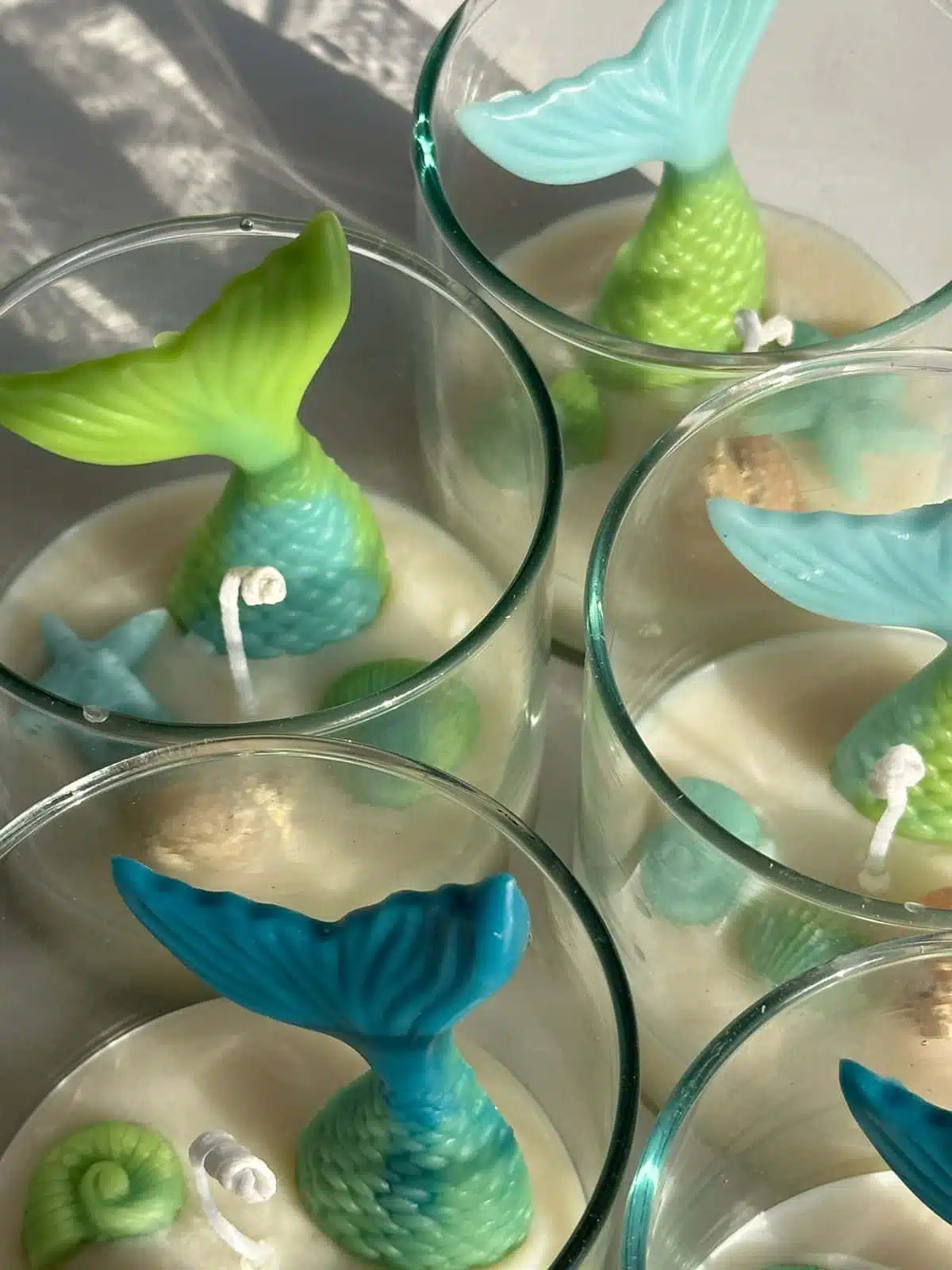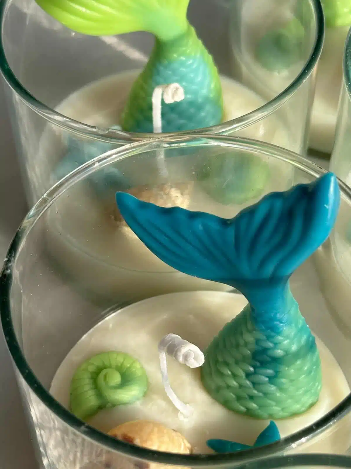 Containers of bee wax candles with colorful mermaid decorations.