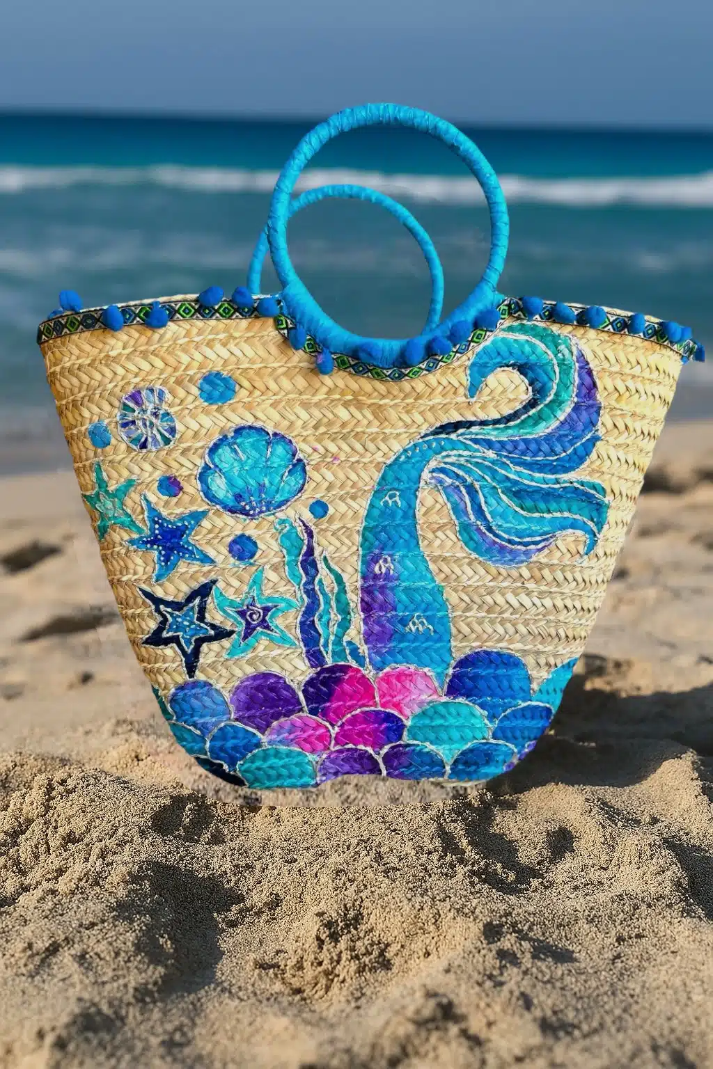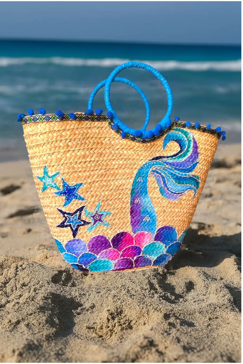 These hand-painted bags are made of natural straw and feature a vibrant combination of summer colors.