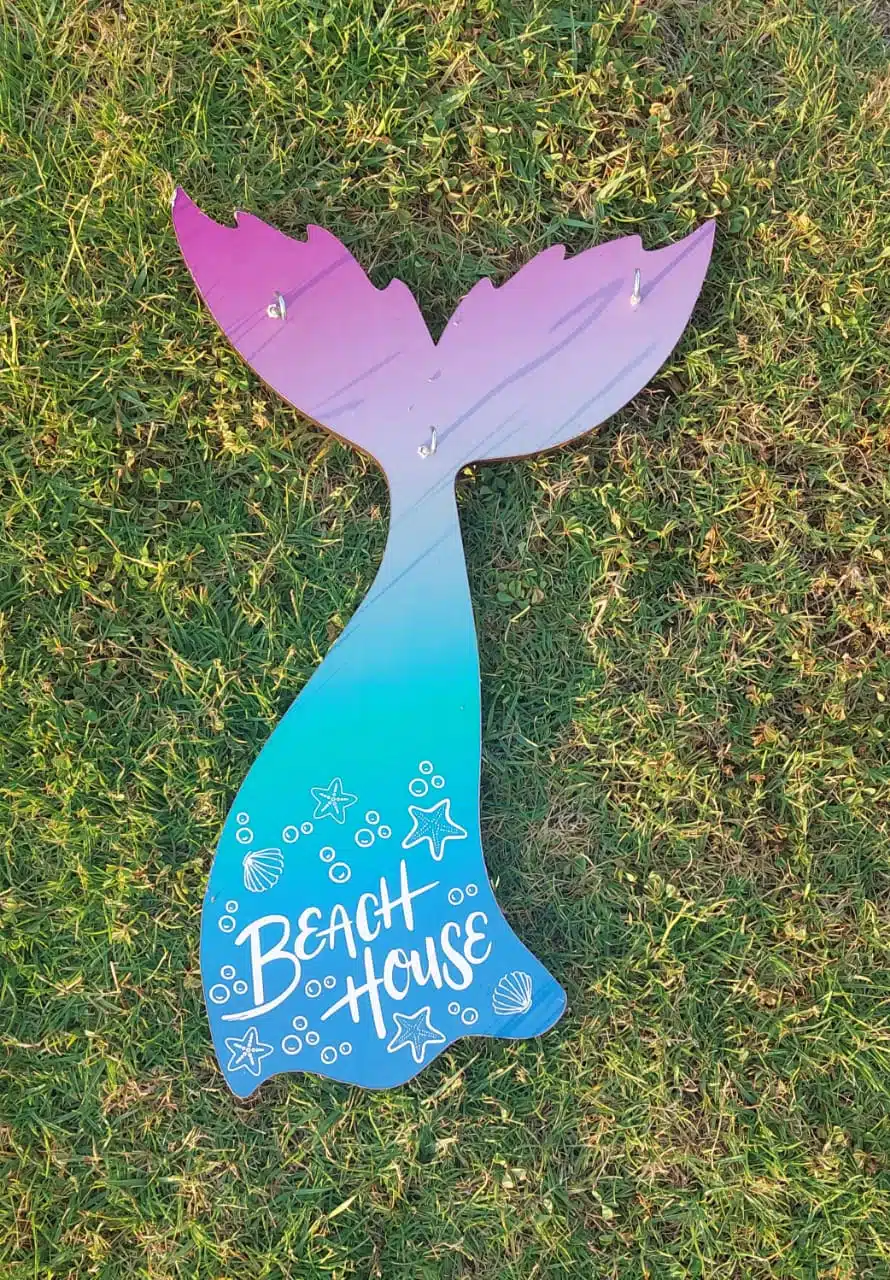 Key Wooden Hanger Size A4, Mermaid shape with caption beach house.