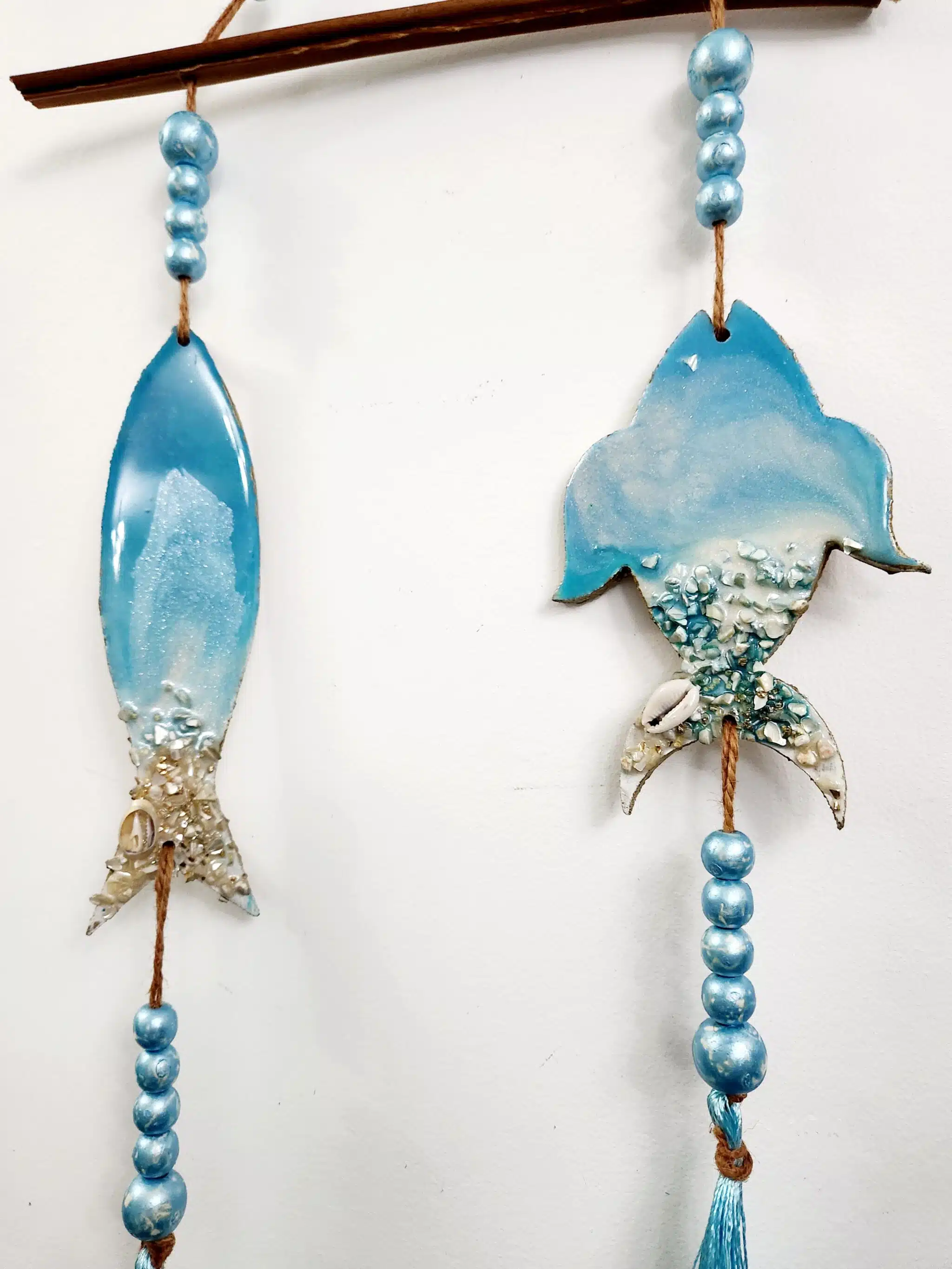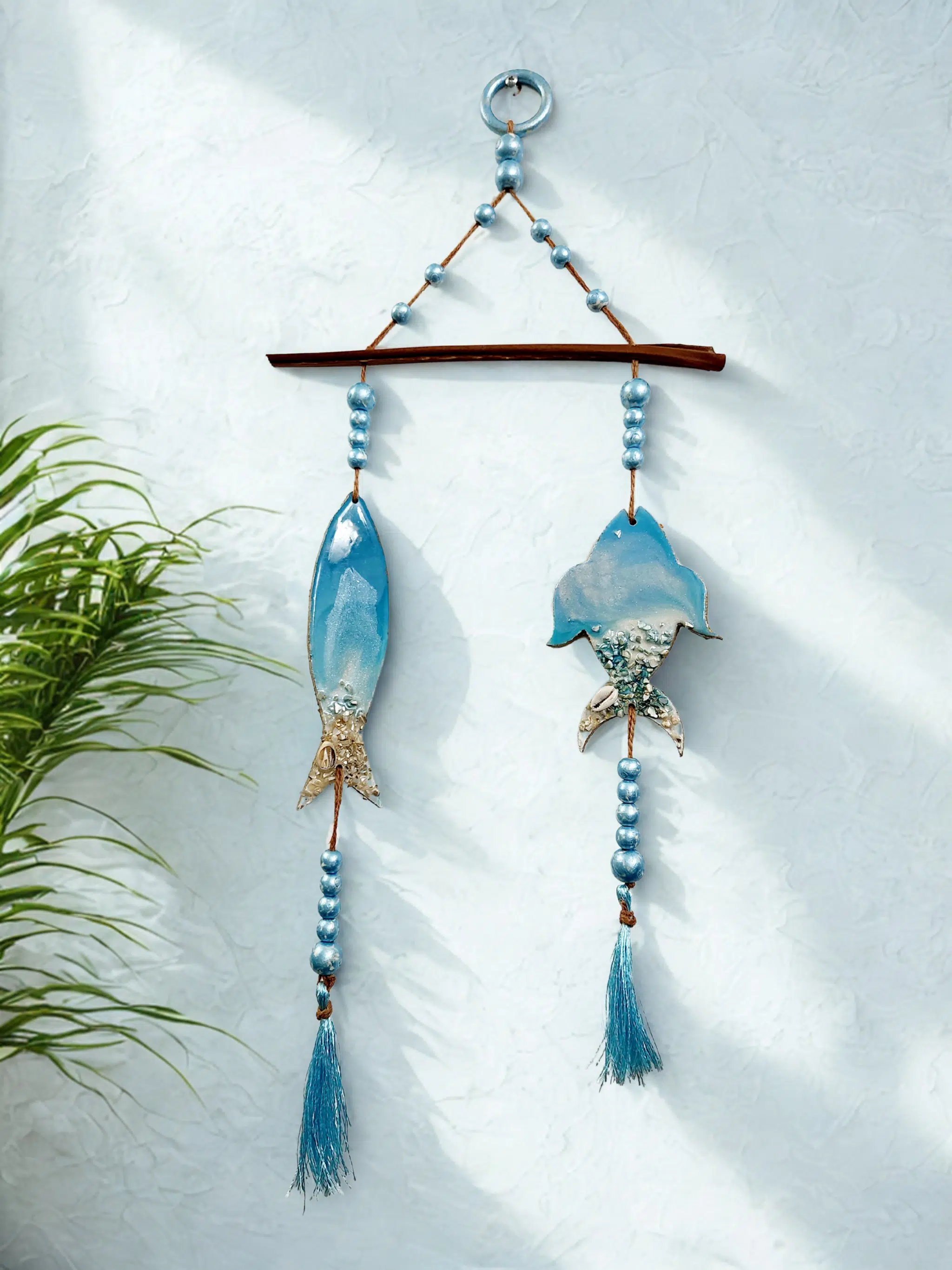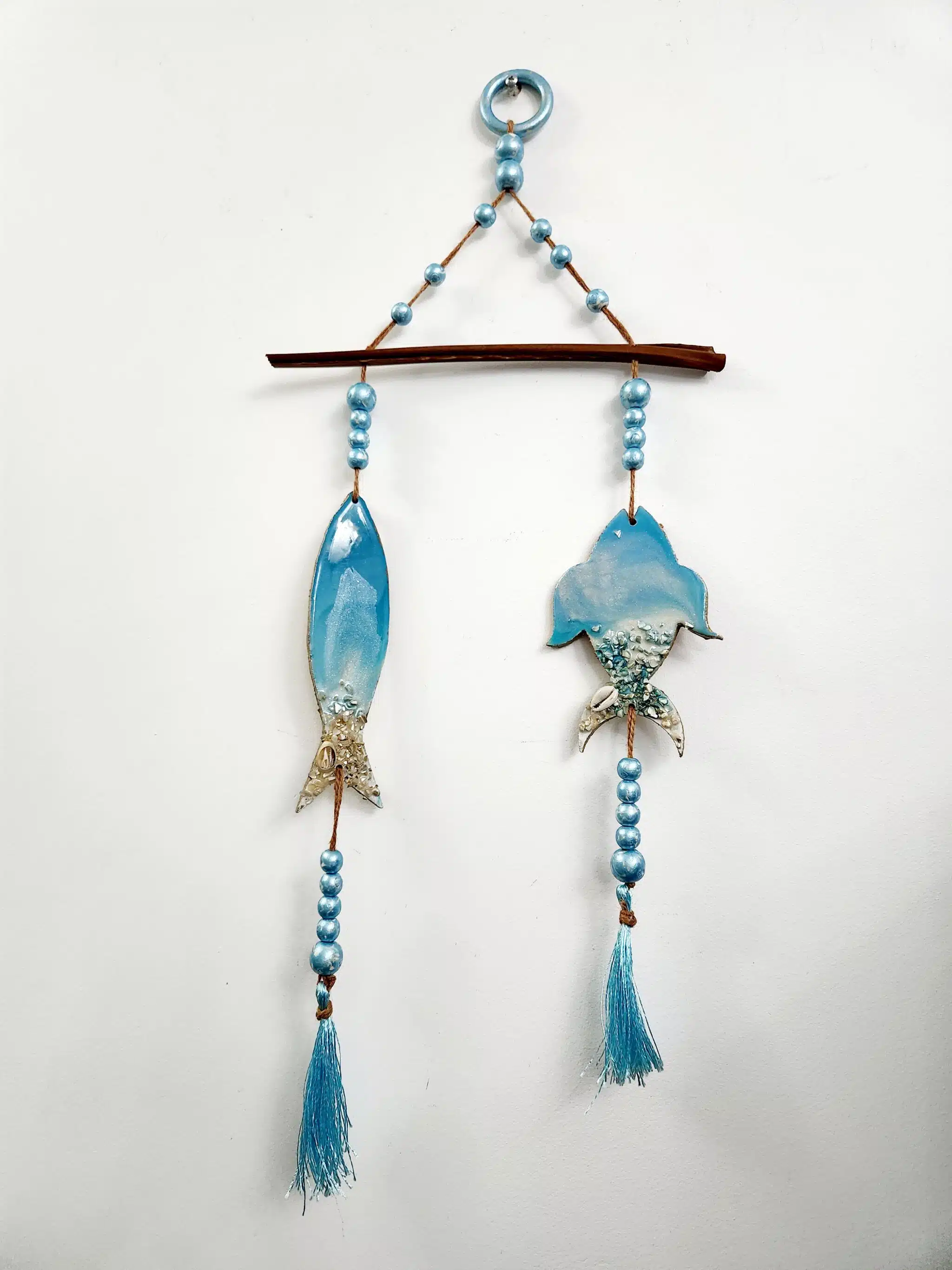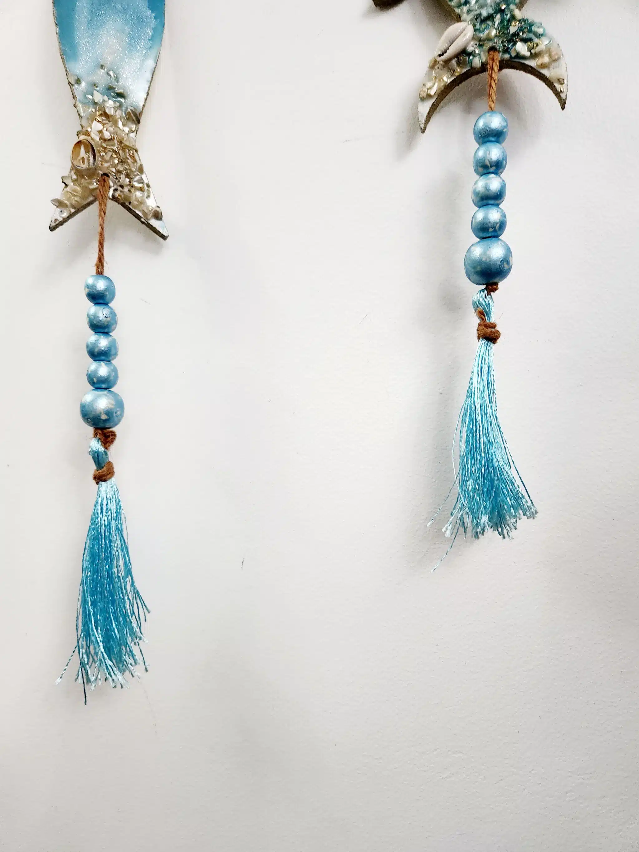 Simple, serene, and beautifully made. This twin fish wall decor piece brings a touch of calm and ocean magic with pearlescent blues and soft tassels.