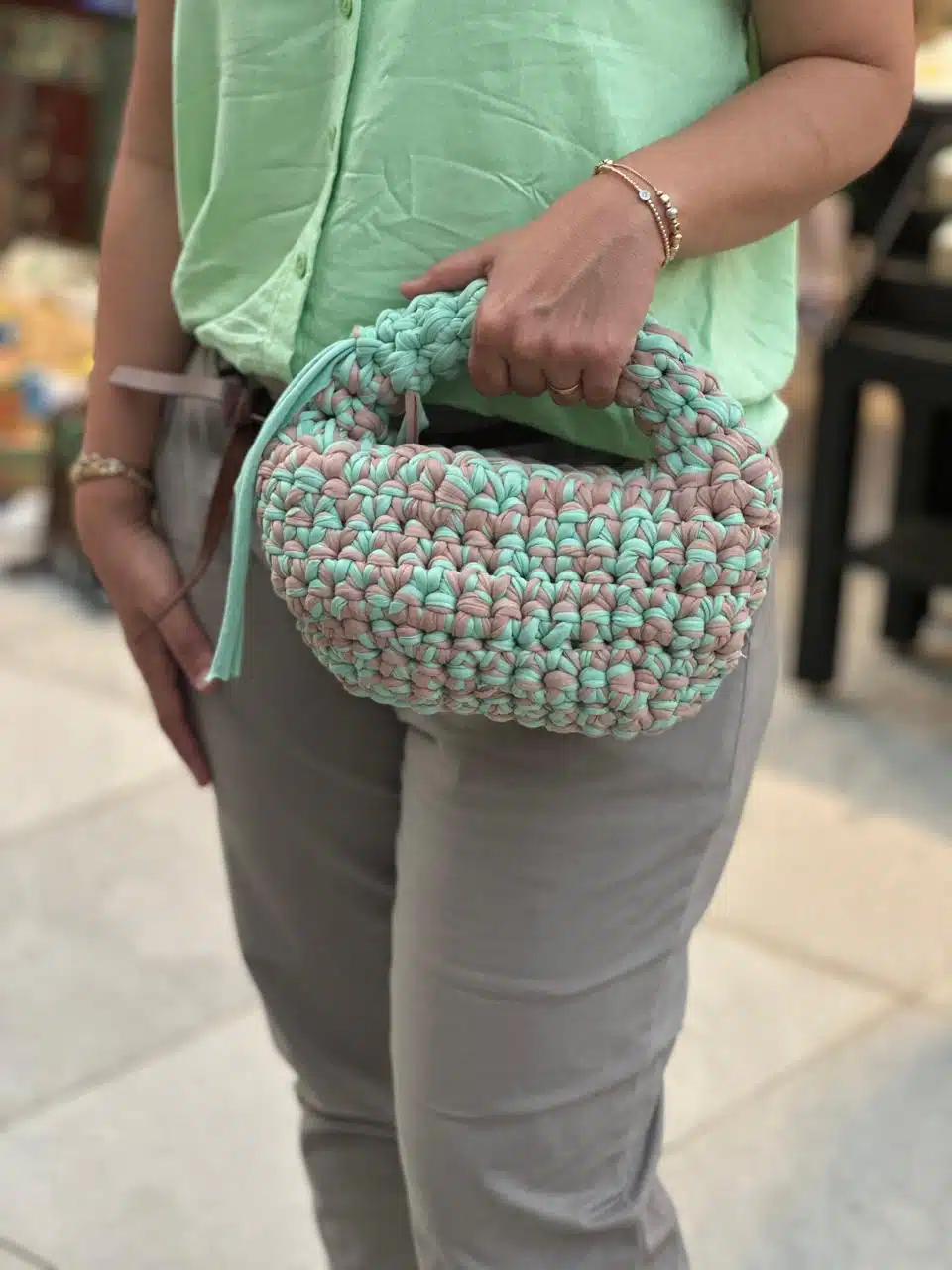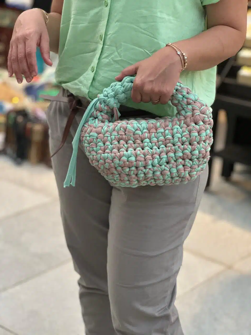 Round bubbly crochet hand bag in mint and greige. Made of t shirt yarn.