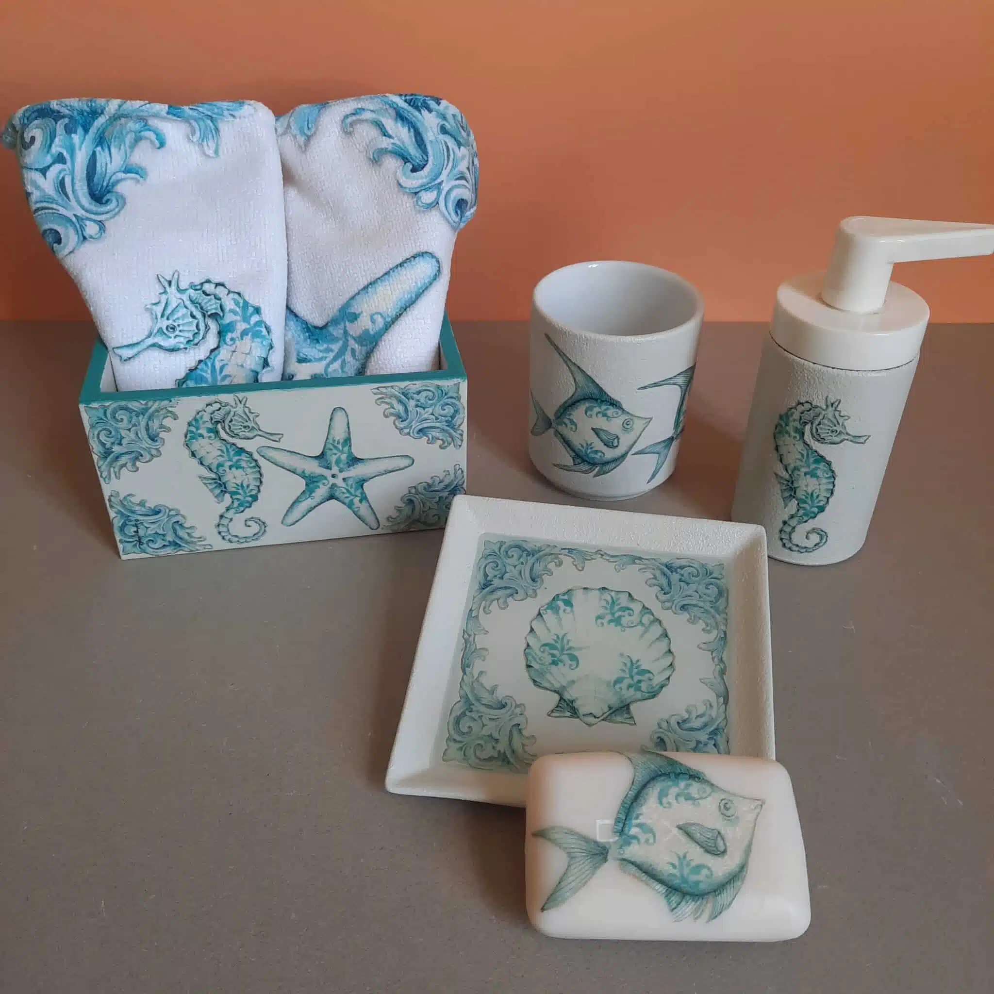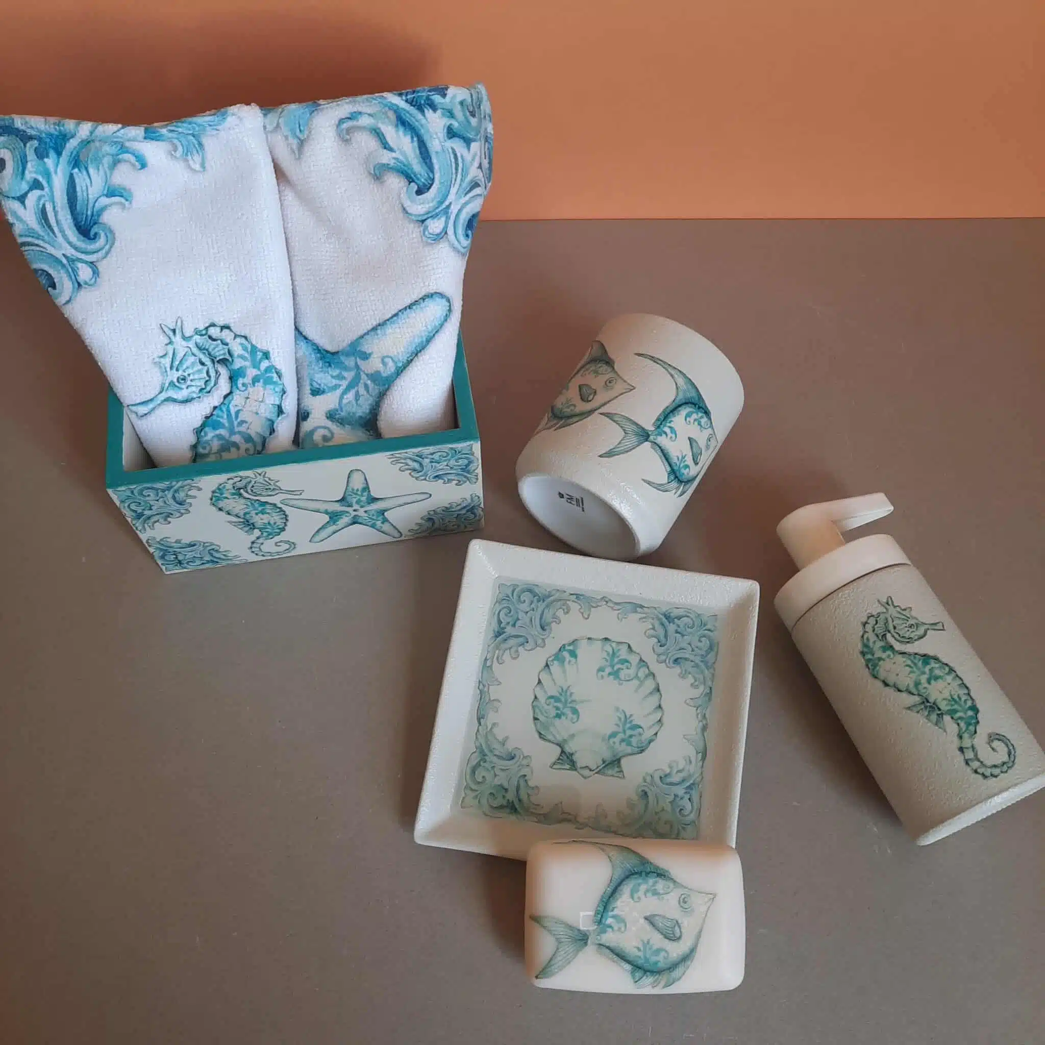 Full set consists of soap plate with a resin top, soap , cup ,dispenser and a wooden box 15×15 with 2 microfiber towels with the same print