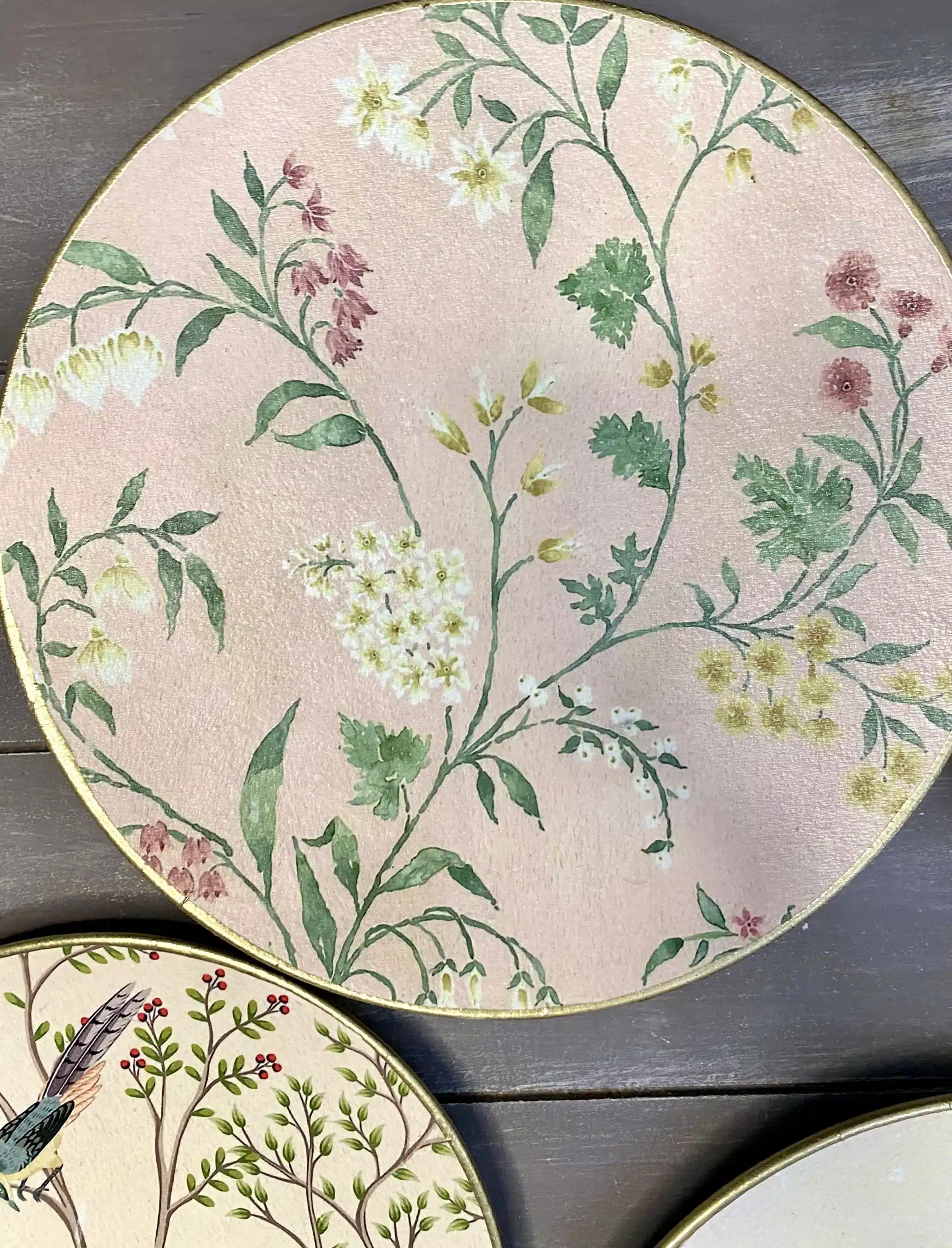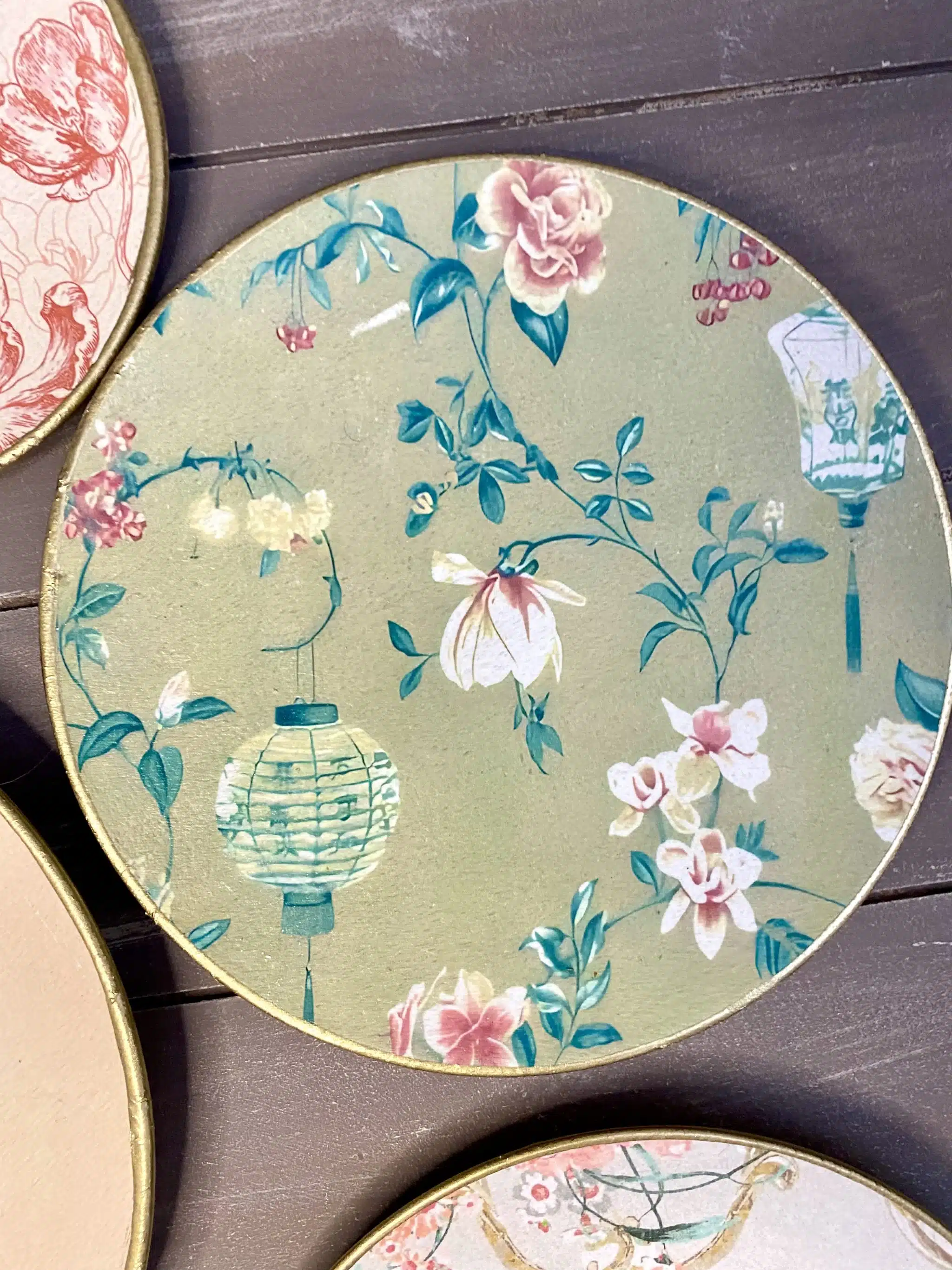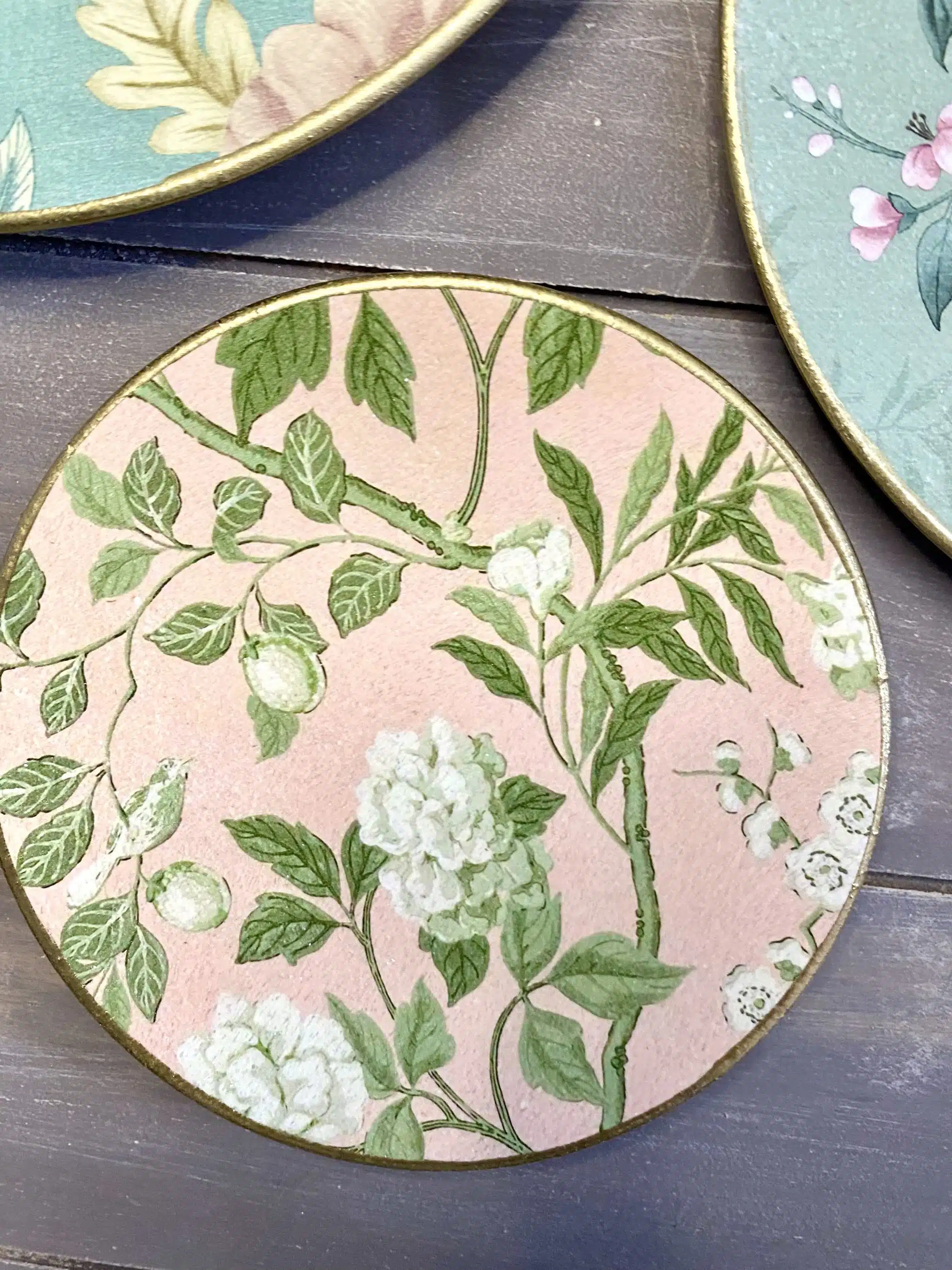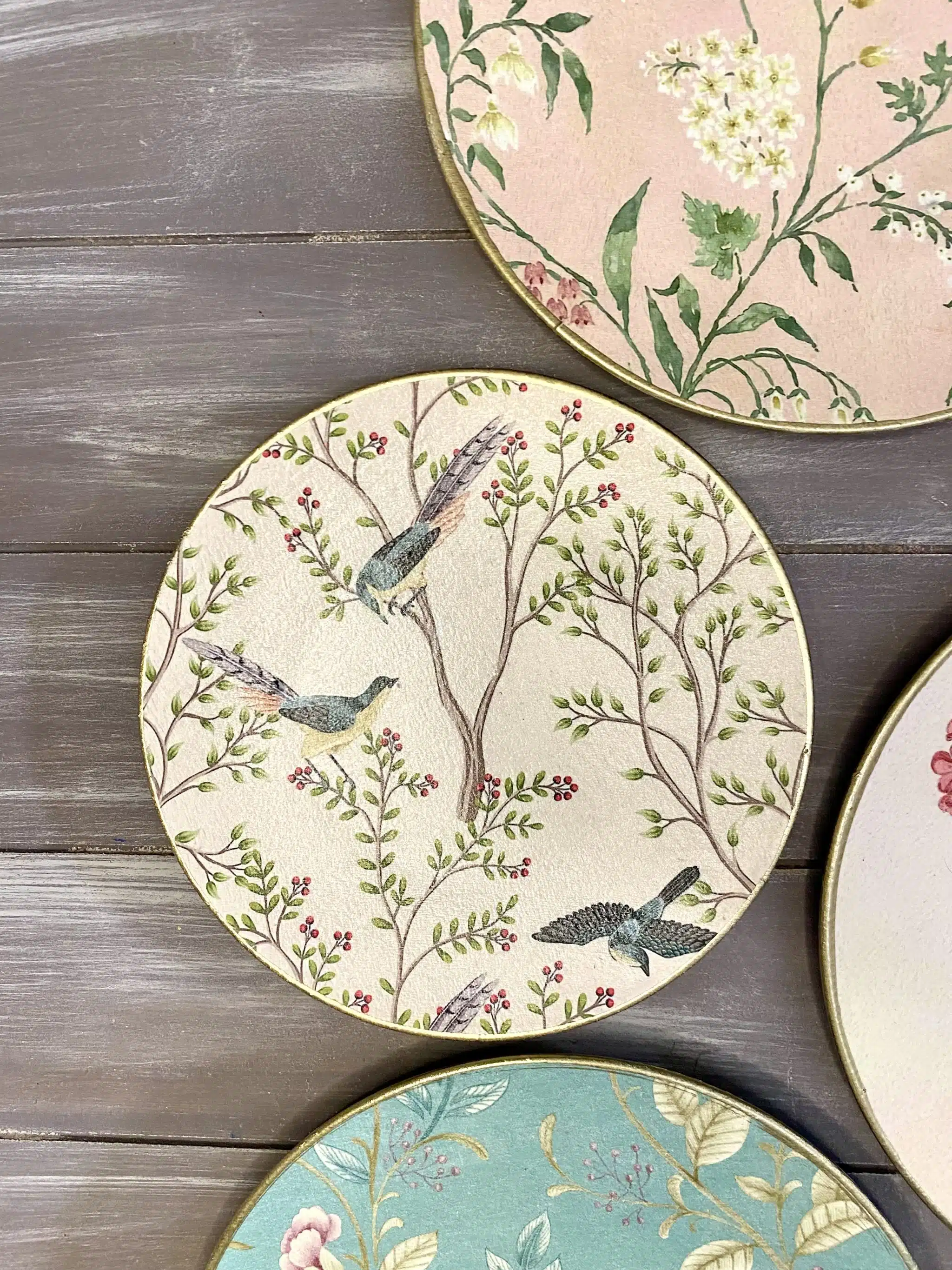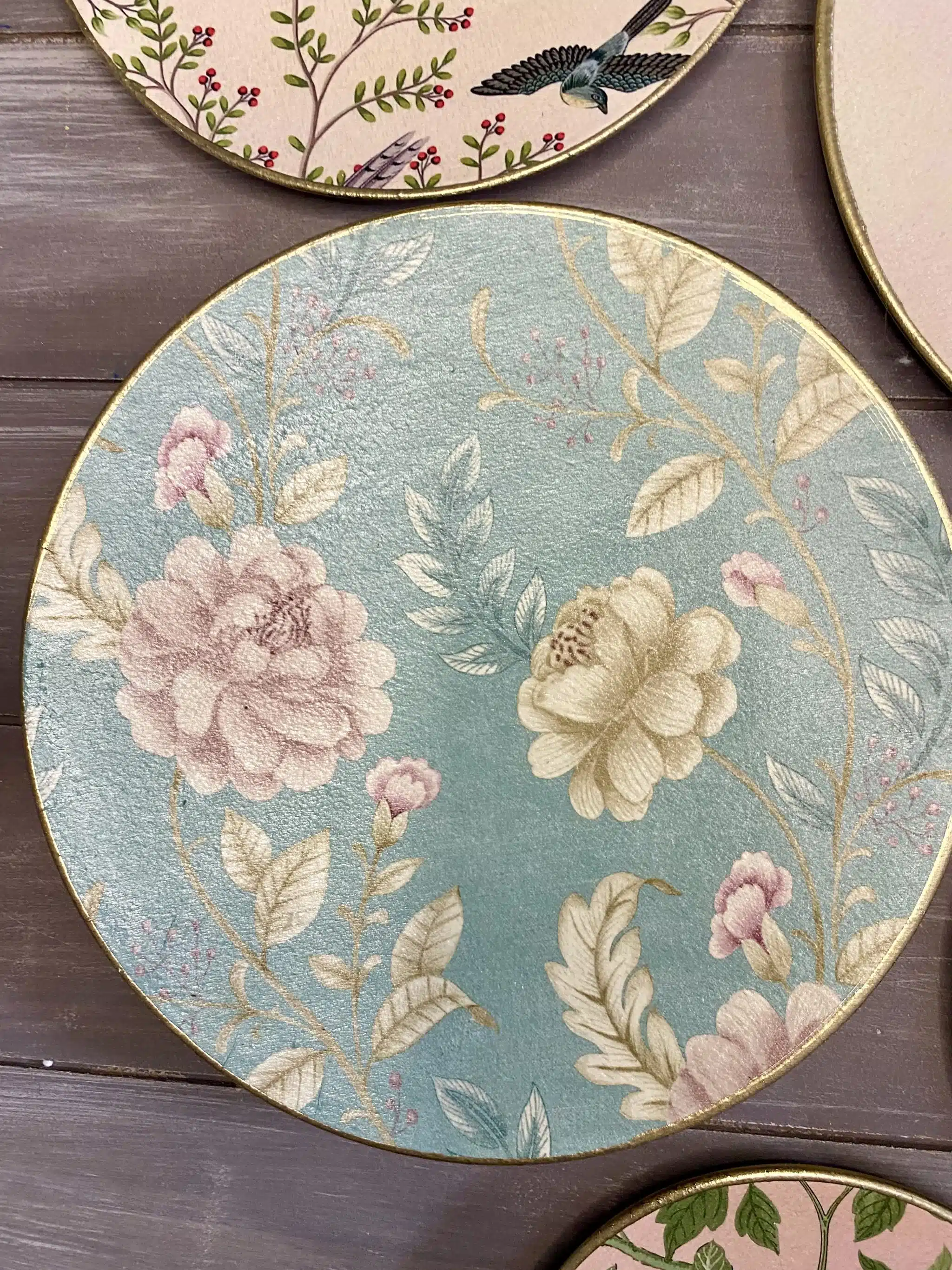 Decoupaged wall decorative plates in soft mint colors and rose