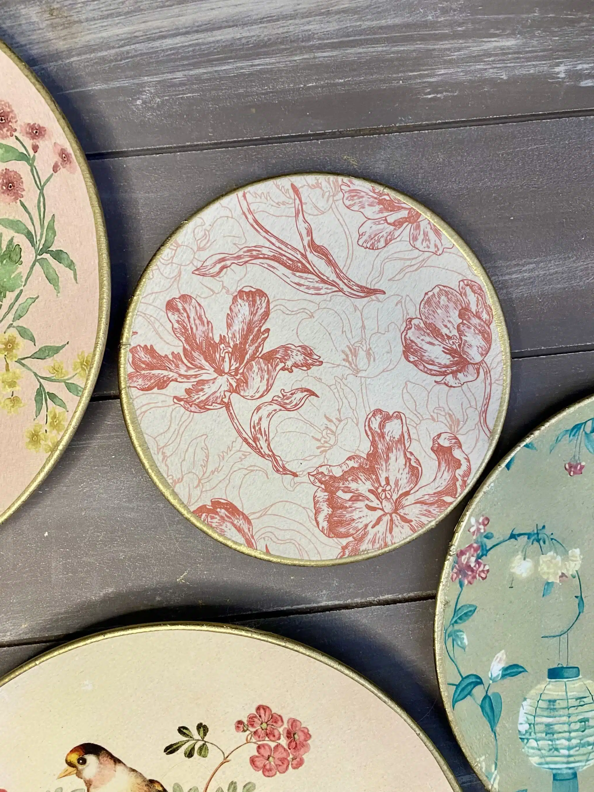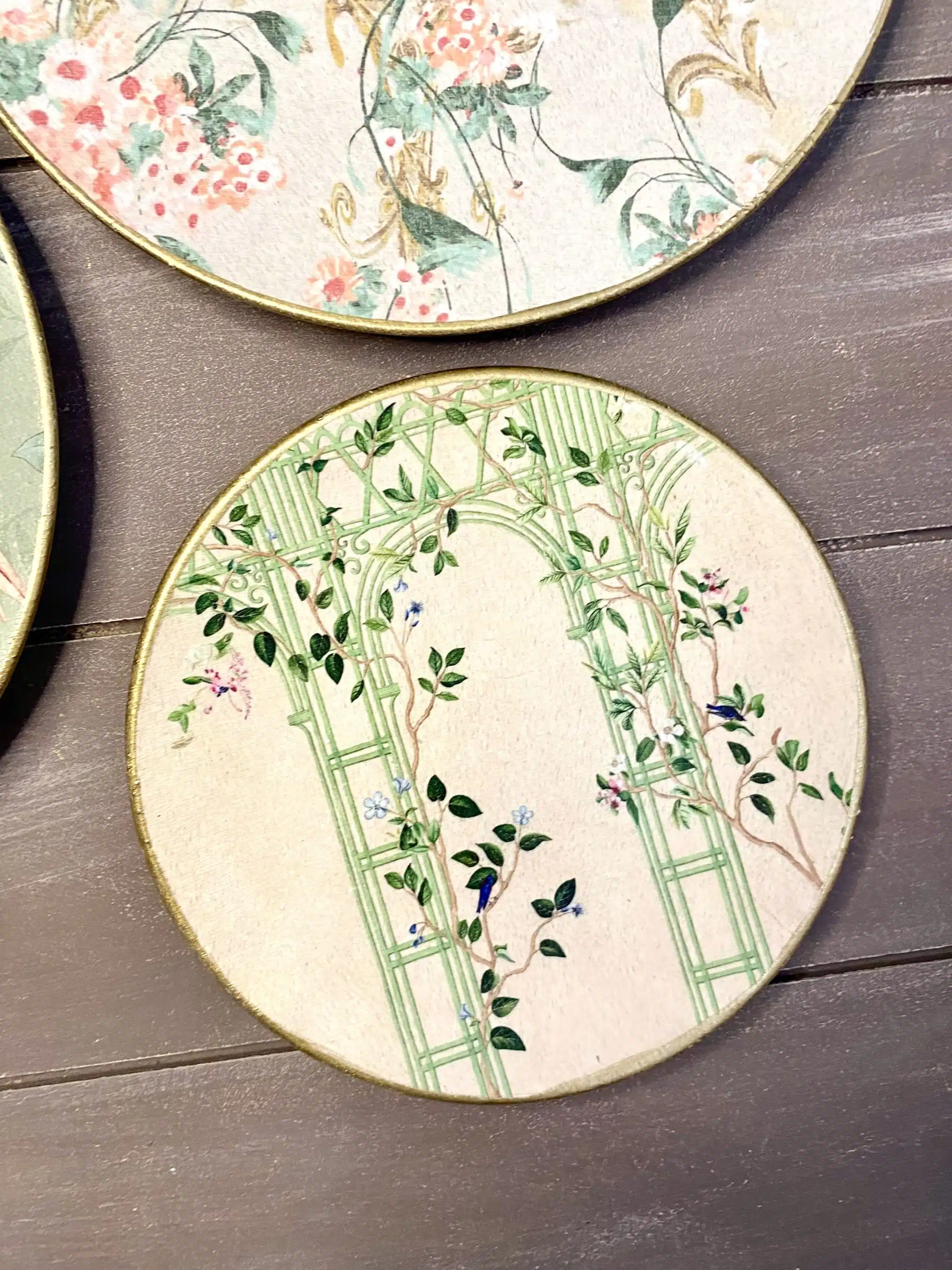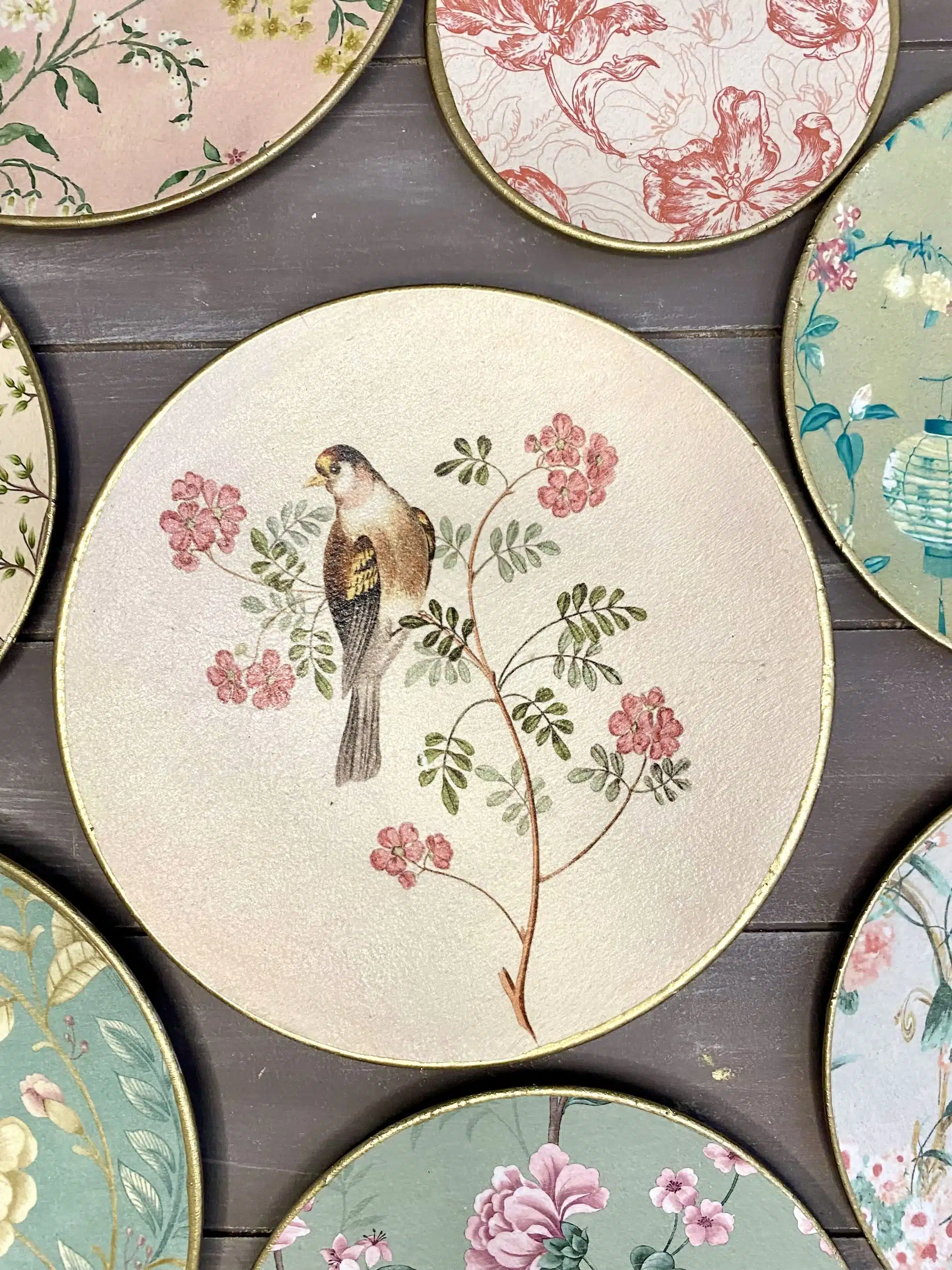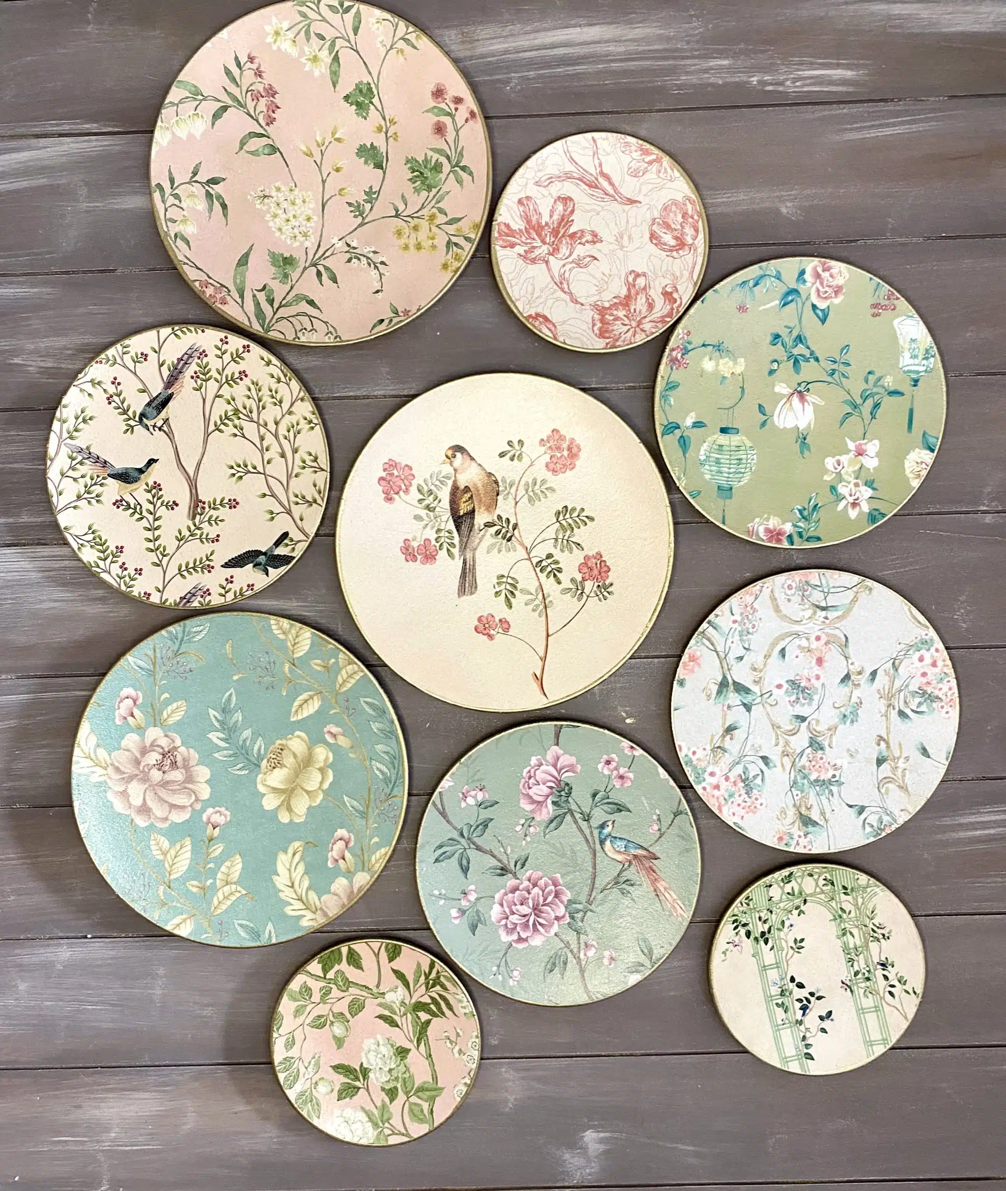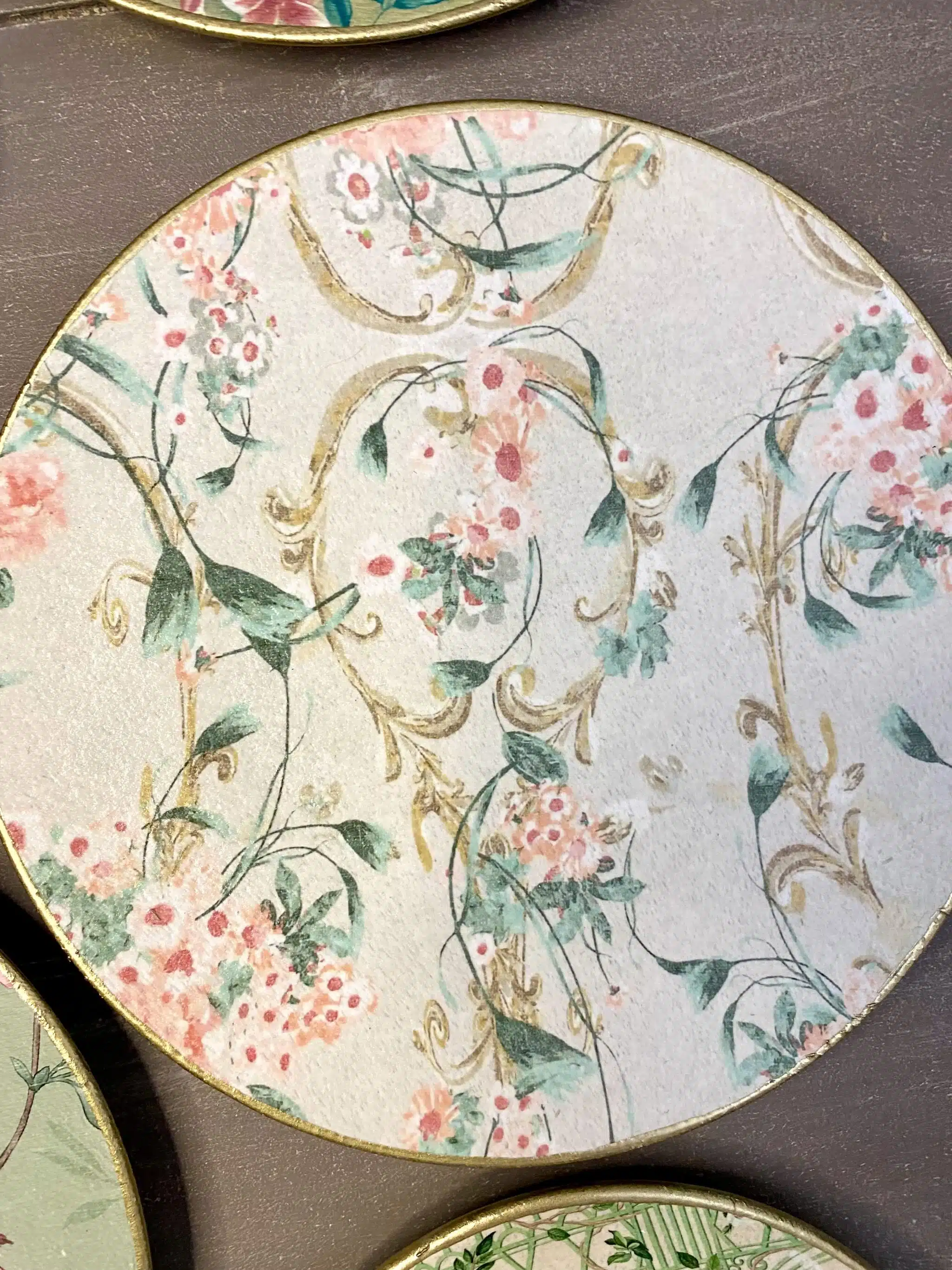 Decoupaged wall decorative plates in soft mint colors and rose