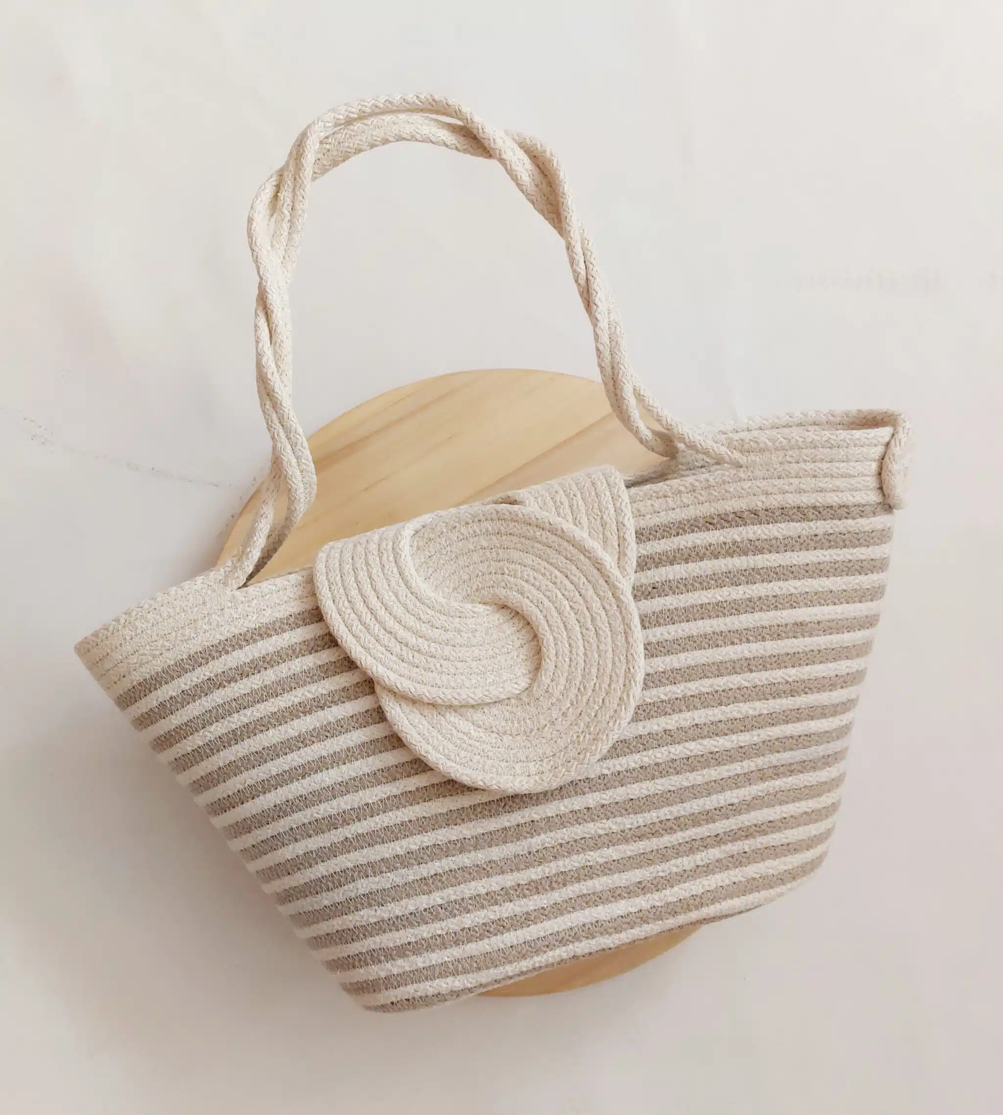 “A handcrafted cotton cord bag with beige and off-white horizontal stripes, featuring a twisted handle and a decorative spiral flower accent on the front, displayed against a light background with a wooden round prop.”