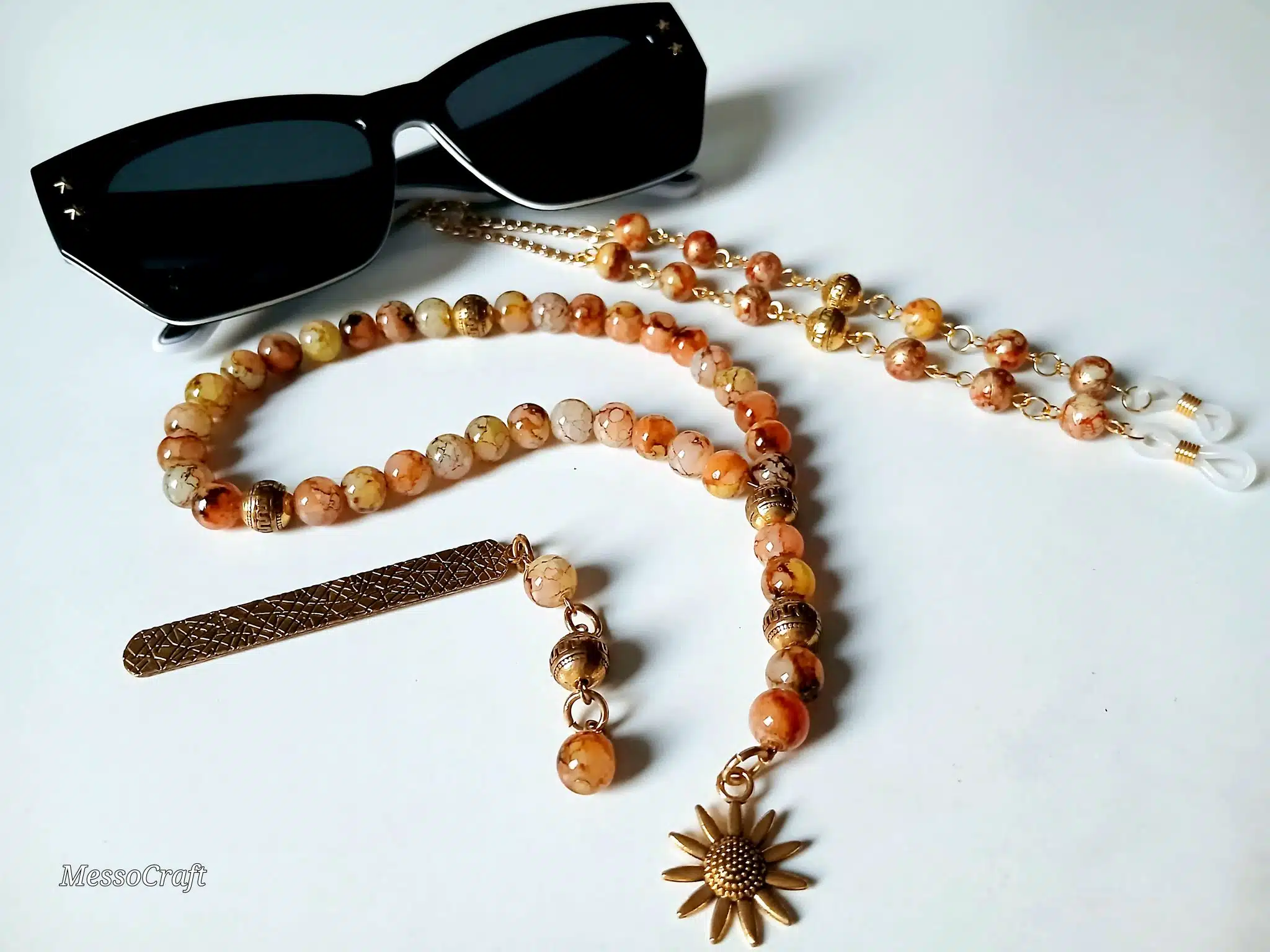 3 pcs set of 33 beads sepha, glasses chain and bookmark made of mix brownish orange alabaster stones, a unique golden sunflower pendant