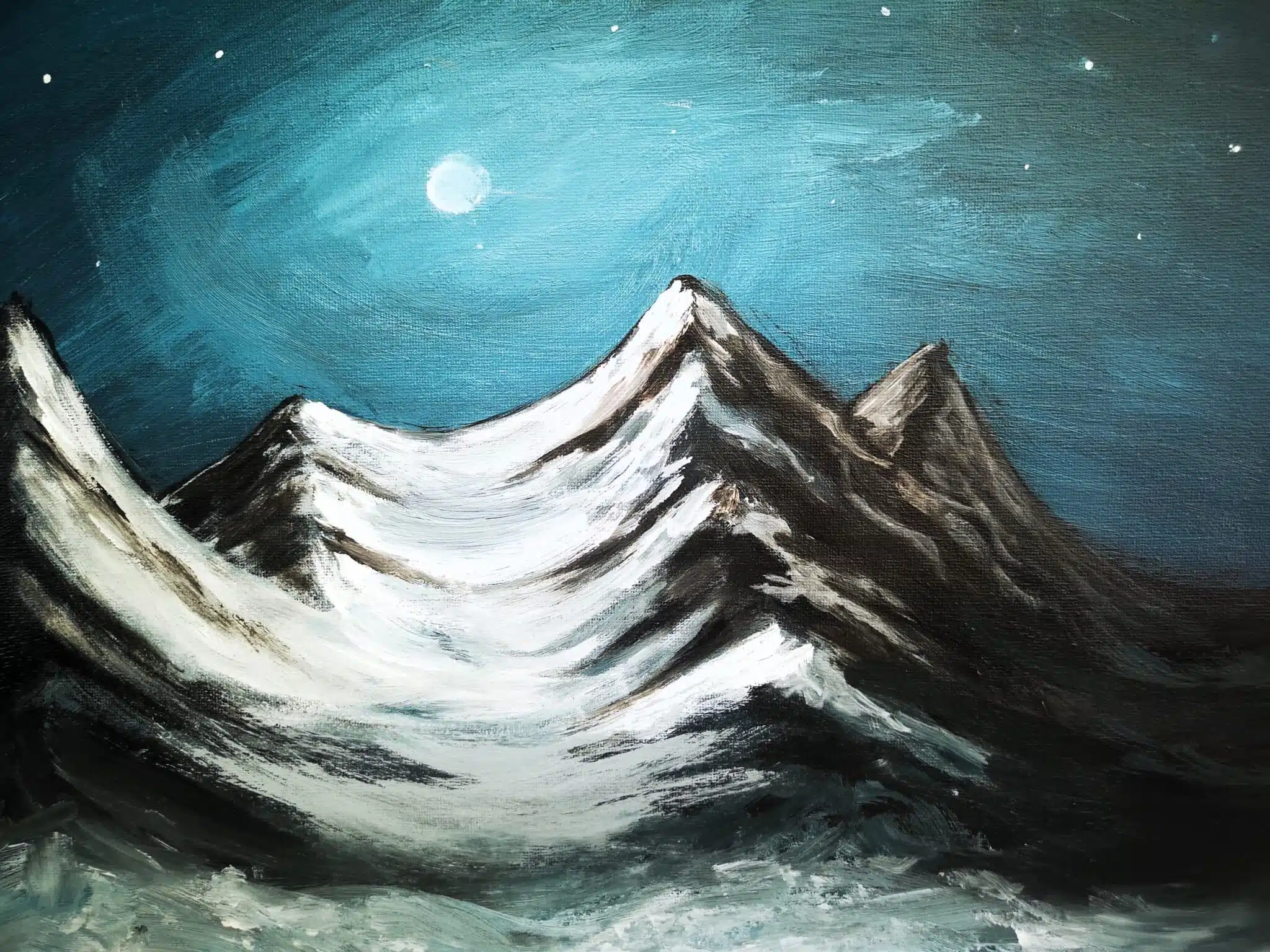 This is an acrylic painting of moonlight shining on snowy mountains.