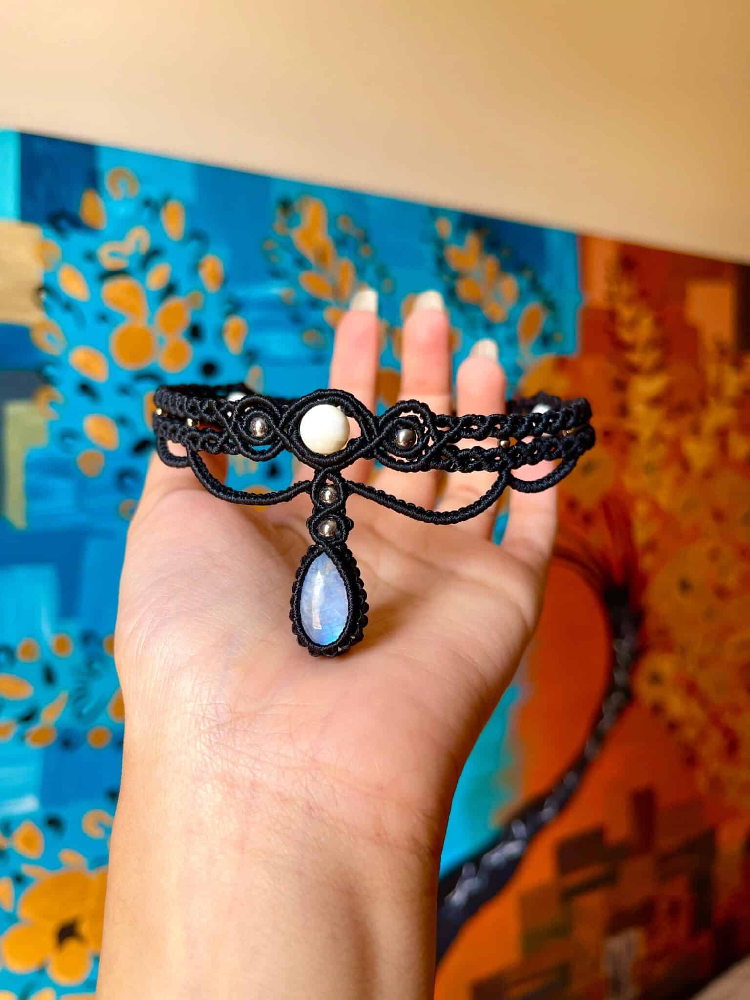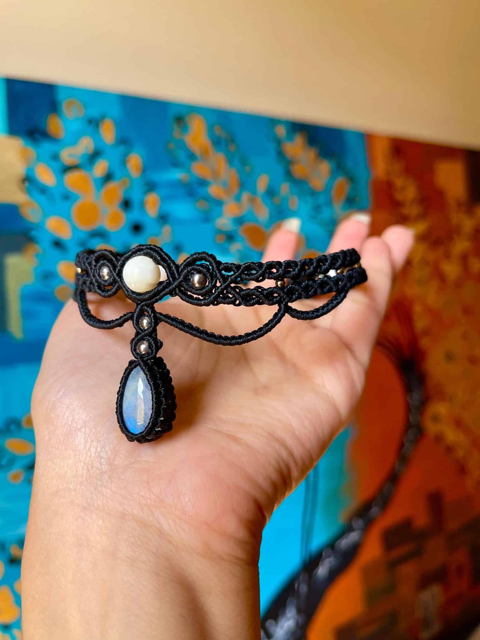 A Handmade adjustable necklace created with Moonstone, mother of pearls main beads and hematite surrounded by black cords.