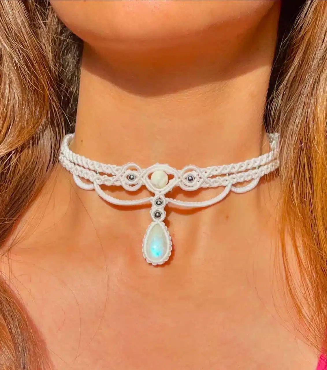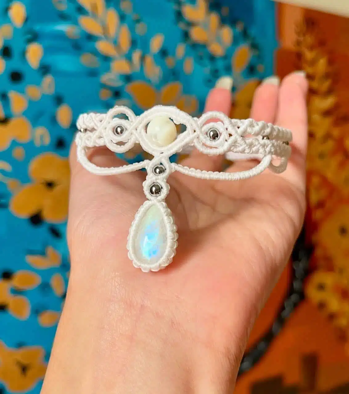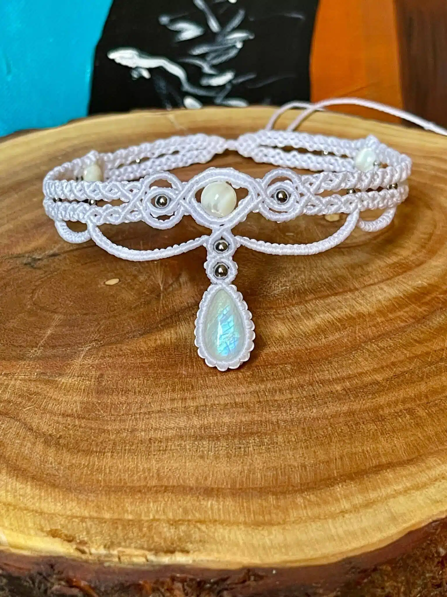 A Handmade adjustable necklace created with Moonstone, mother of pearls main beads and hematite surrounded by white cords.
