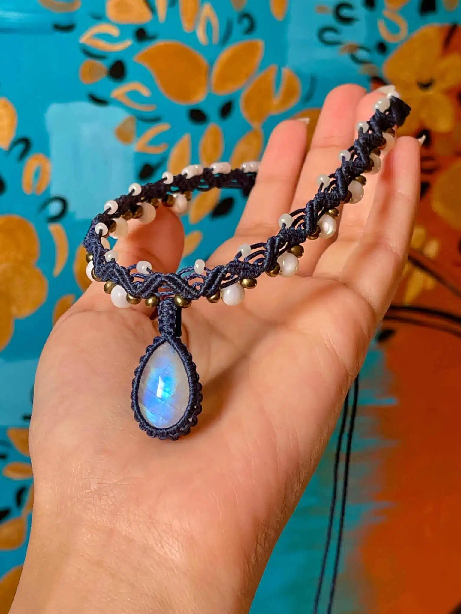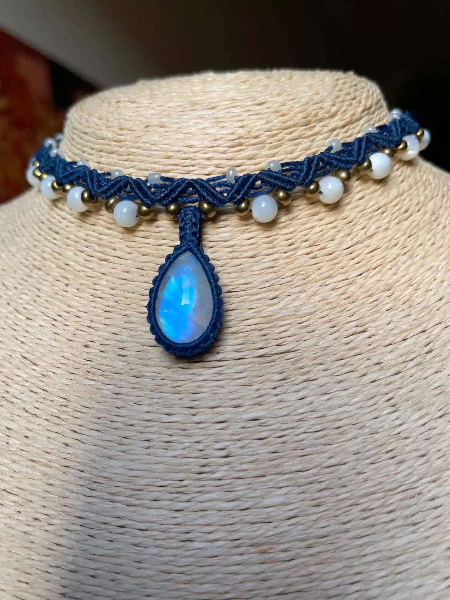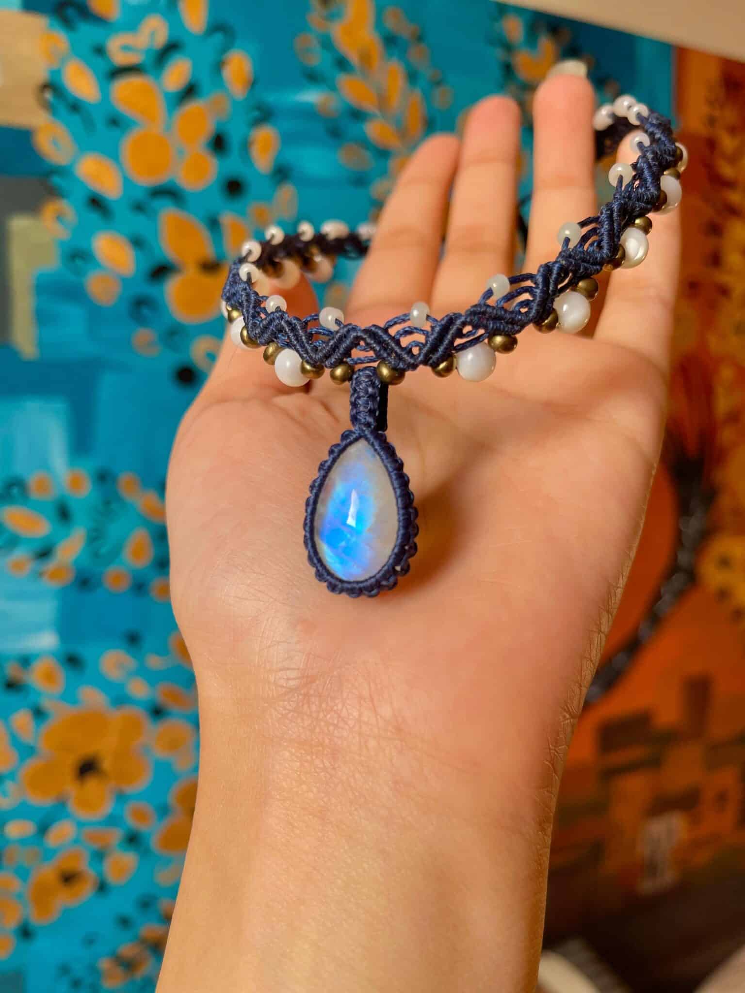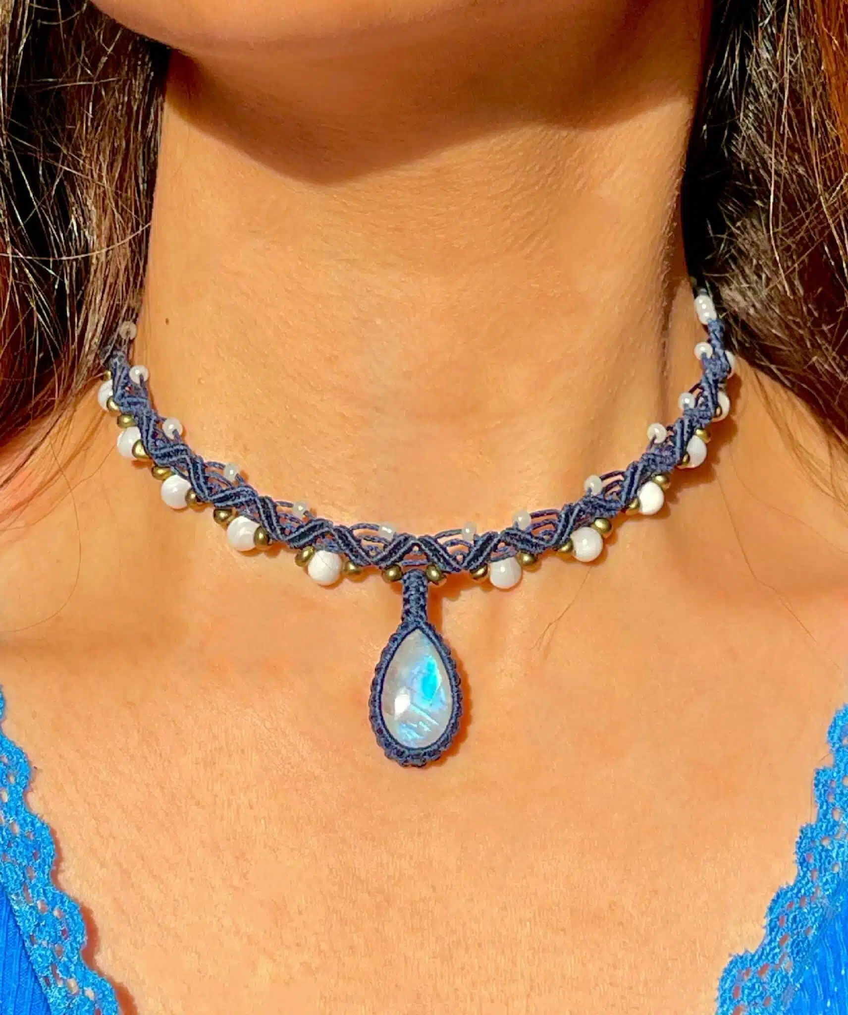 A Handmade adjustable necklace created with Moonstone as Main Crystal and Mother Of Pearls beads on the sides woven by Navy cords.