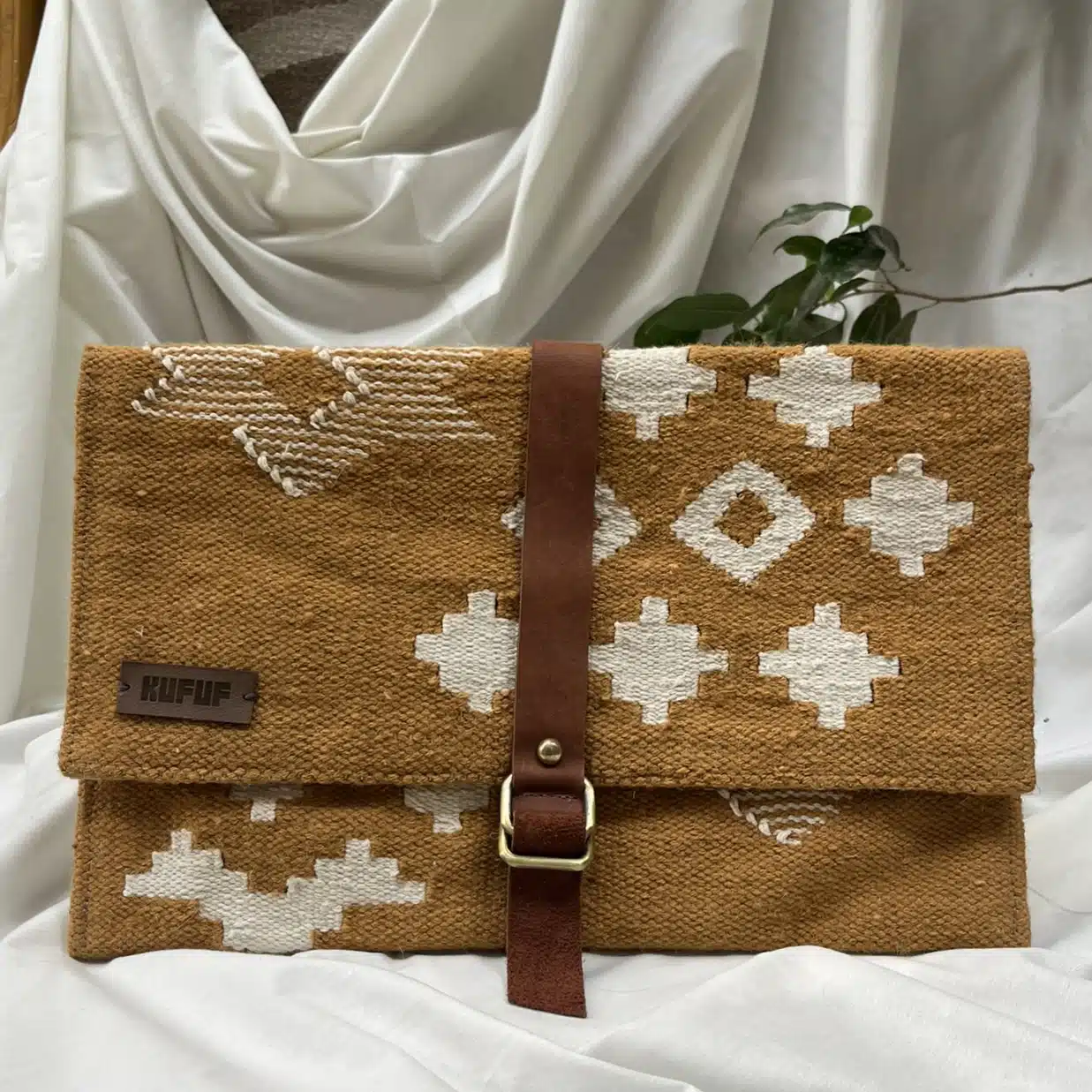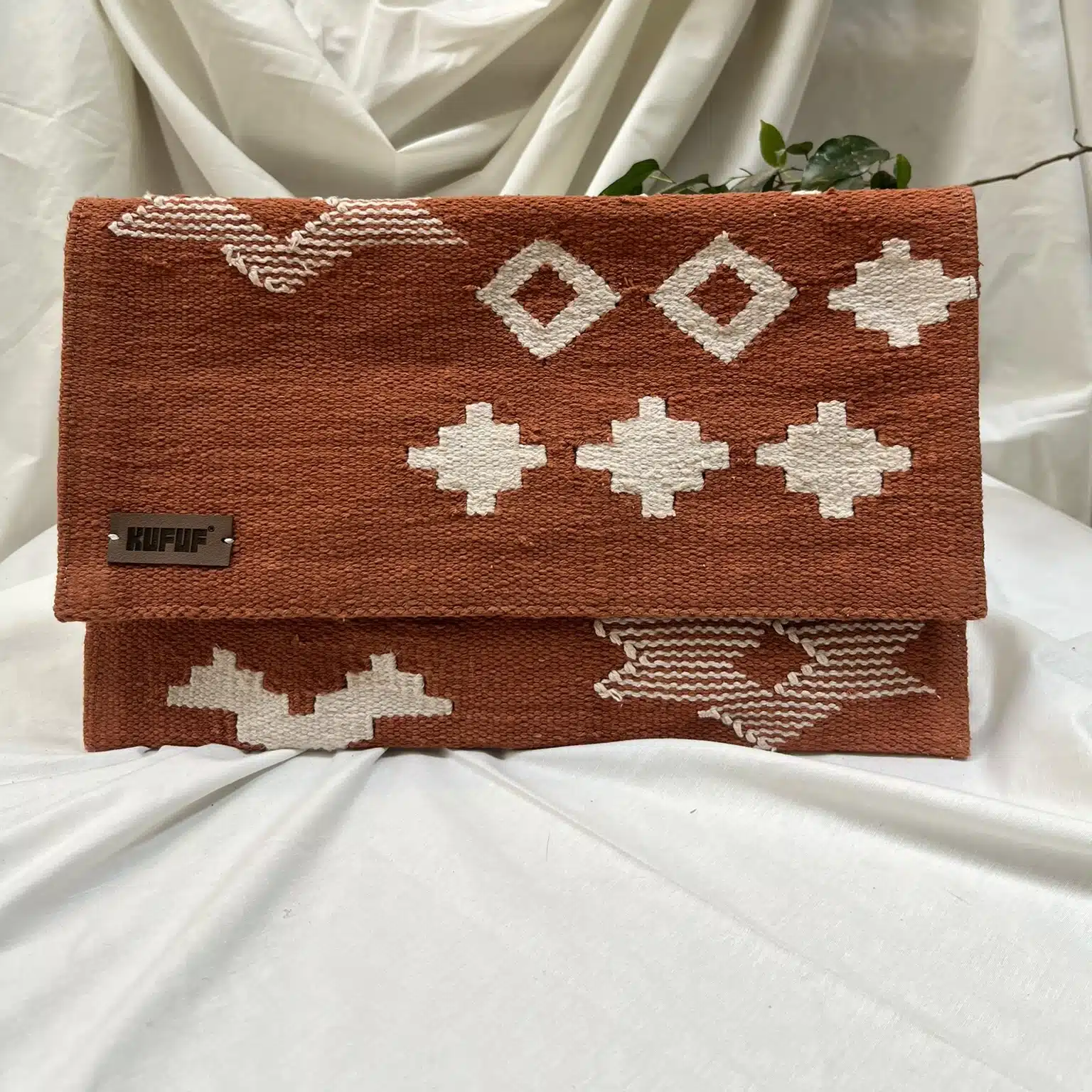 clutch bag with a handcrafted cotton kilim exterior