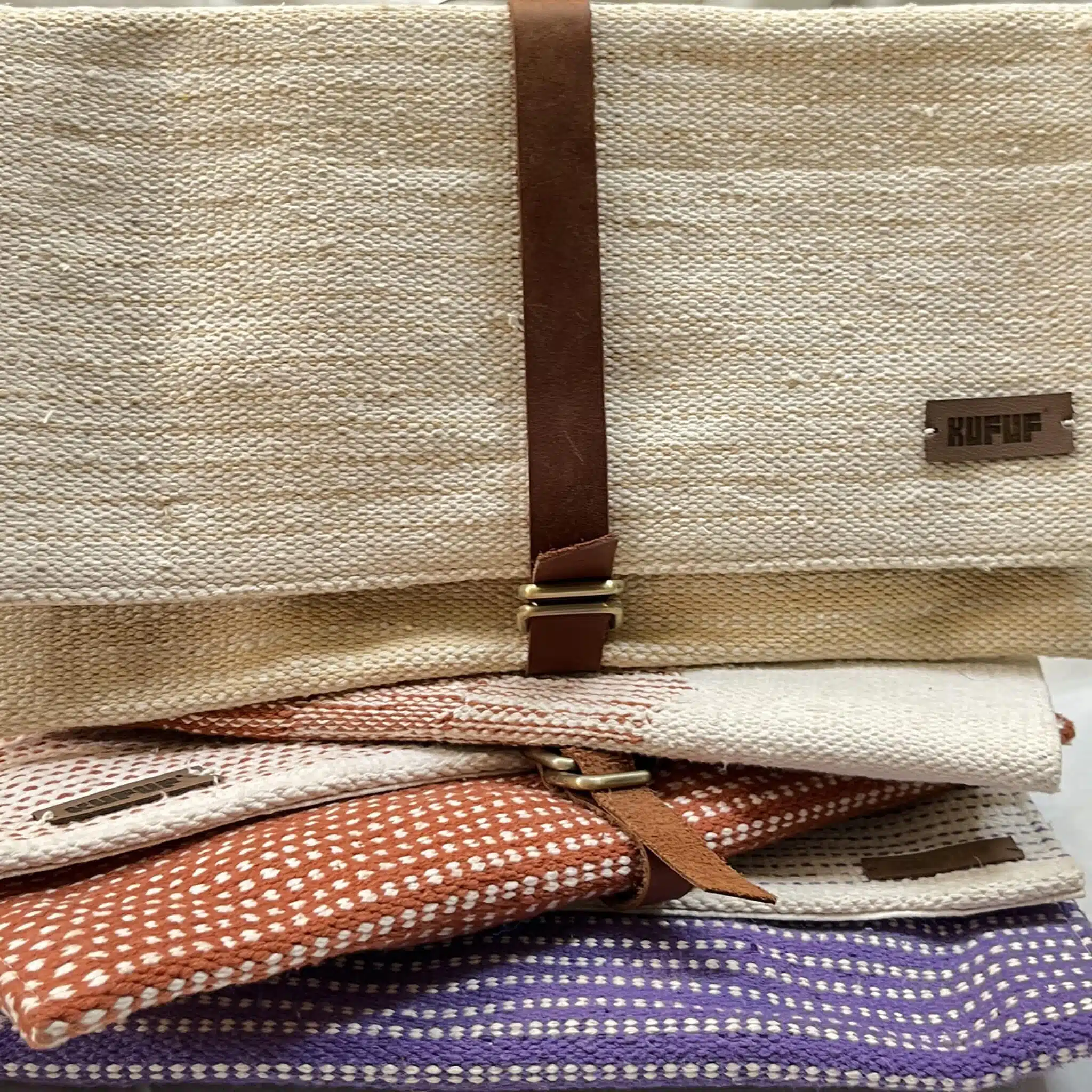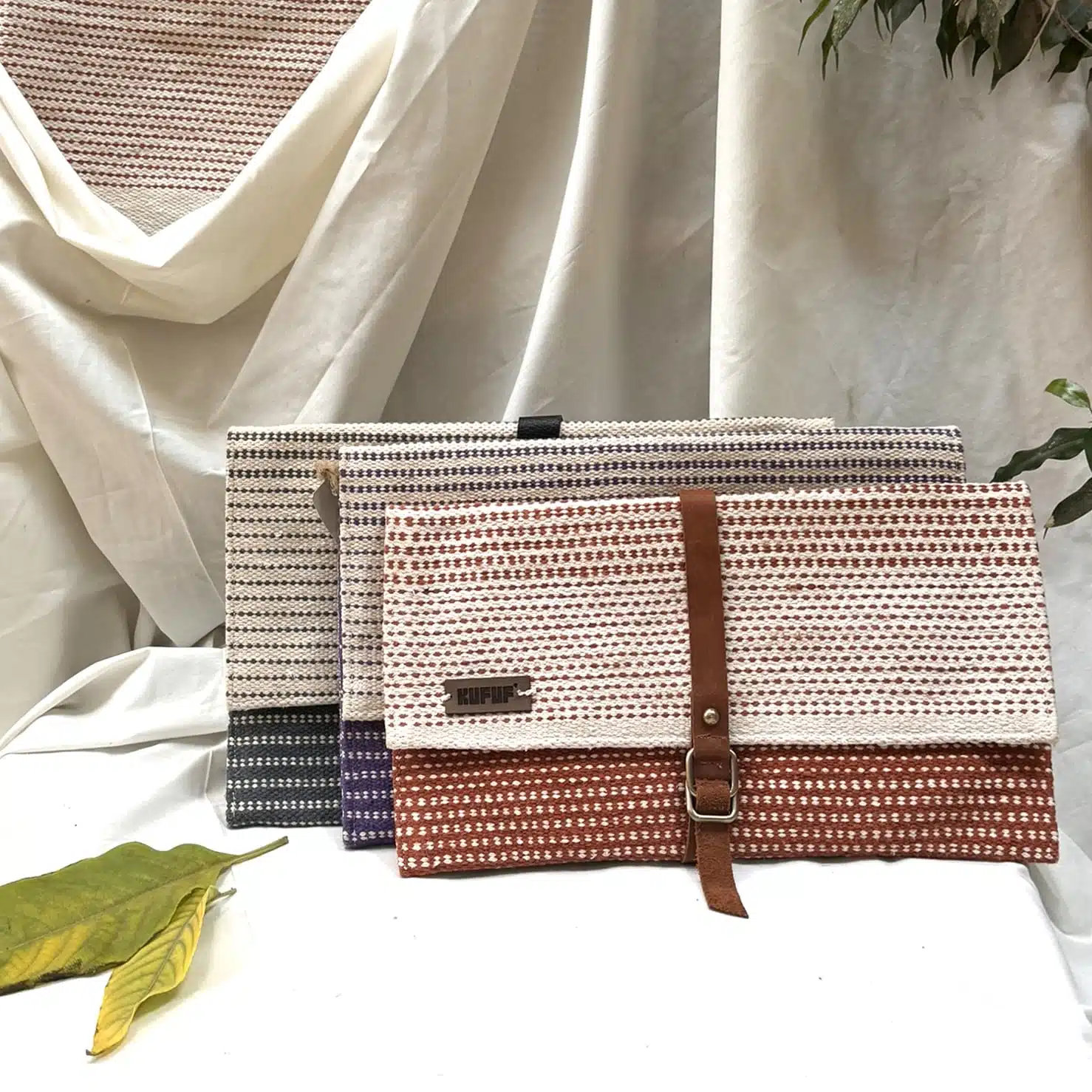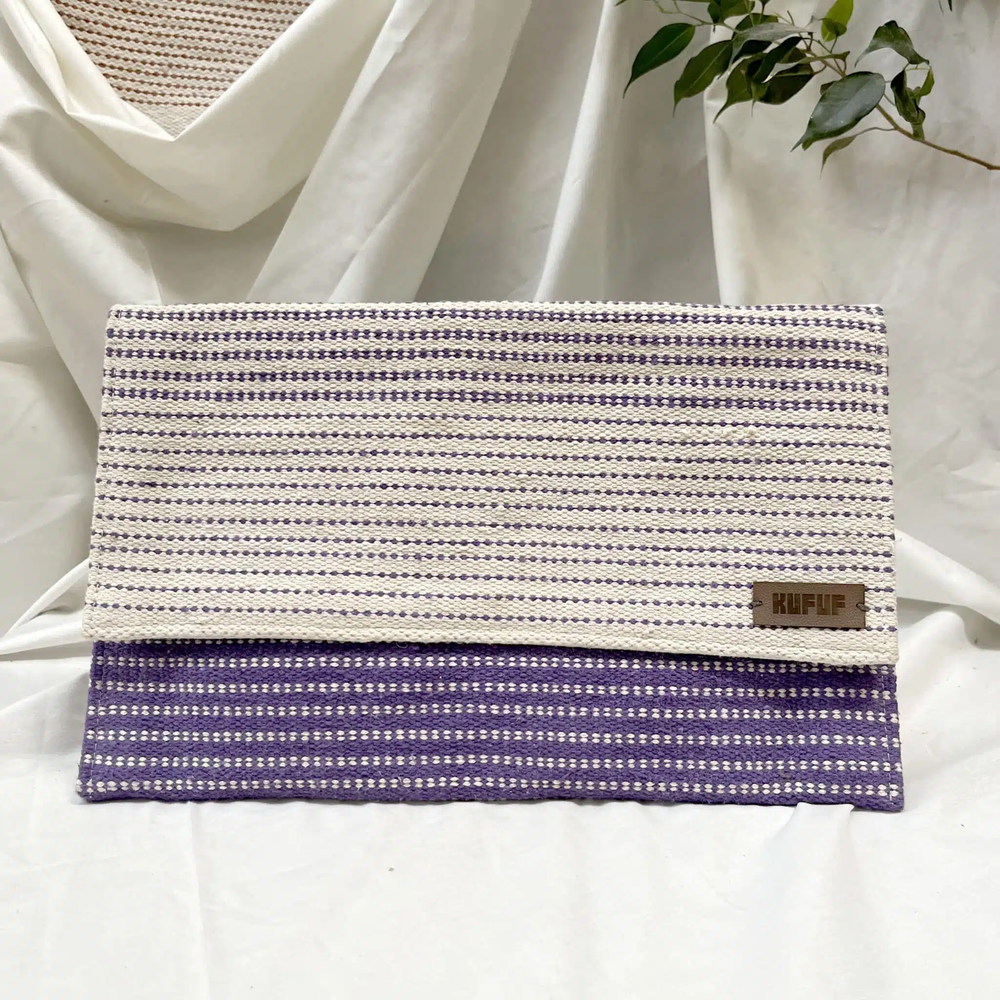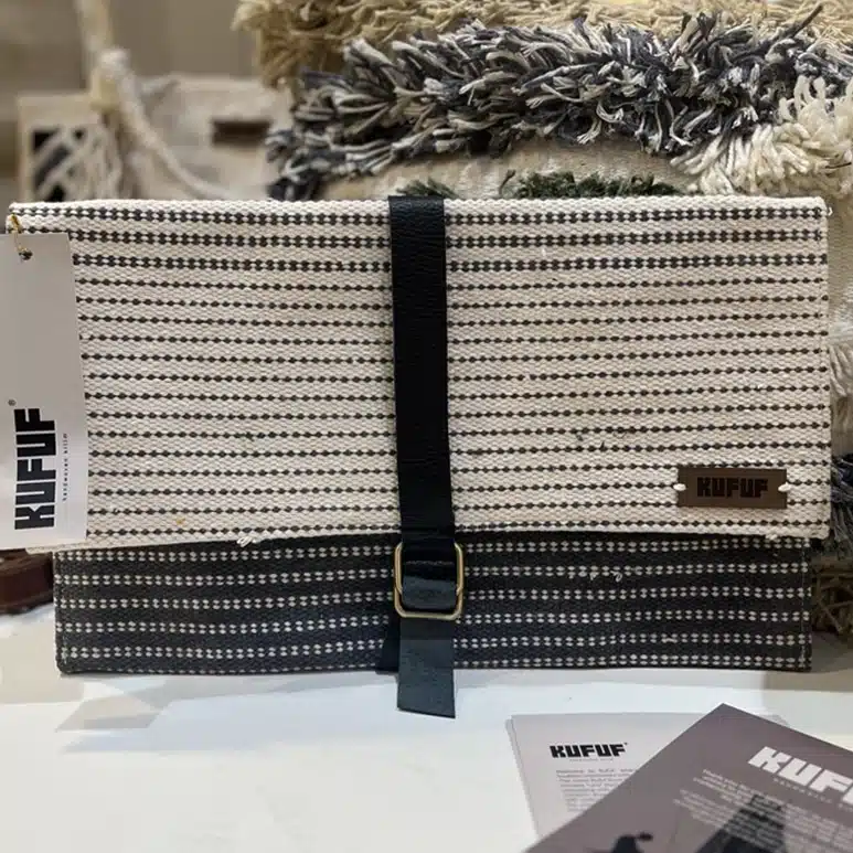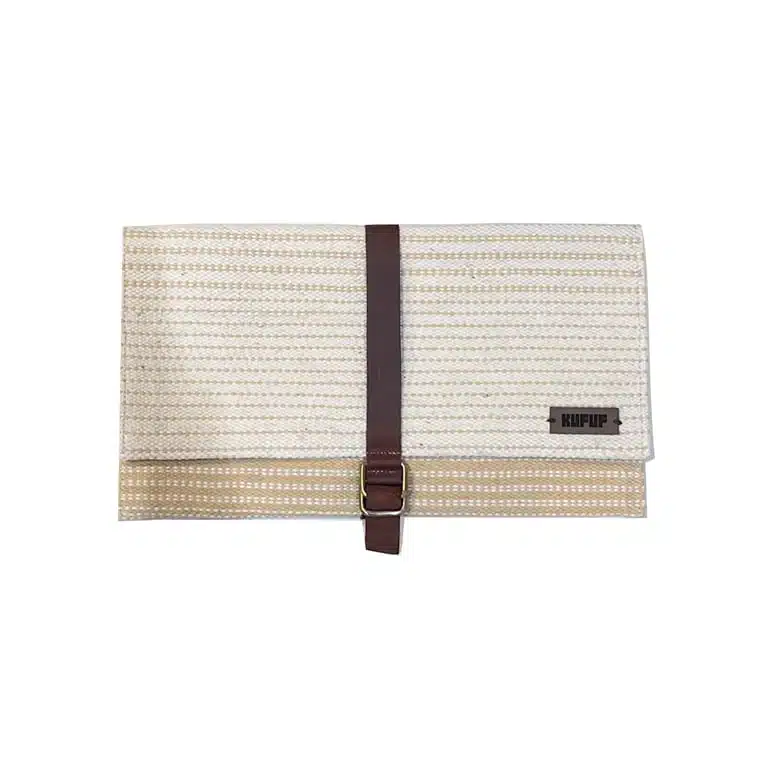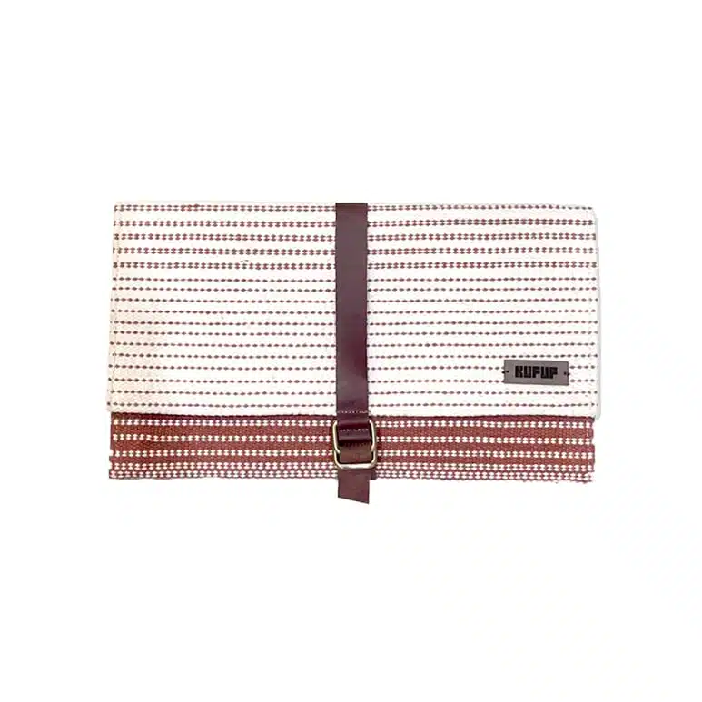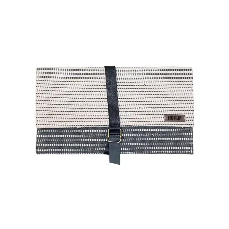 A clutch bag with a handcrafted cotton kilim exterior, and a natural leather cover, opens to a fabric-lined interior with an easy-to-access zipped pocket.