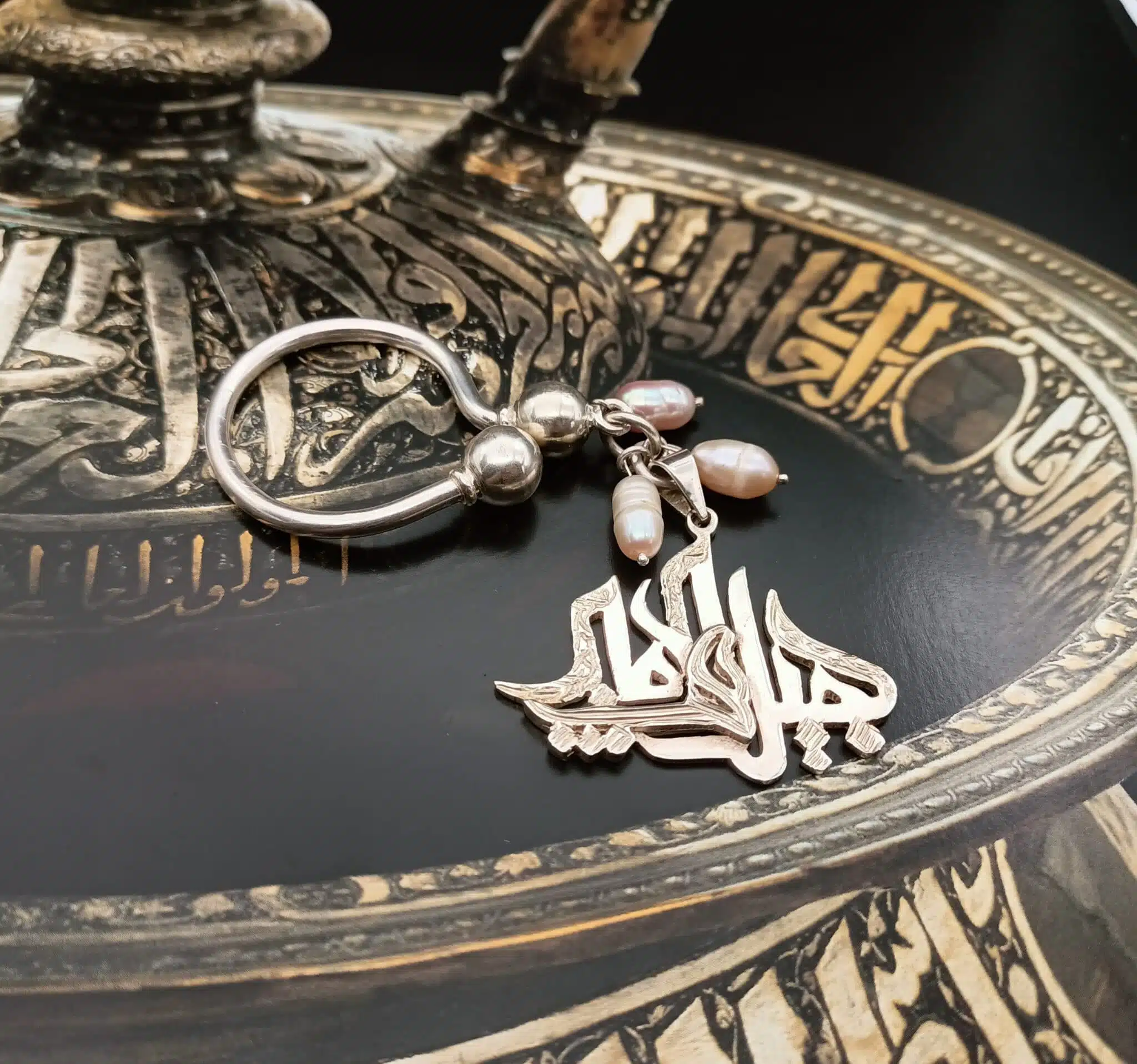 ميدالية من الفضة الخالصة واللؤلؤ الطبيعي كتب فيها : جميل يحب الجمال