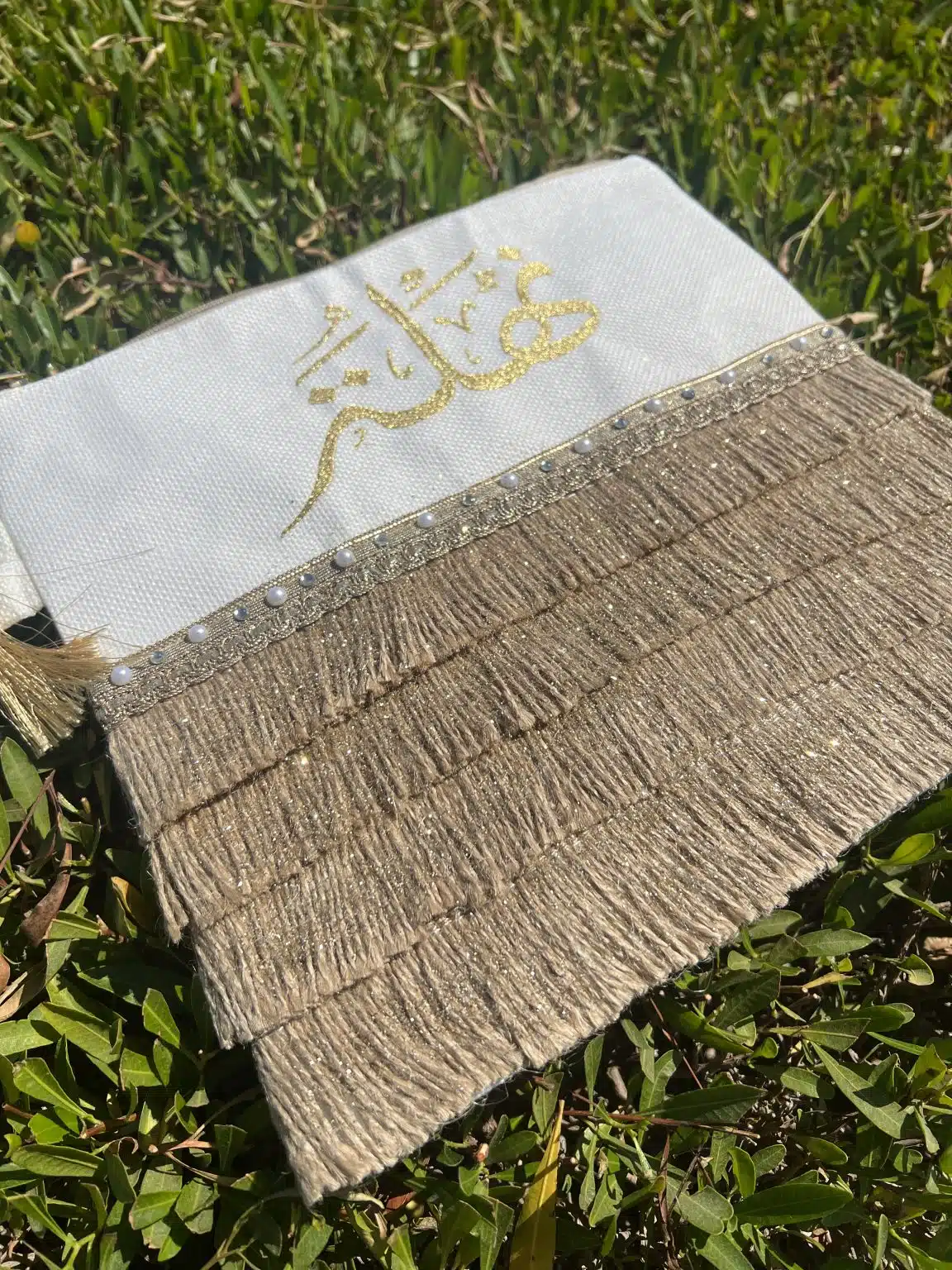 With its soft white and gold details, **Nahla** embodies elegance and simplicity. The delicate calligraphy, shimmering accents, and textured fringe create a unique and timeless piece, perfect for any special occasion.
