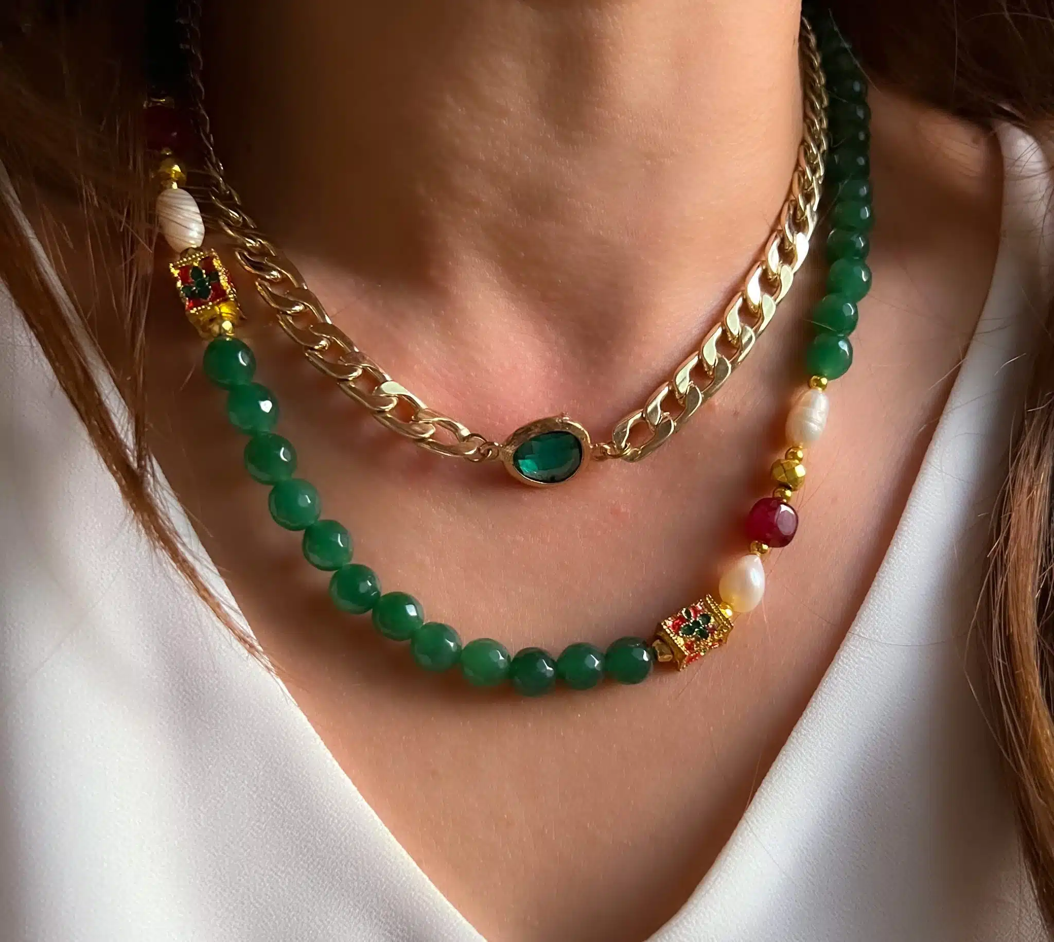 Fresh Water pearls , Green agate , Indian separators gold plated chains .