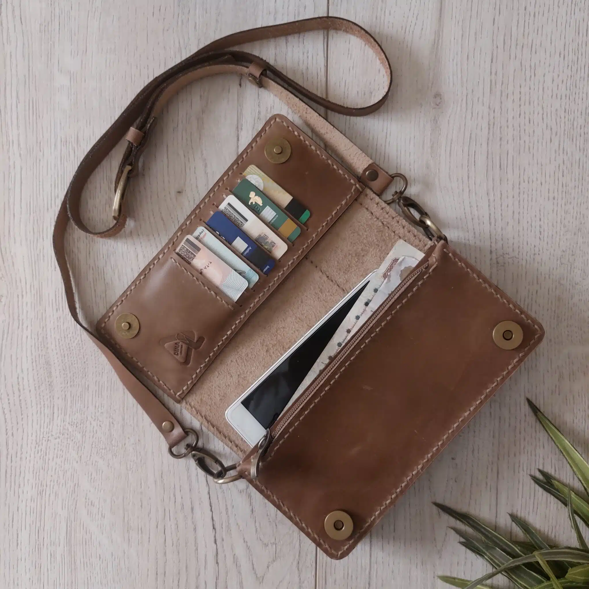 تحتوي على جيب للموبايل  و جيب للعملة الورقية وجيب بسوستة و٥ جيب للكروت