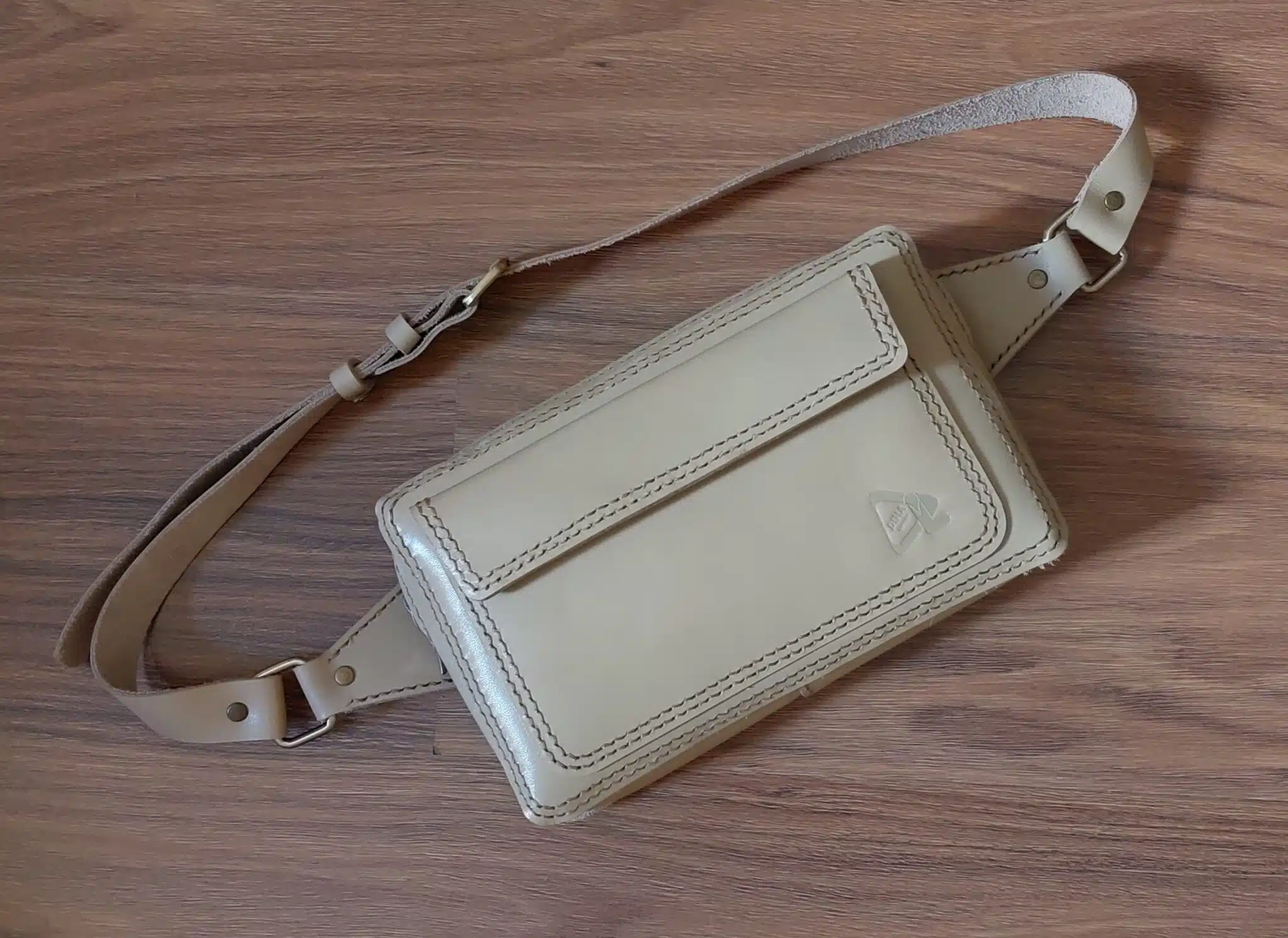 Handmade natural leather belt bag with a distinctive design, with a flap pocket on the front, beige color,size 24cm and 14cm