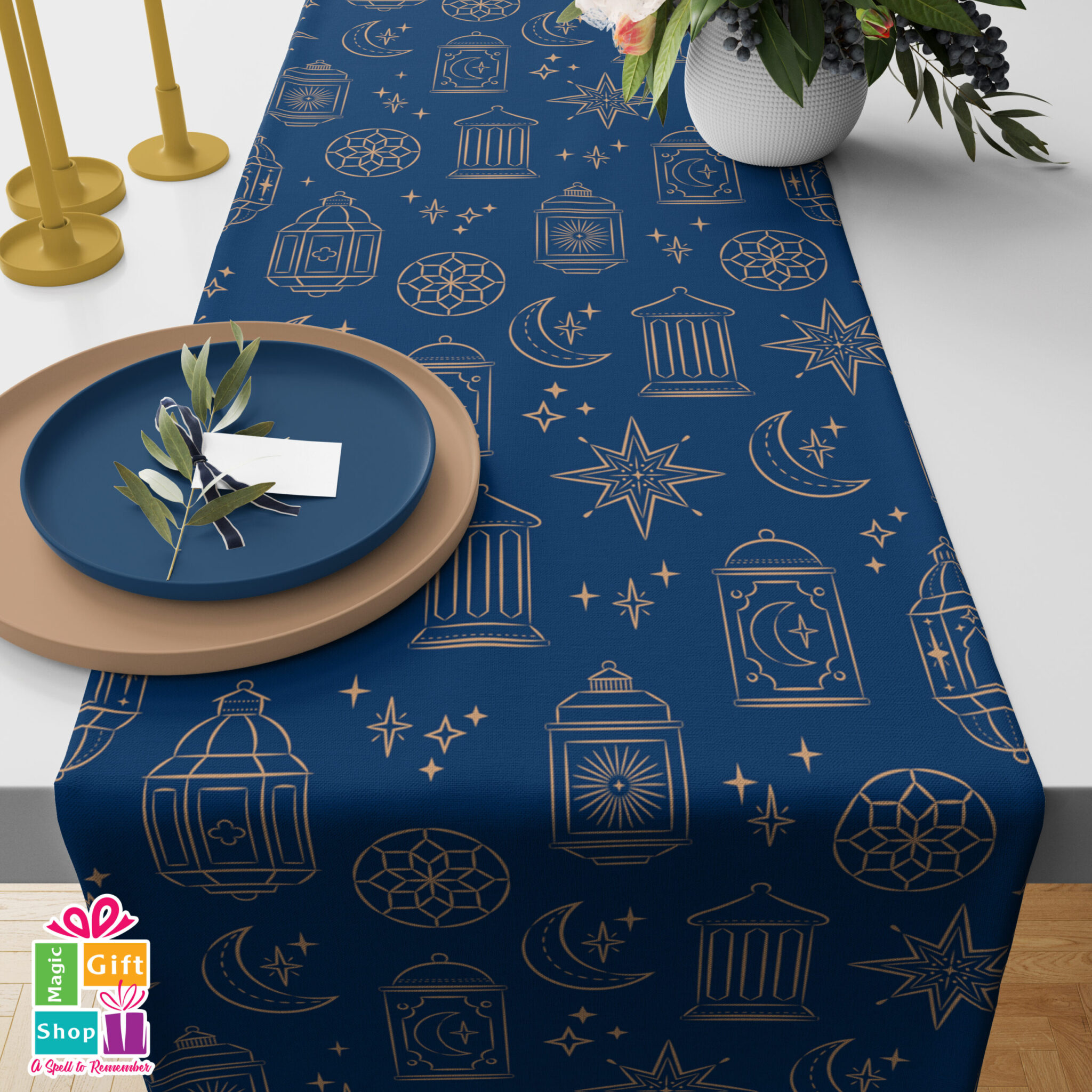 Navy with gold lantern pattern for Ramadan (runner-tablecloth-cushion)
