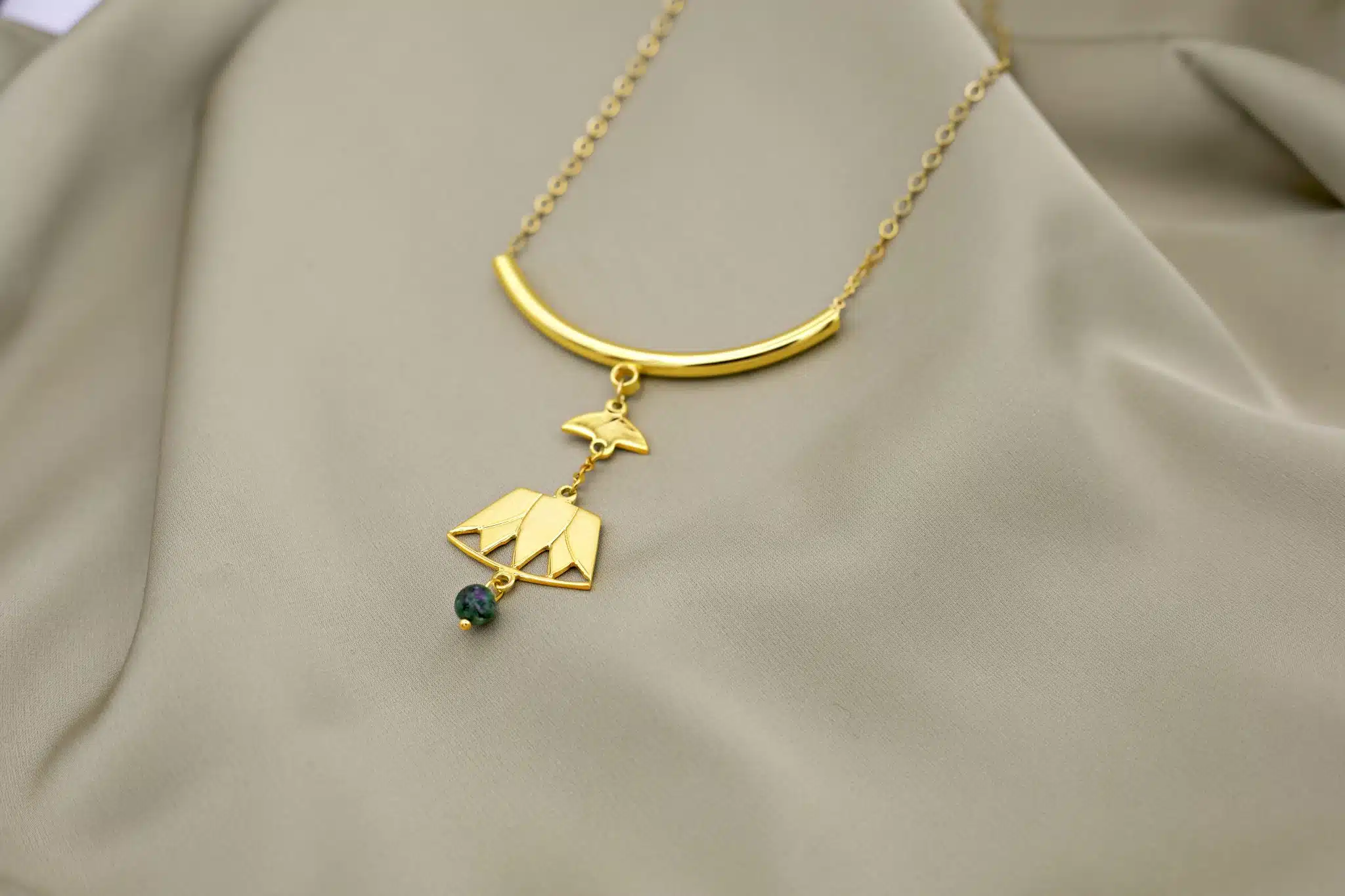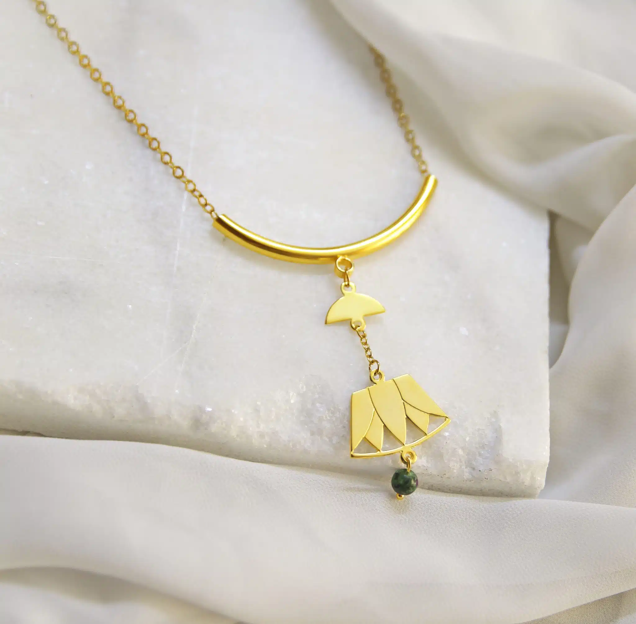 The Lily necklace, Inspired by The Lotus Flower ancient Egyptian Symbol by the designer “Toka Nabil”. Material: Brass 21K Gold plated with a very high quality, Green Agate Stone. hand made. Pre order will Take from 3-8 Days. No REFUND or EXCHANGE.