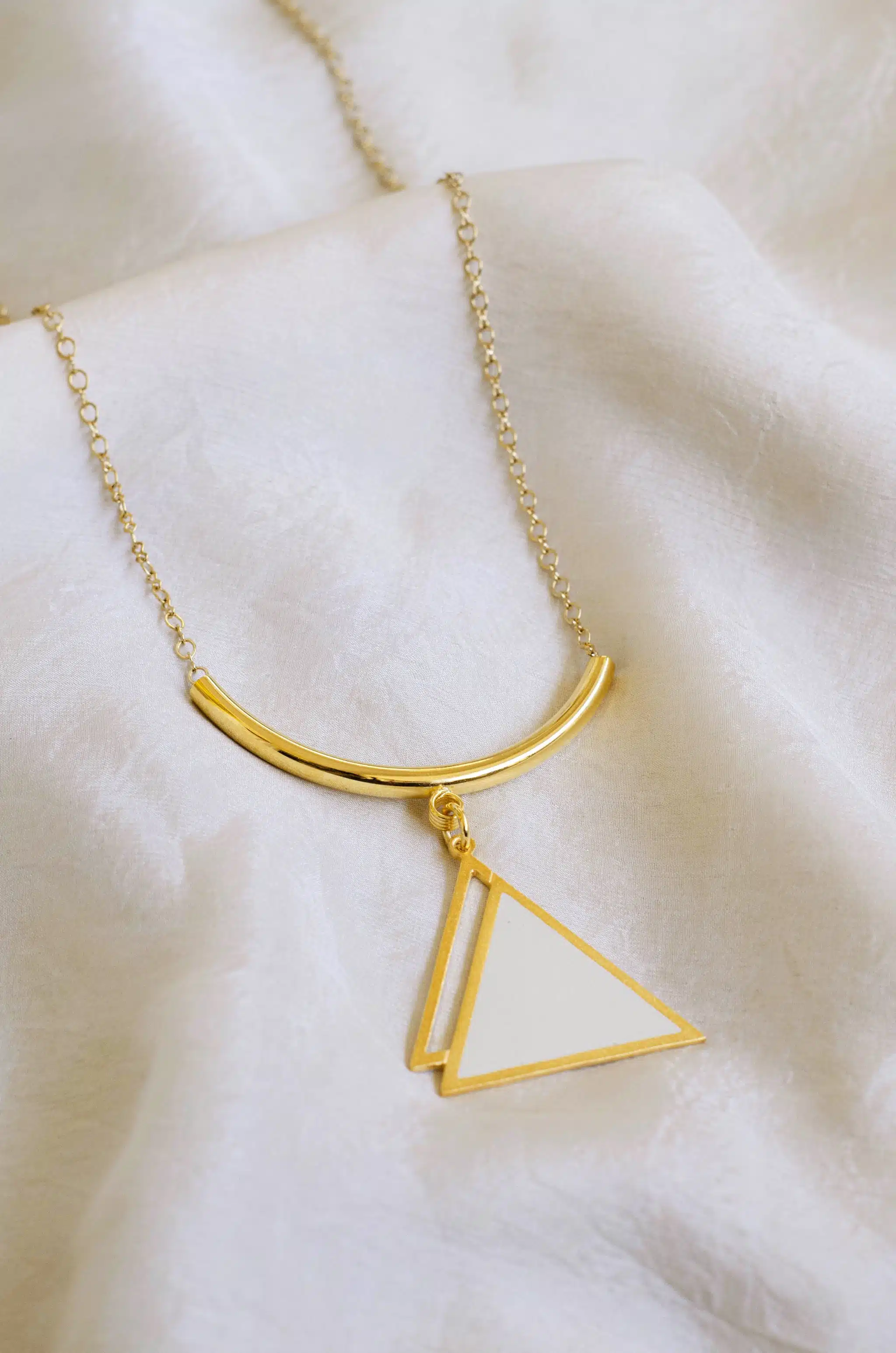 The Pearl Tuya necklace , Inspired by The Great Egyptian Pyramids by the designer “Toka Nabil”. Material: Brass 21K Gold plated with a very high quality, Pearl Enamel color, hand made. Pre order will Take from 3-10 Days. No REFUND or EXCHANGE.