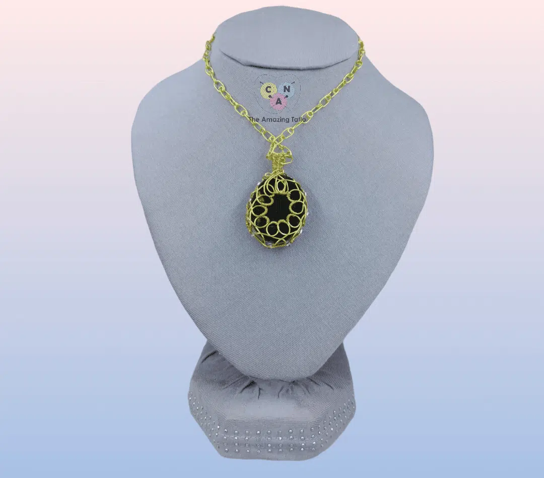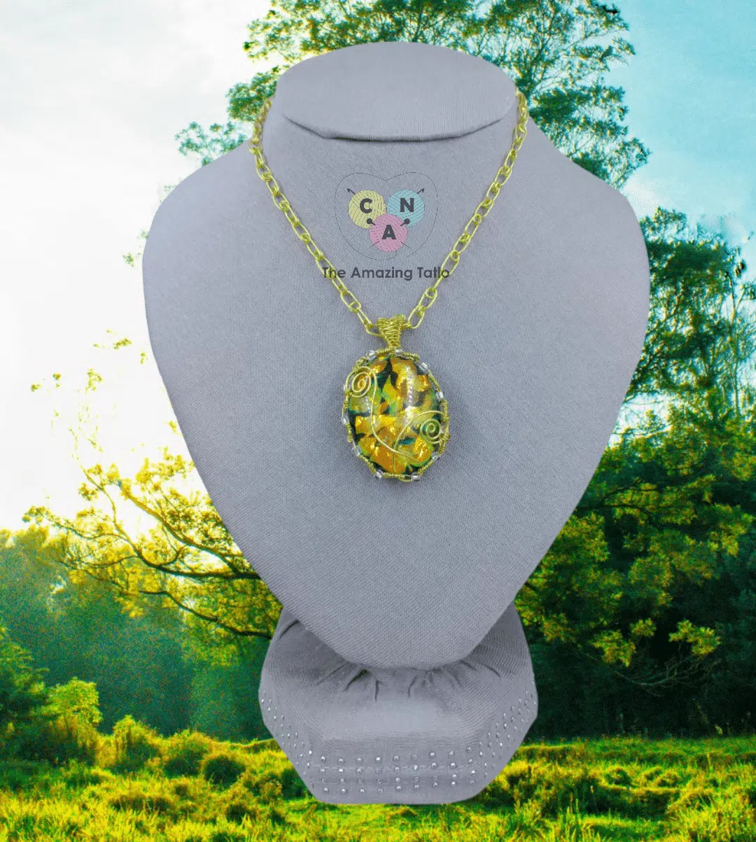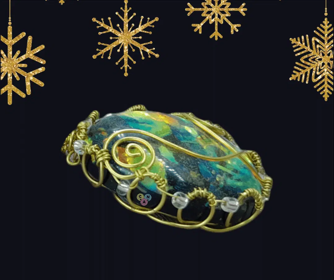 material: stone ( from epoxy resin contain sparkle sheets changing its color by light ) – surround with ( pure yellow copper wire wrapping handmade ) – little clear beads