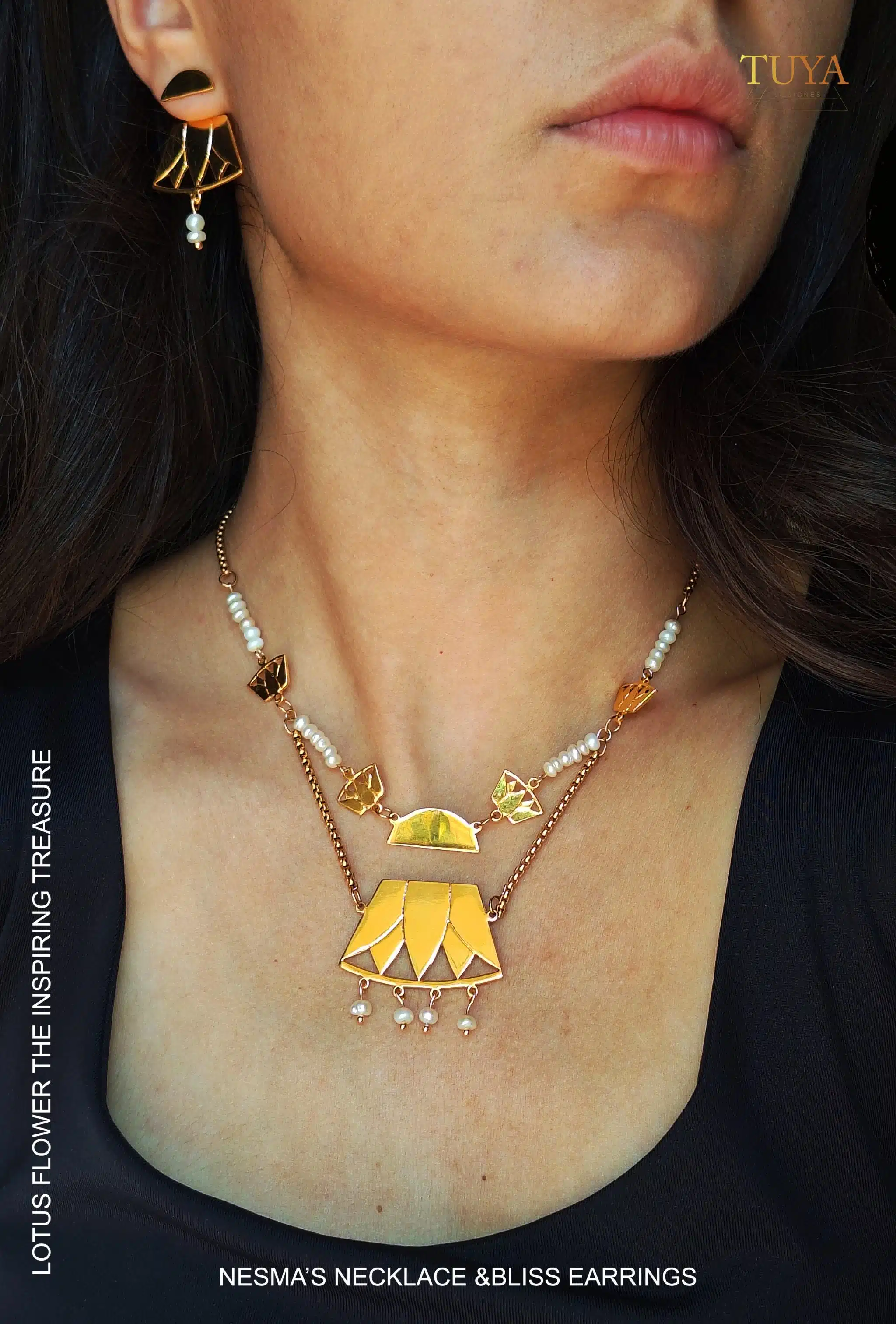 The Nesma’s necklace, Inspired by The Lotus Flower ancient Egyptian Symbol by the designer “Toka Nabil”. Material: Brass 21K Gold plated with a very high quality, Natural Pearl Stones. hand made. Pre order will Take from 3-8 Days. No REFUND or EXCHANGE.