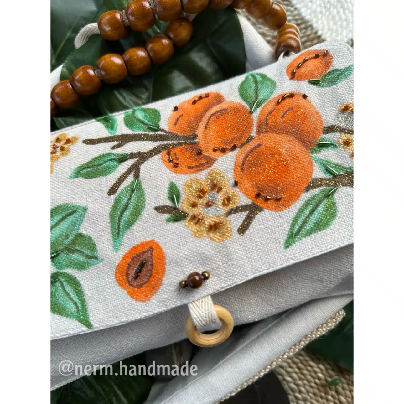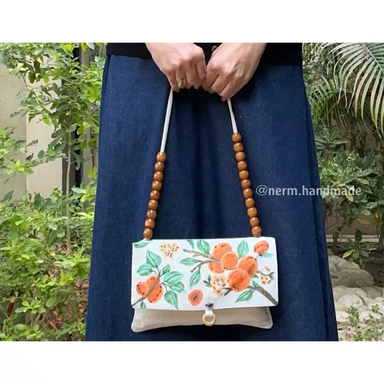 Hand painted & embroidered wooden-beaded handle bag.