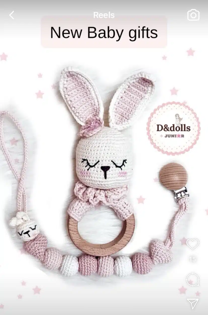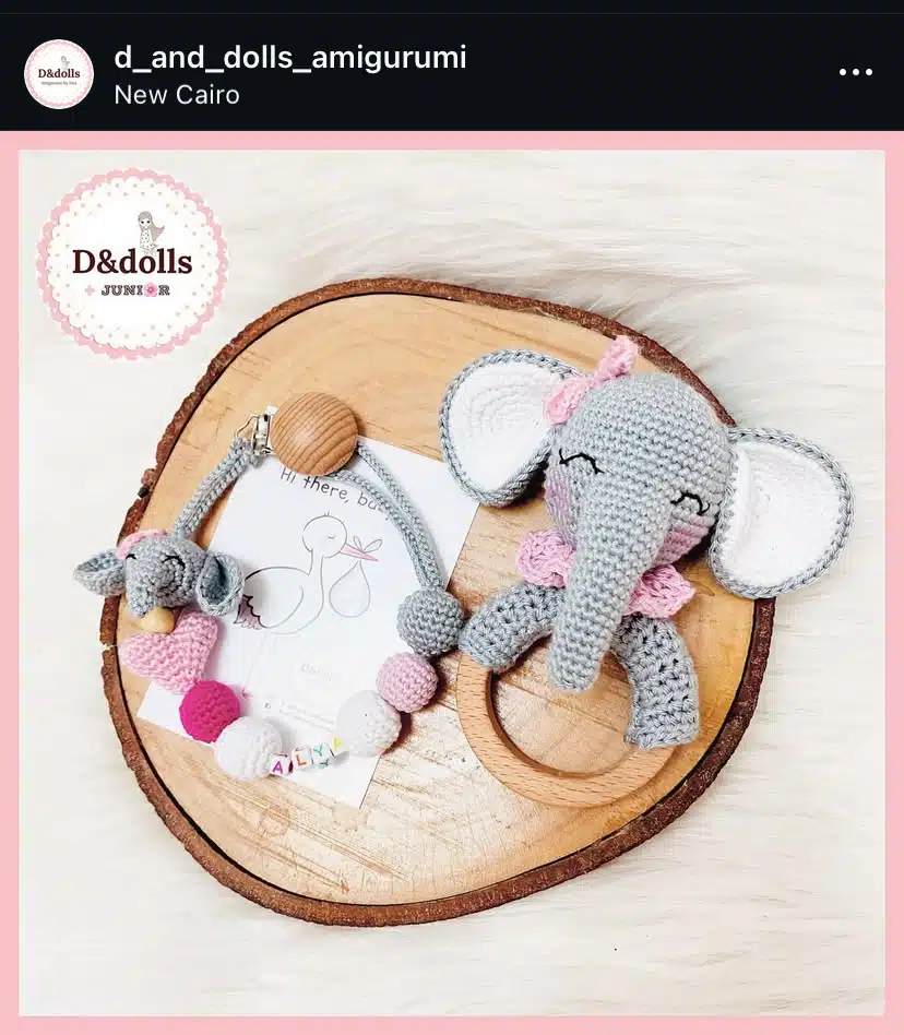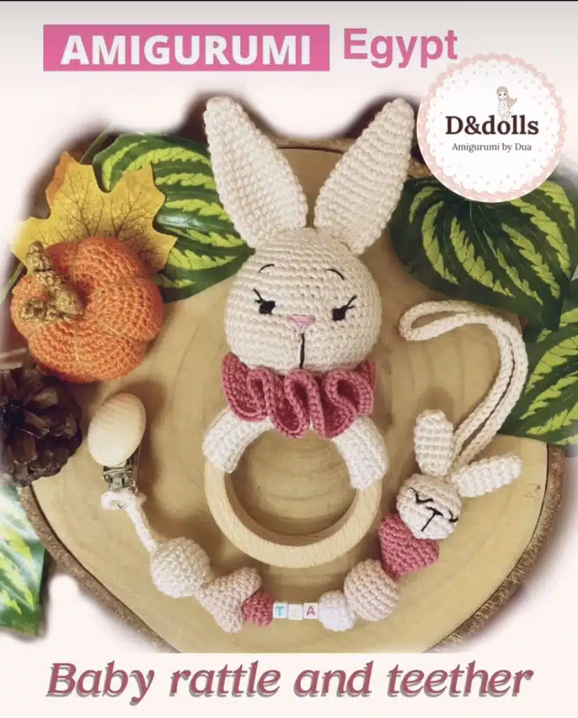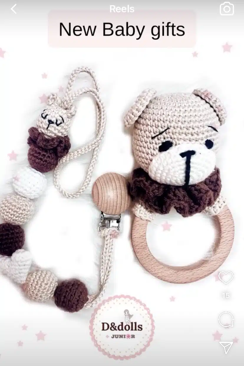 New baby gift 🎁 Baby shower sweet set, baby rattle with natural beech wood ring uses as a teether, with crochet head made of fine cotton with a noise maker. Also a pacifier clip. You can customize your set.. any figure.. any colors 💝 and you can choose a little doll too