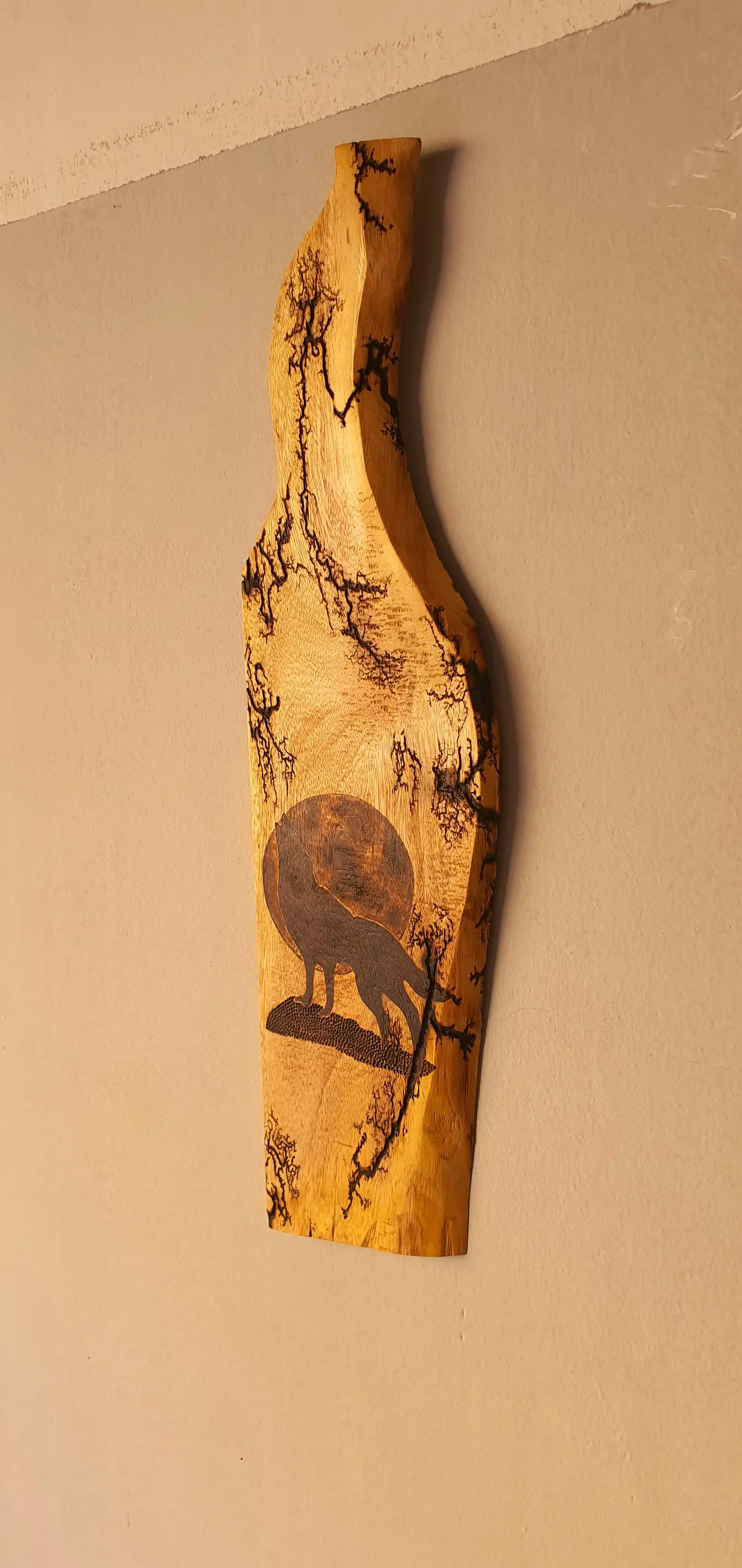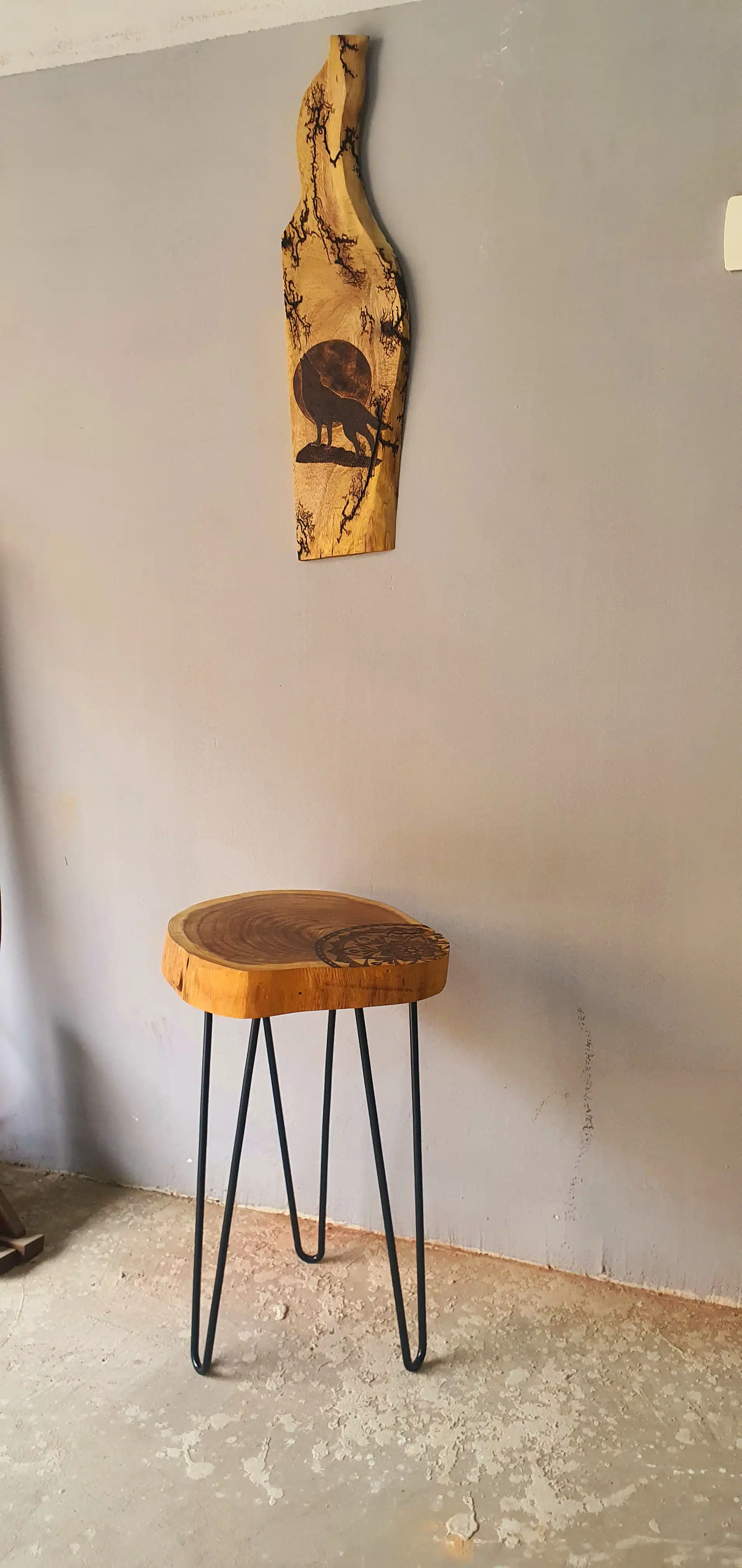 A natural tree slice of sissoo wood, featuring a unique hand-burned design, making it a captivating addition to your wall decor. Hang it in your room or office for an artistic warm display.