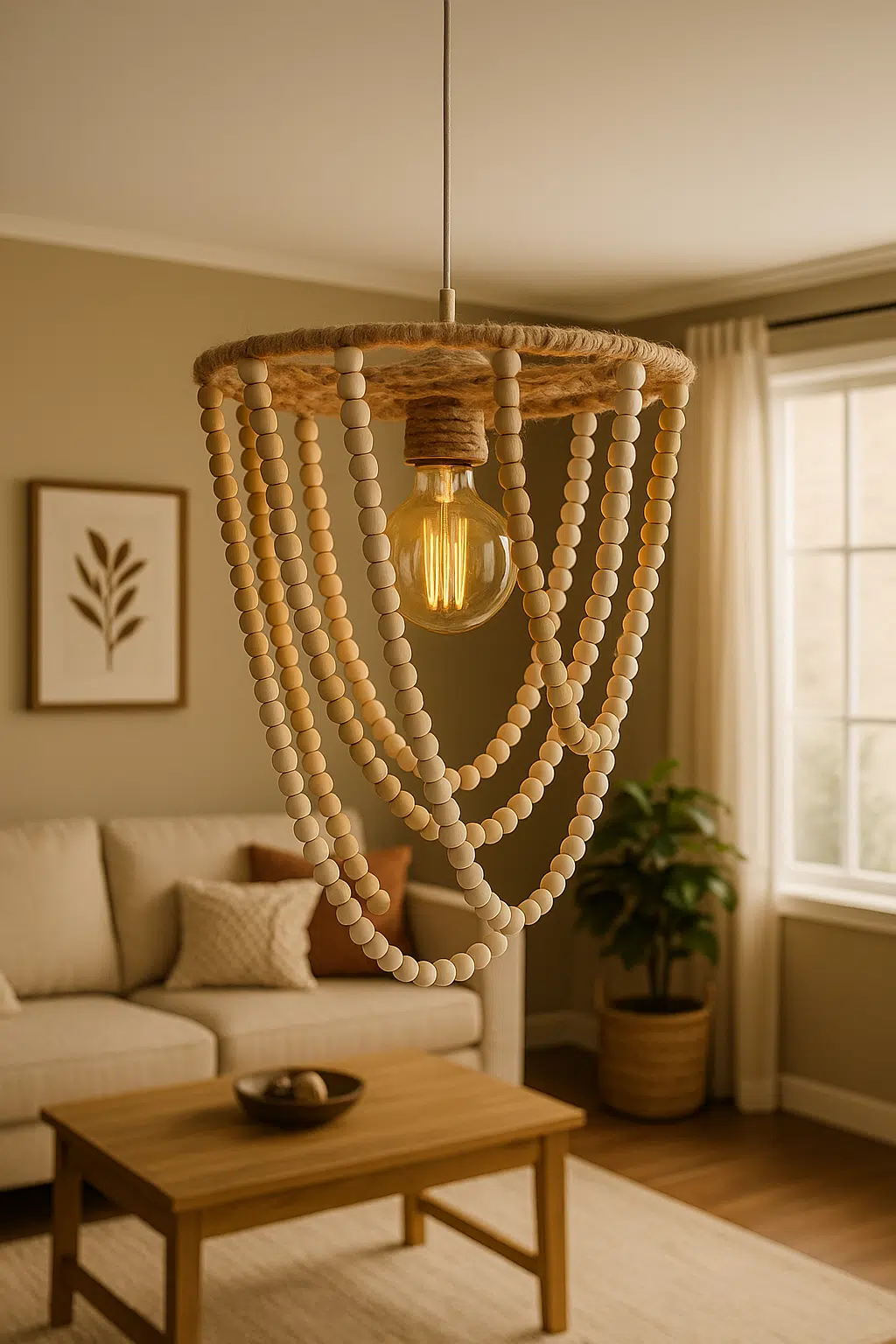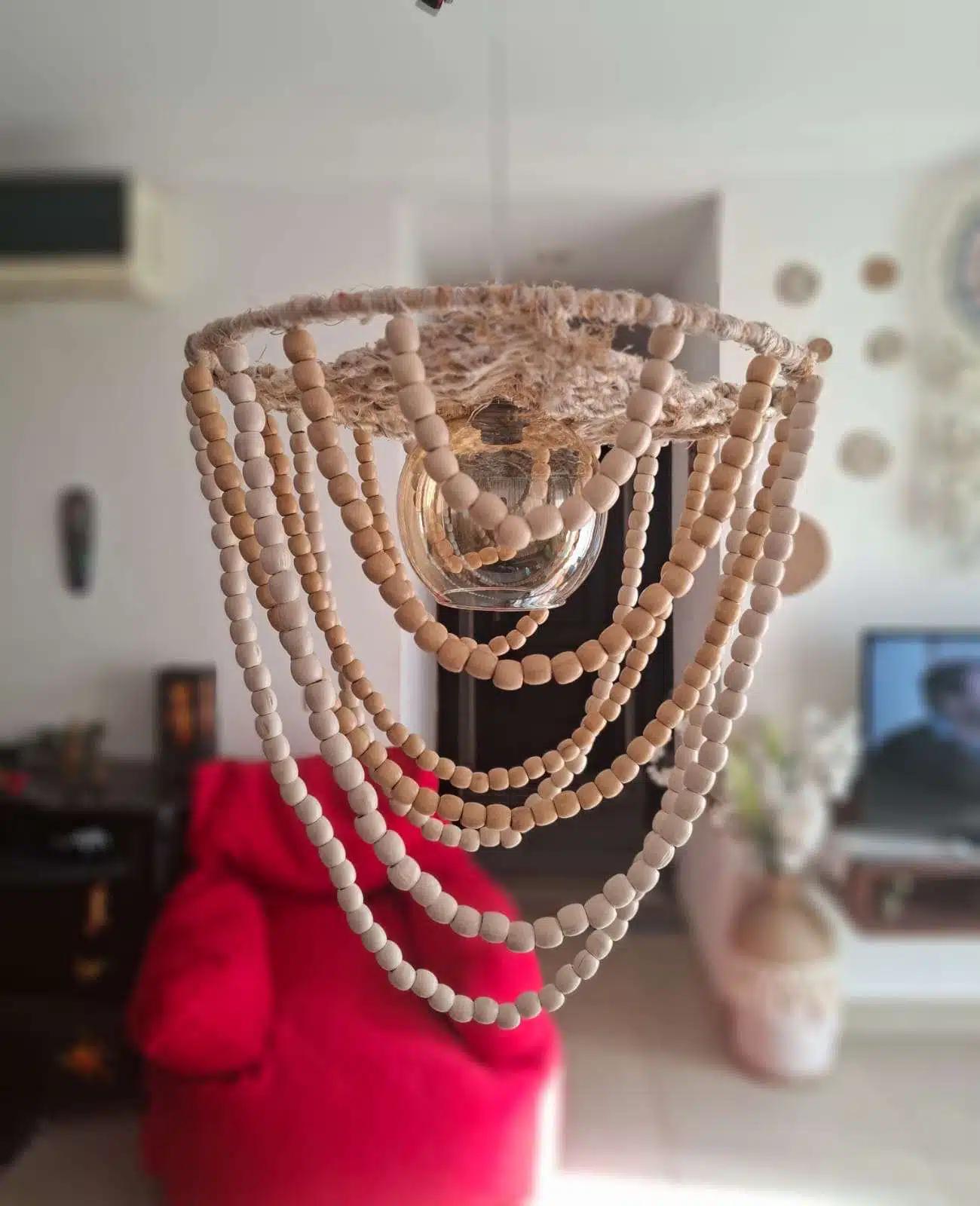 “A beaded pendant lamp that adds soft, warm light and a boho feel to any room.”