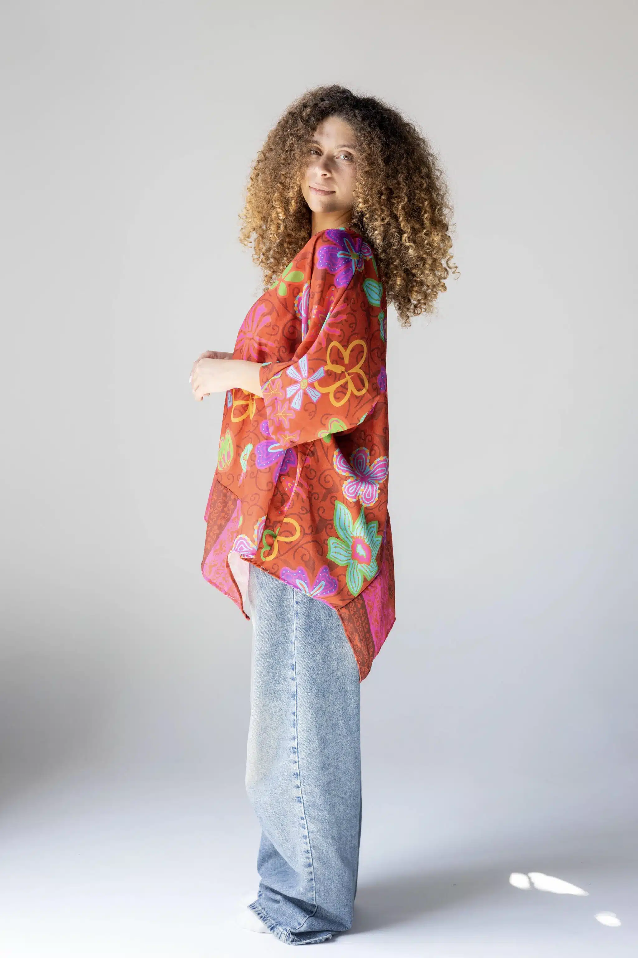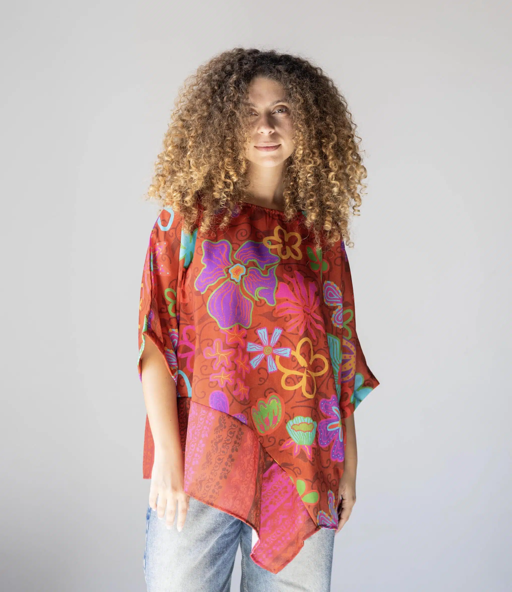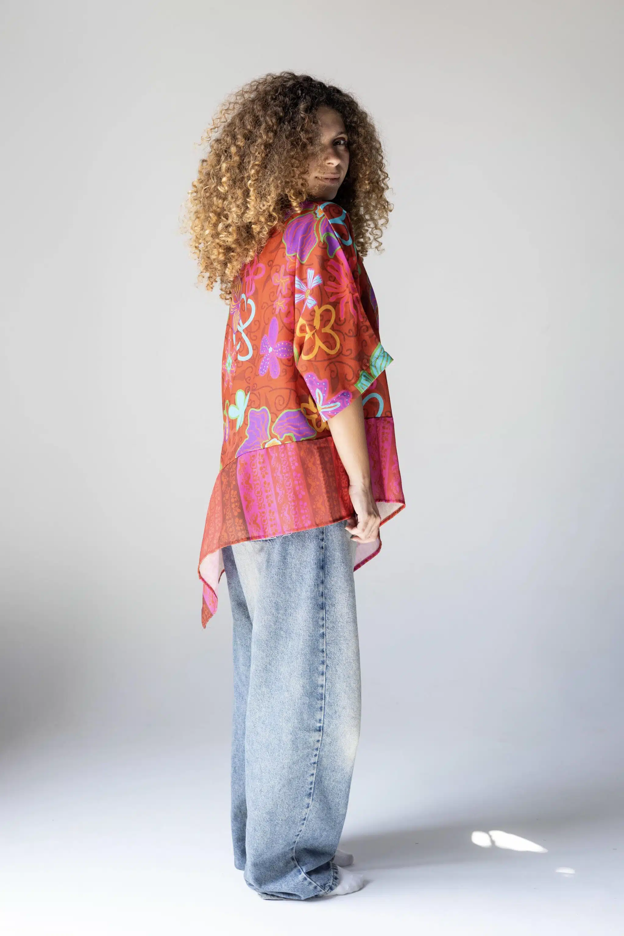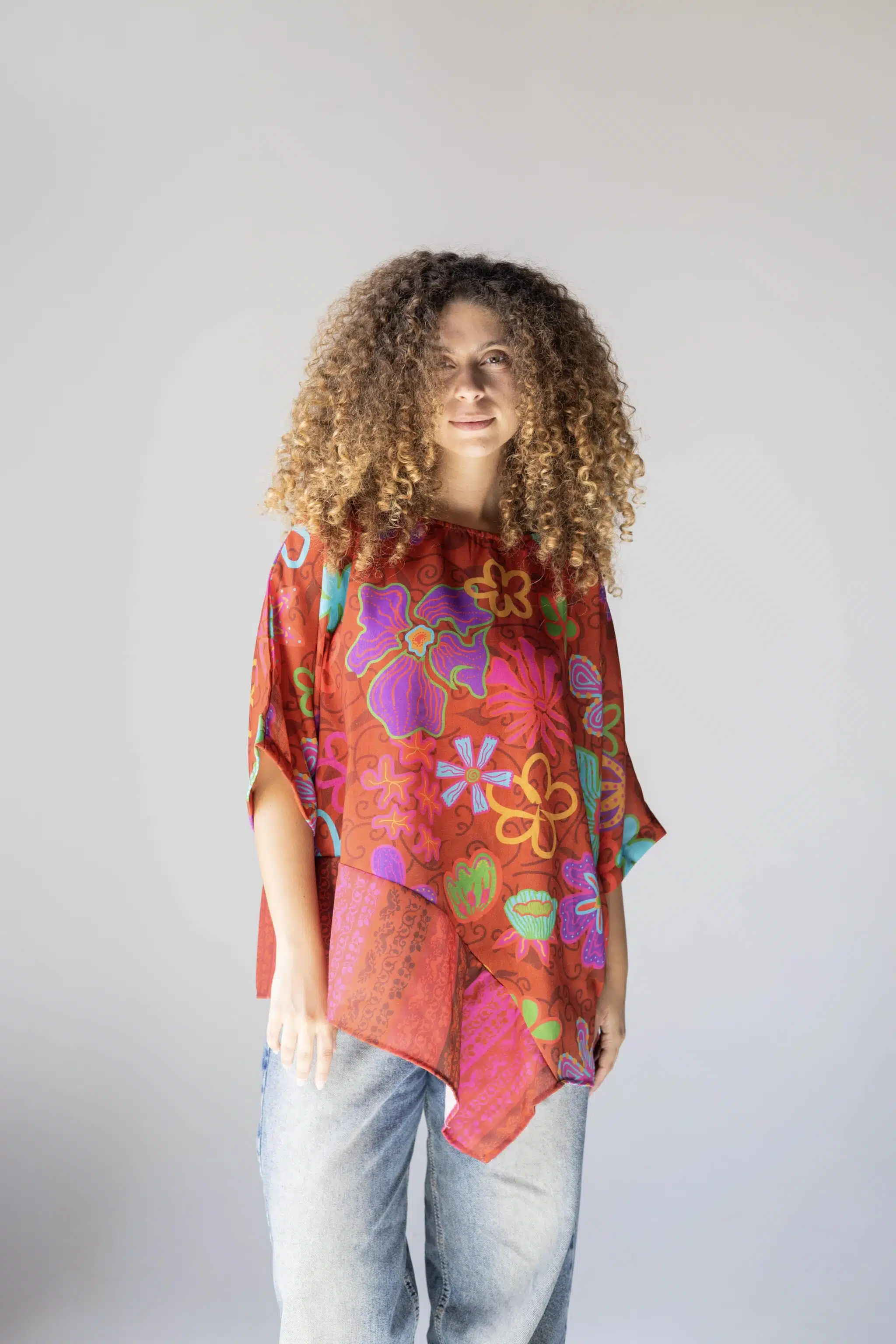 This captivating blouse boasts a playful round neckline and short sleeves. Adorned with a vibrant floral pattern with a bold red background.And an underlayer part at the bottom with a different print It invited a sense of cool and elegance. Its Breezy silhouette gives a boho vibe, feels like a moment of strolling through a blooming not to secret garden.