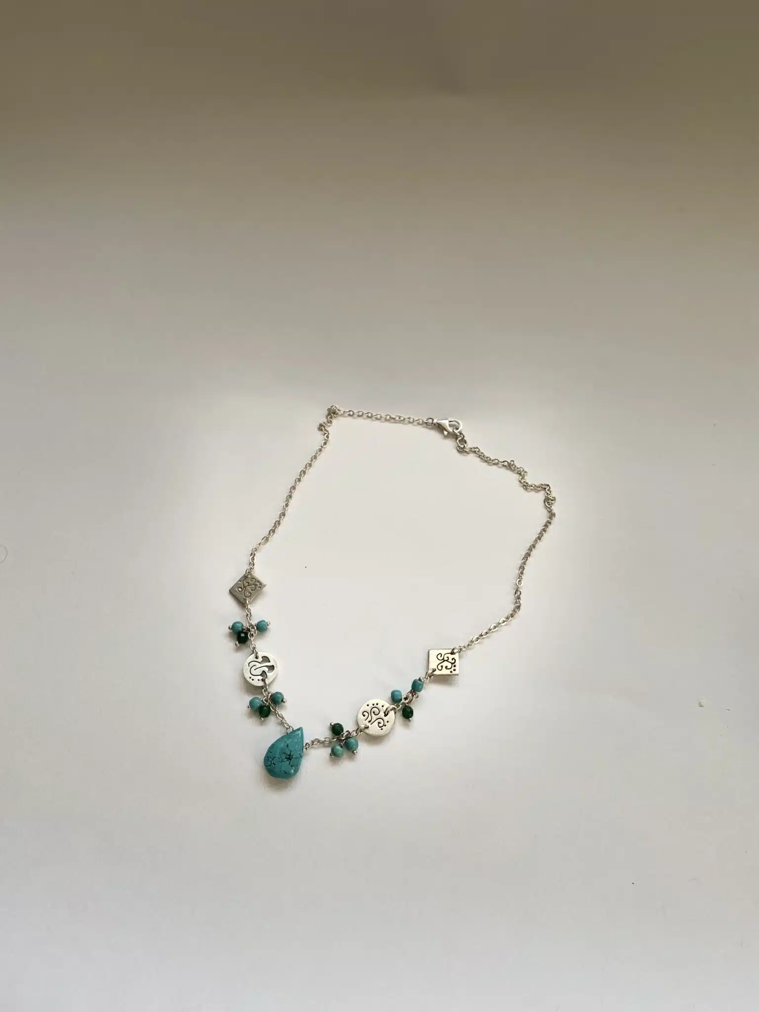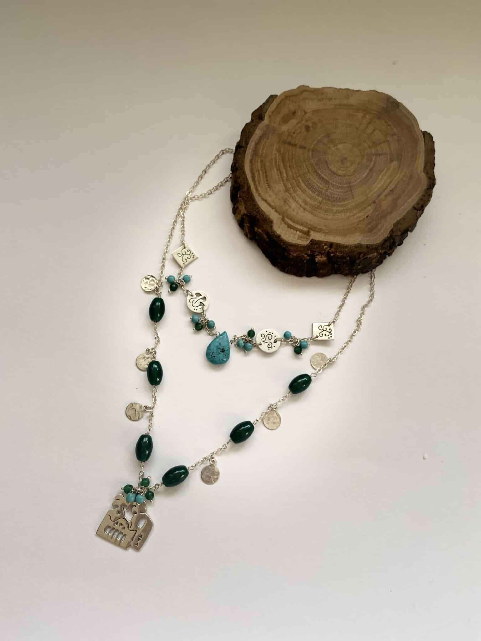 Two layers sterling silver 925 necklace with turquoise and green jade stones , with a small Nubian house pendant.