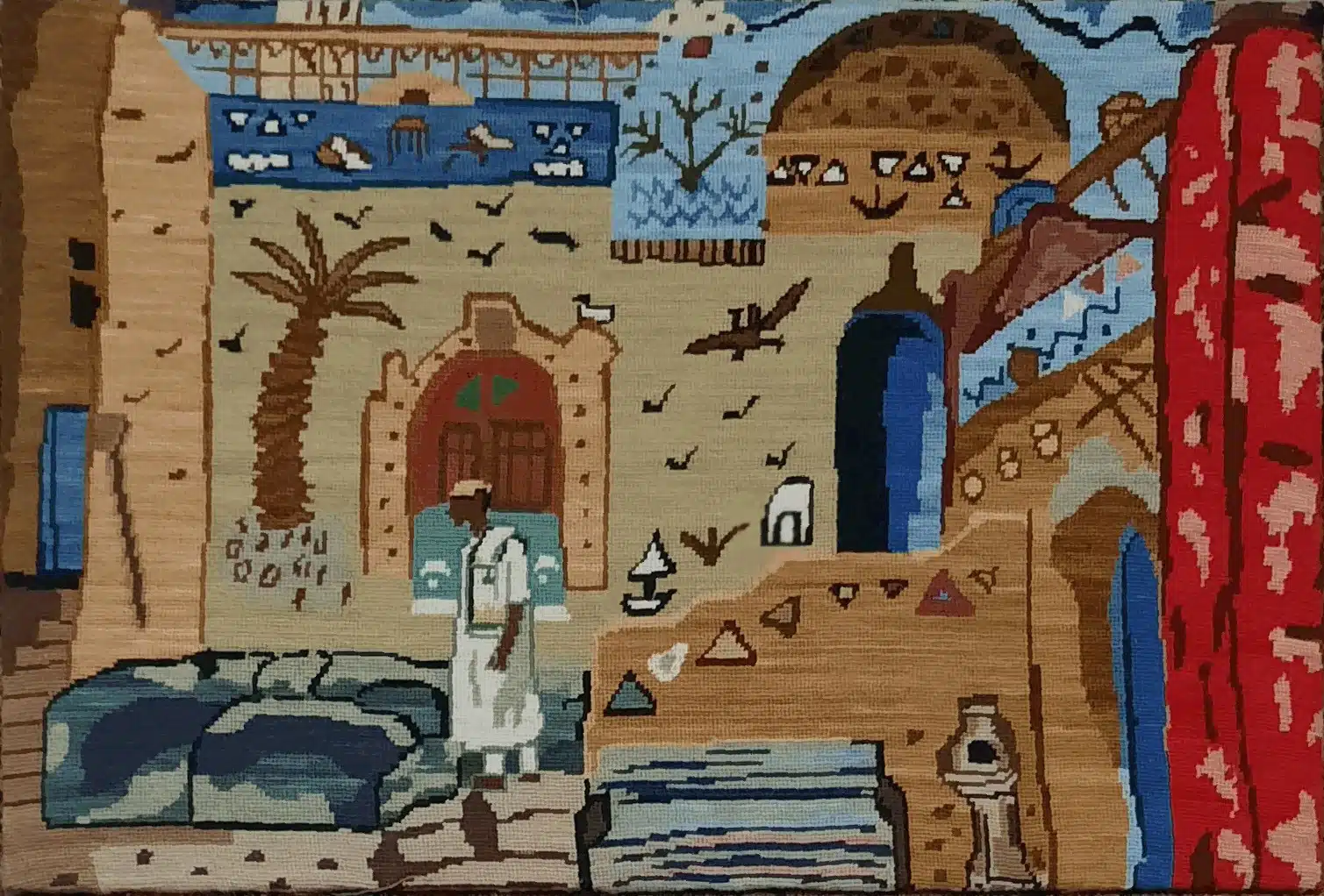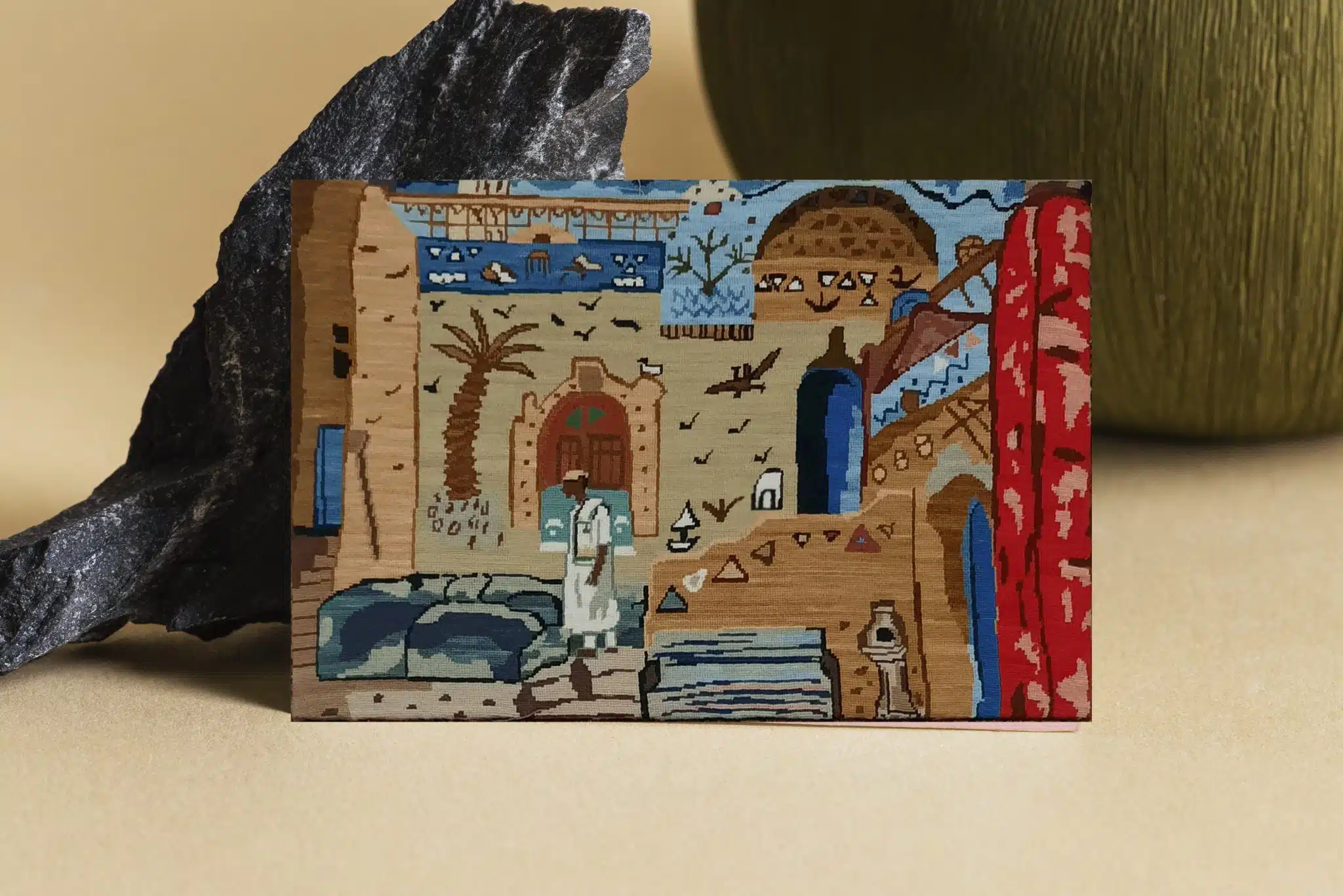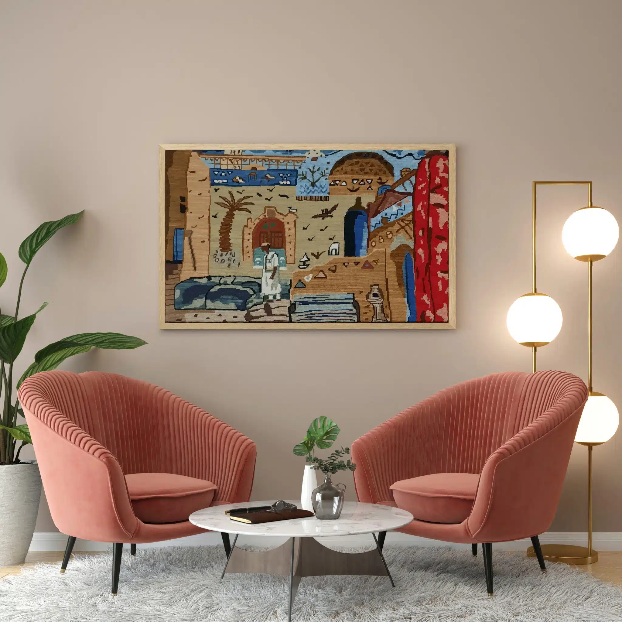 Step into a serene desert village with this intricately handcrafted canvas. Depicting a tranquil scene of traditional architecture, palm trees, and cultural life, this piece captures the beauty of heritage and daily life in warm, earthy tones. The meticulous details and vibrant colors tell a story of connection to the land and its people, making it a unique addition to your home or office décor.