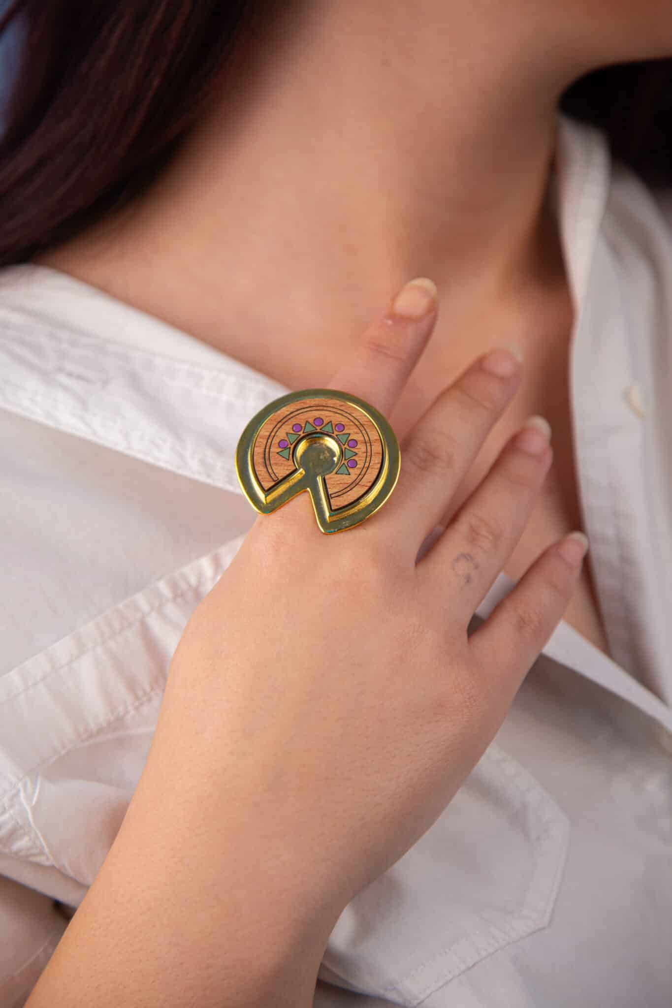 Made of Brass gold-plated with Finish wood and acrylic color.