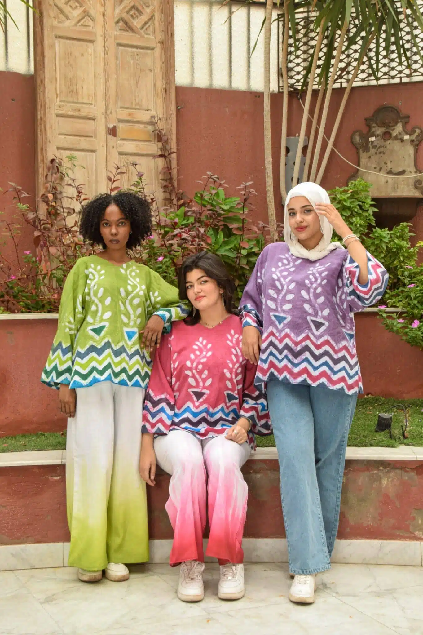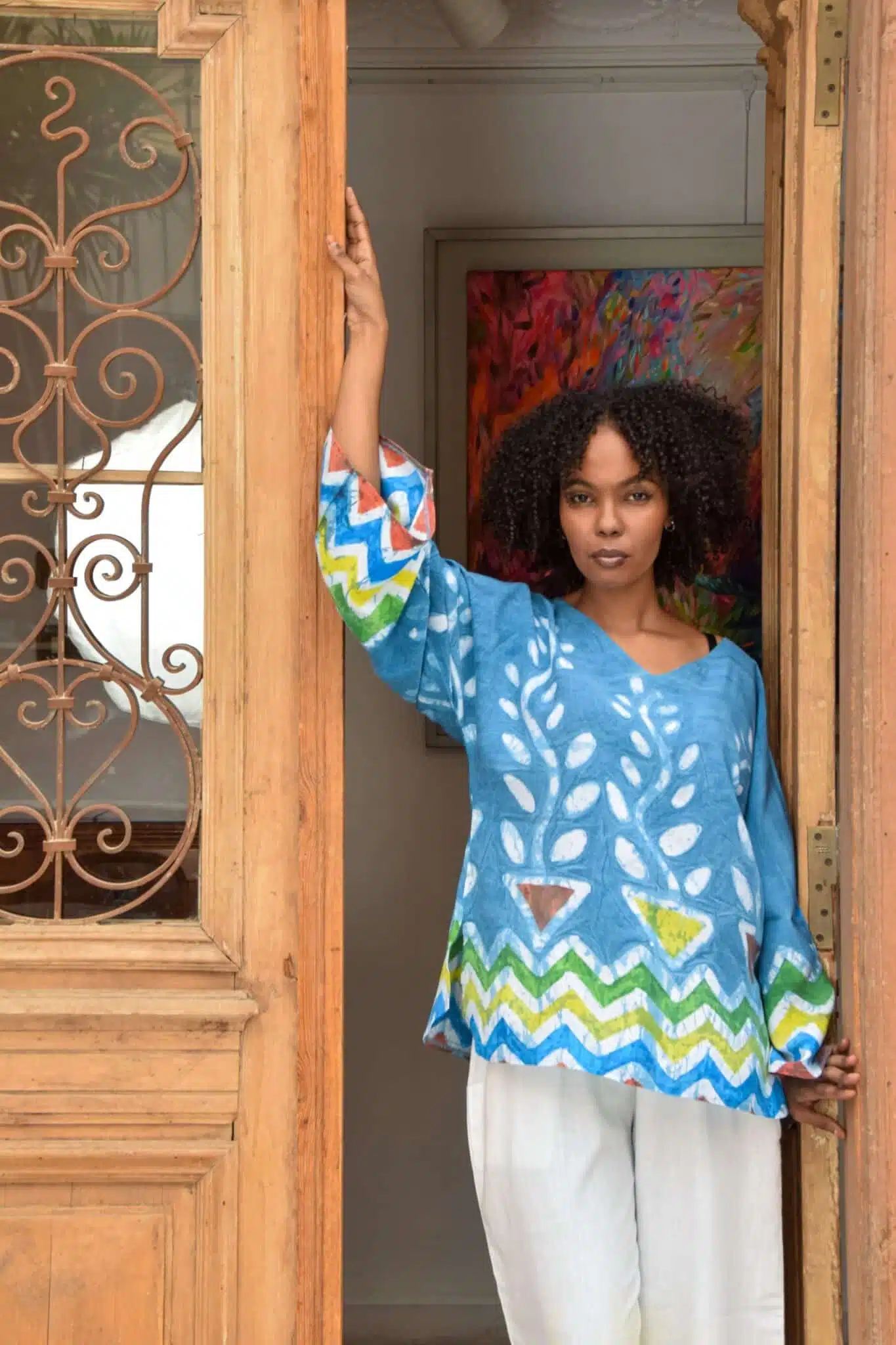بلوزة زرع نوبي .( بلوزة بكم مستوحاه من الفن النوبى مرسومة ومصبوغة يدويا بطريقة الباتيك ، بصبغات صديقة للبيئة ،ثابته ، وقماش طبيعي ..