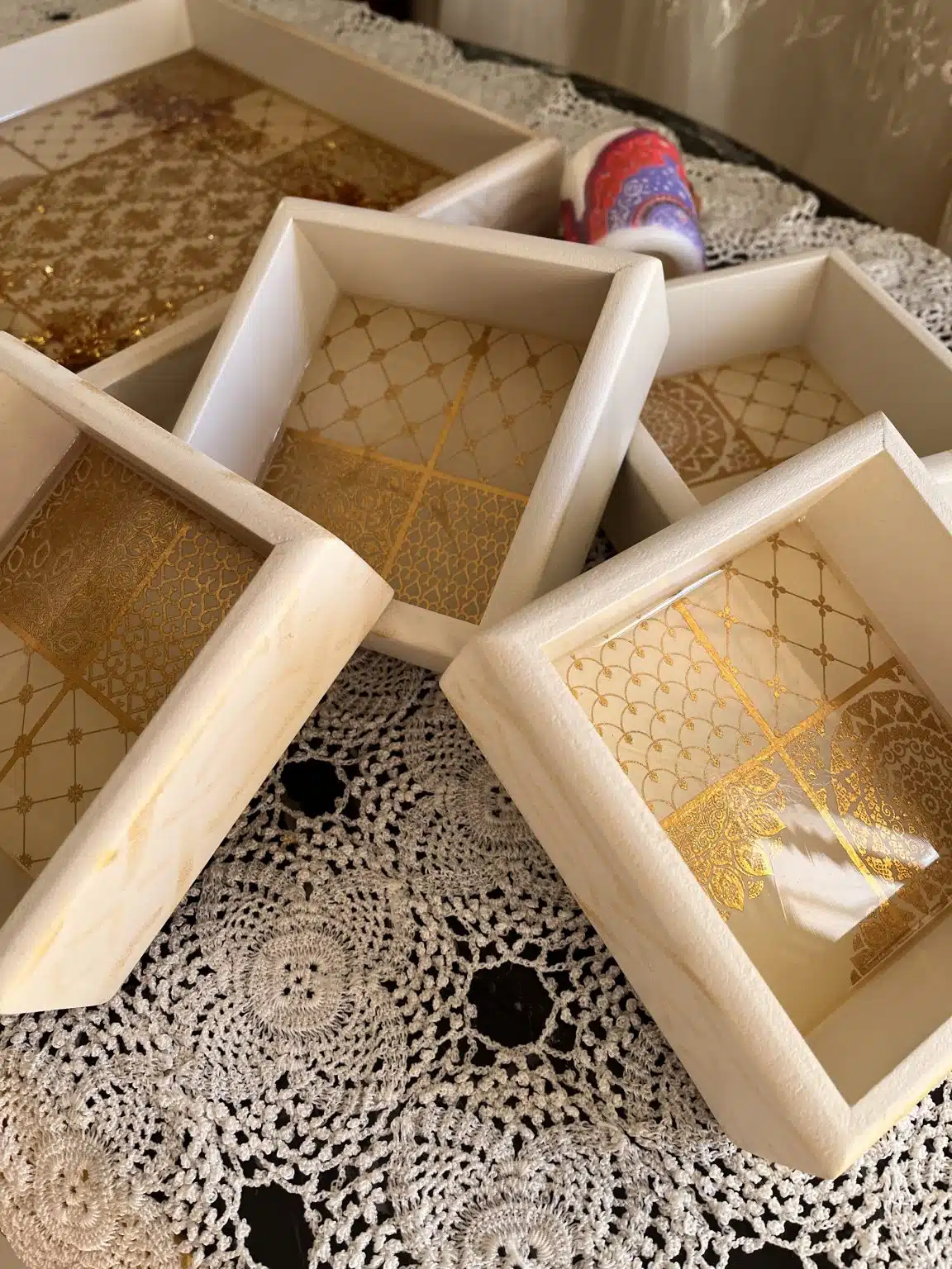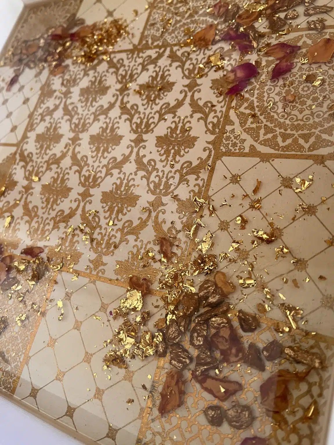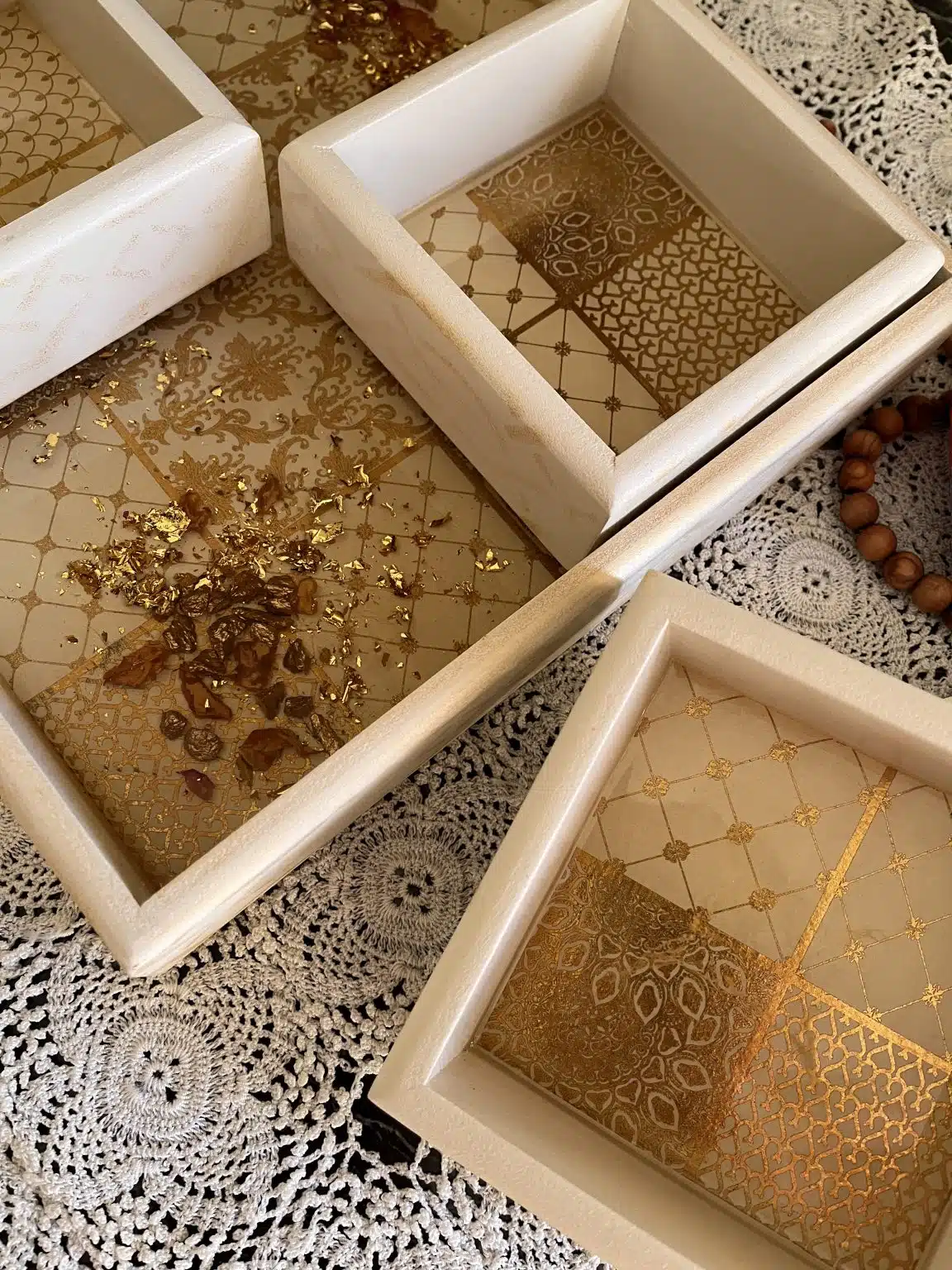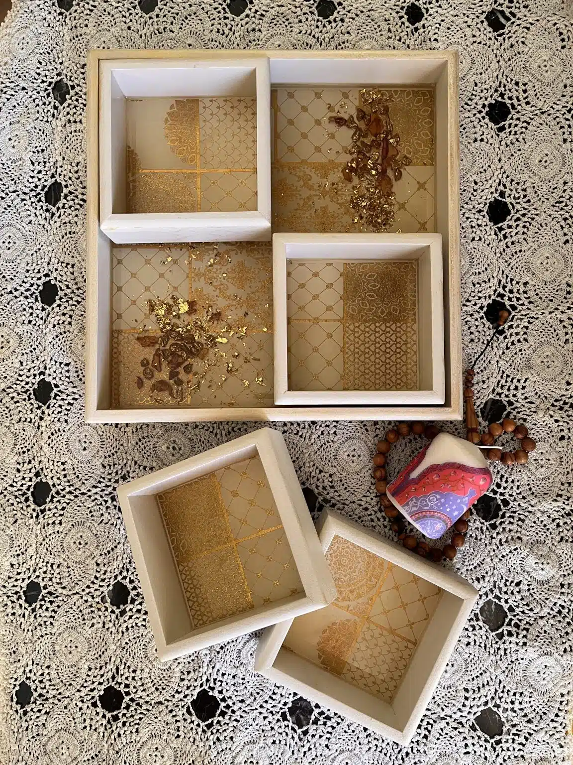 Nuts wooden tray with 4 plates, painted with acrylic colors and coated with a heavy layer of resin, inlaid with gold leaves, dried roses and ornamental stones.