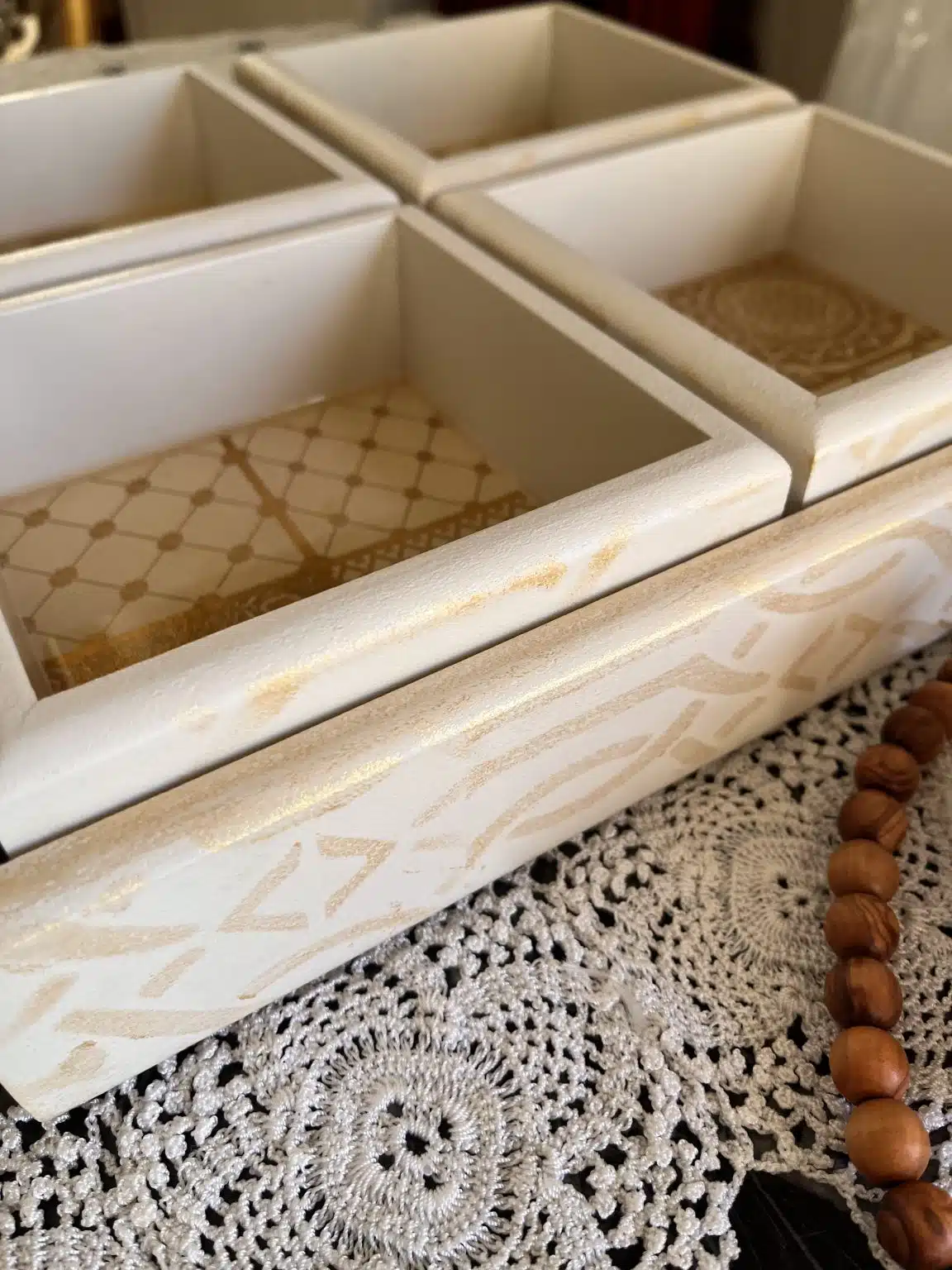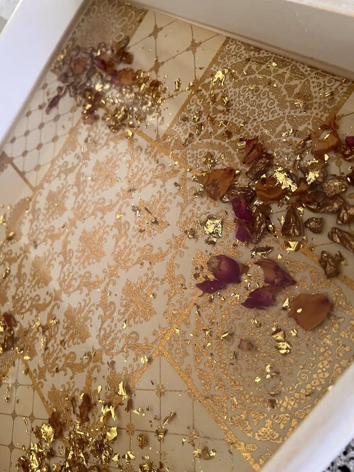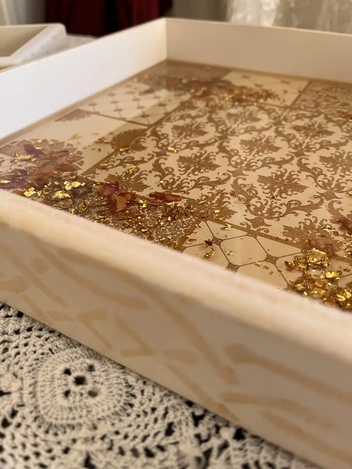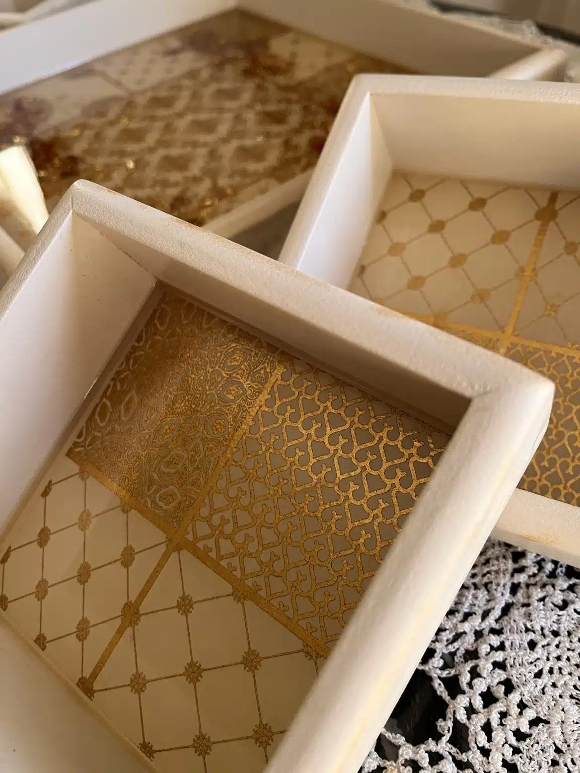 Nuts wooden tray with 4 plates, painted with acrylic colors and coated with a heavy layer of resin, inlaid with gold leaves, dried roses and ornamental stones.