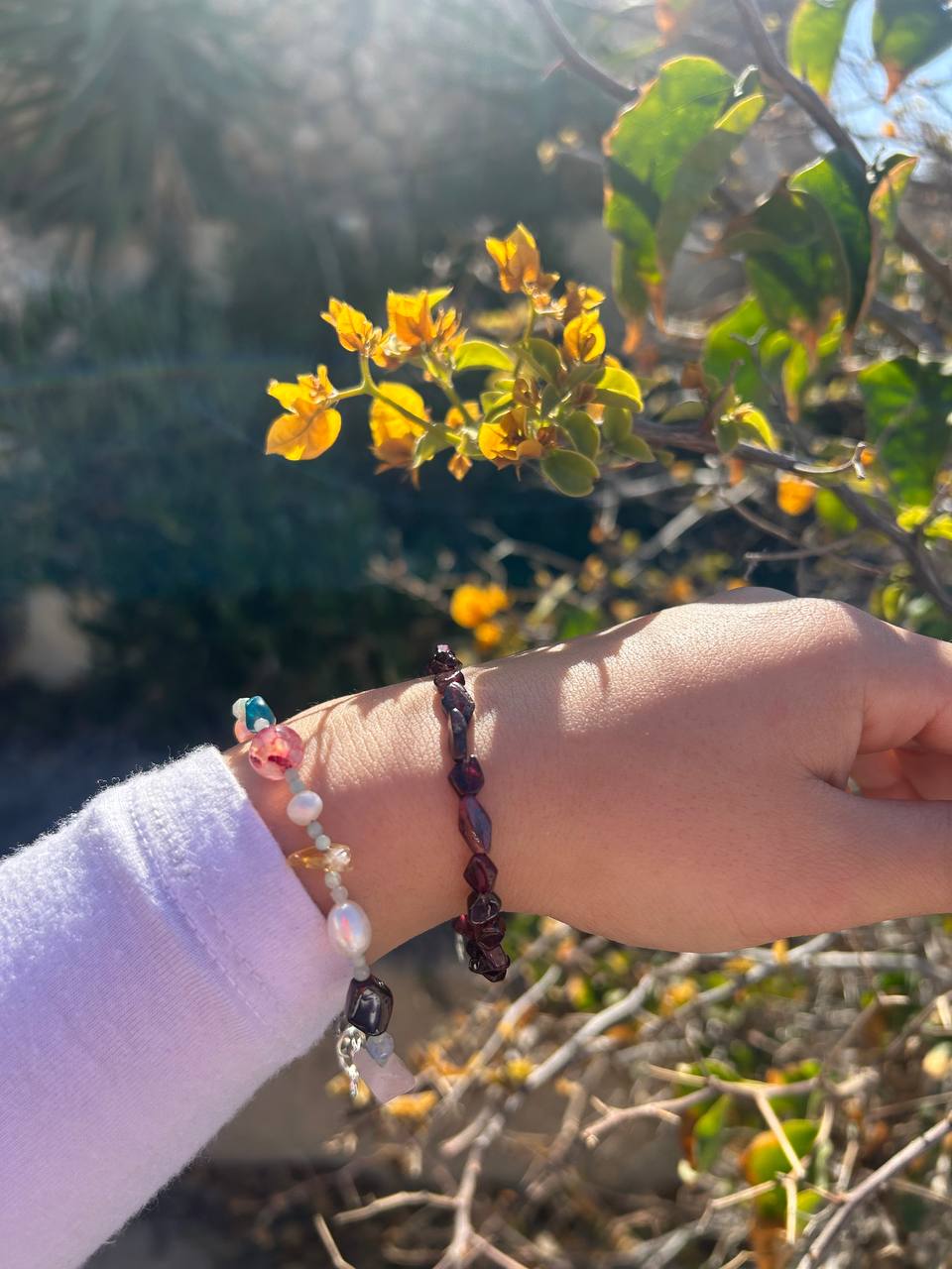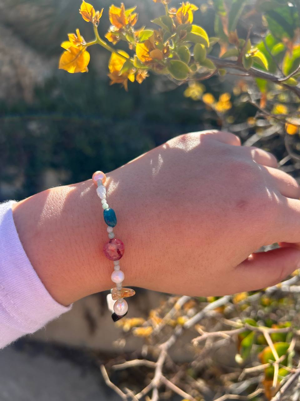 Braclete contains mixed colorful stones and pearls with different cuts and textures