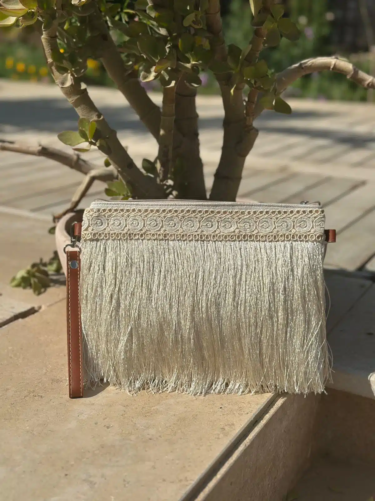 Off white clutch decorated with an embroidered strap and long shimmering tassels.