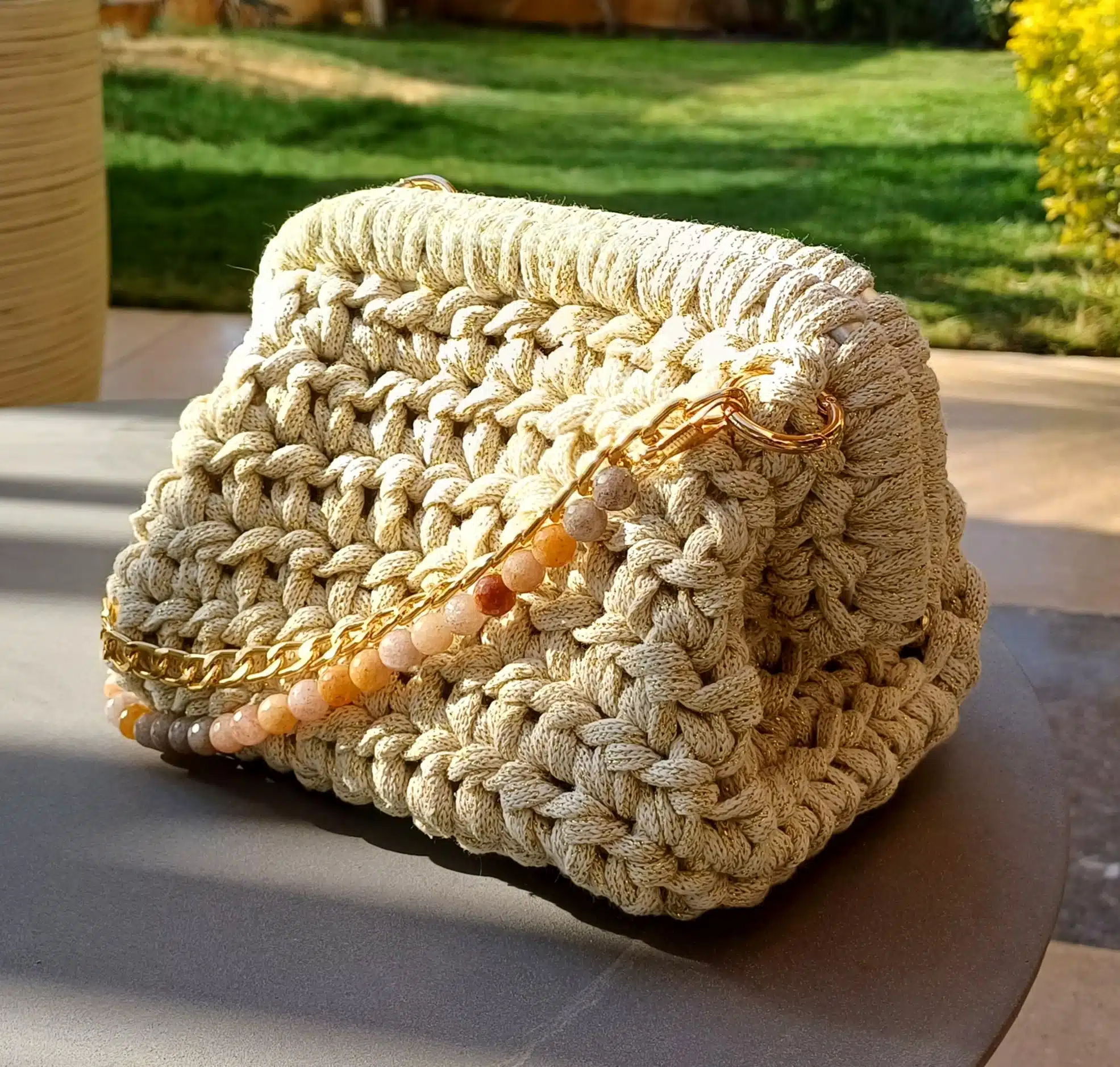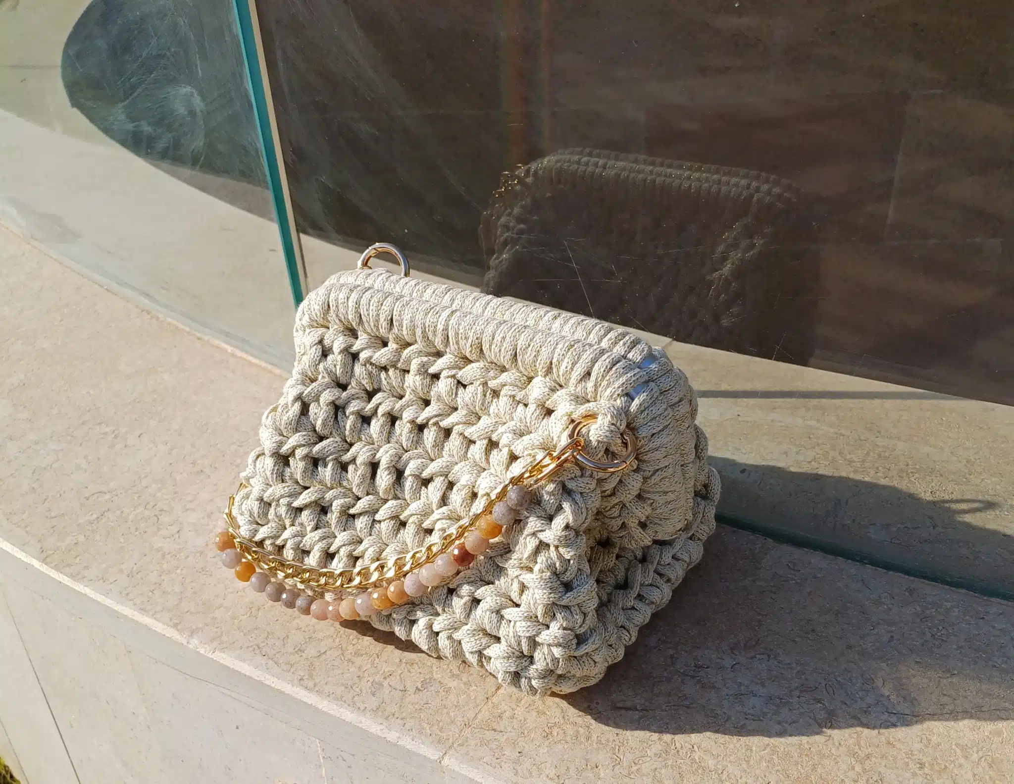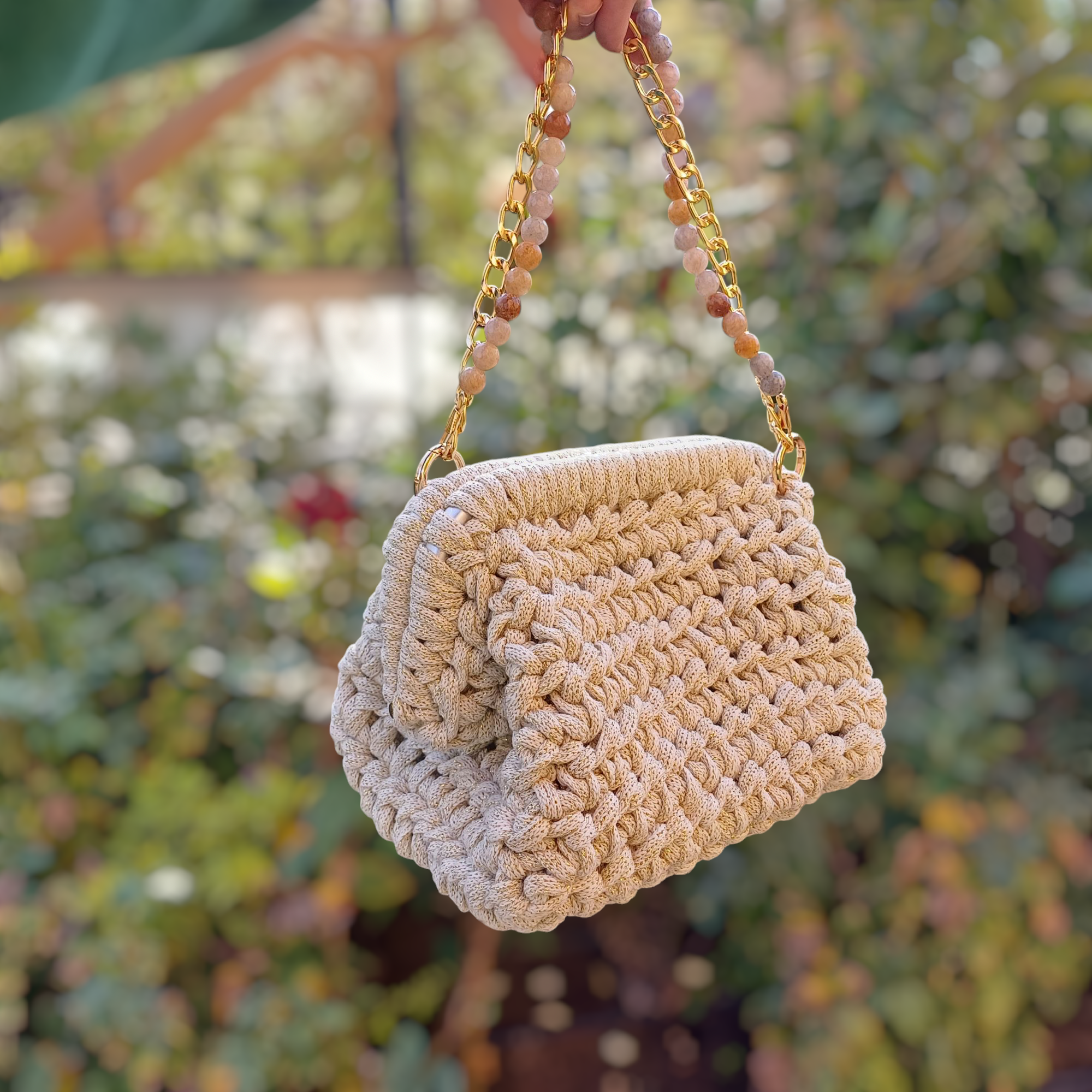 Off white crochet clutch/bag with sparkling golden touch. With a double handle in the form of a golden chain and a beaded handle. Will be great in afternoon and evening outings.