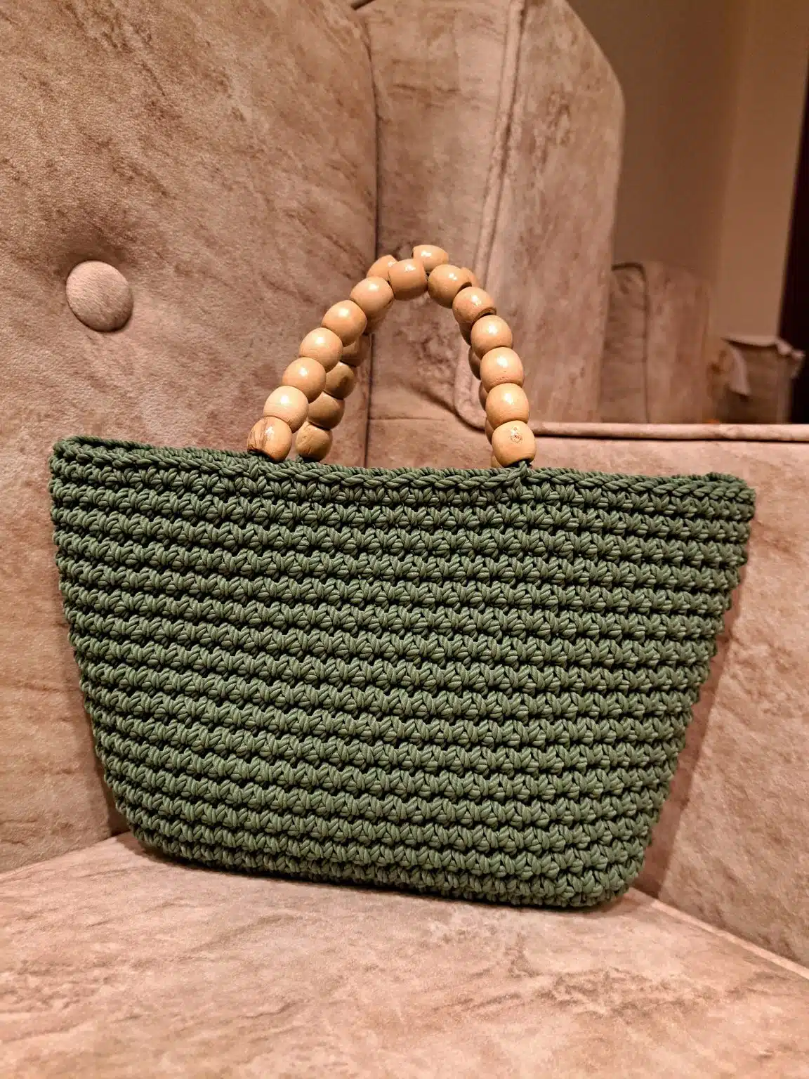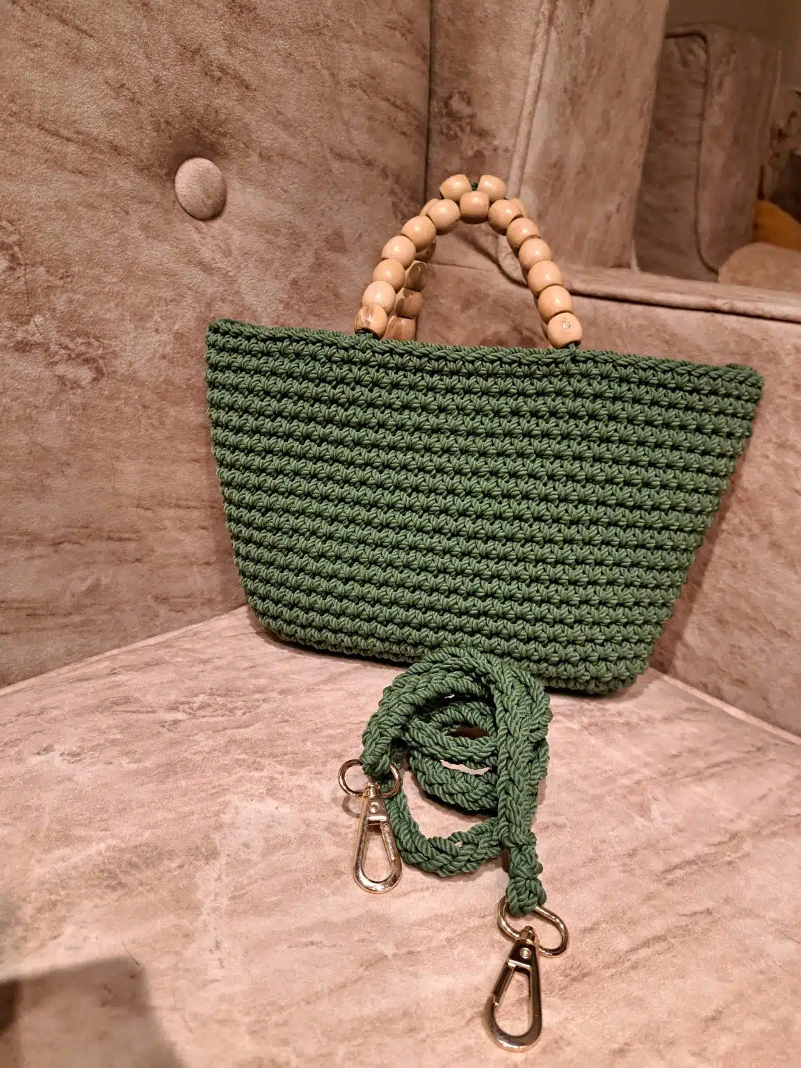 Handmade macrame basket bag. It has 2 golden magnetic locks, with portable strape. it has a wooden hand.